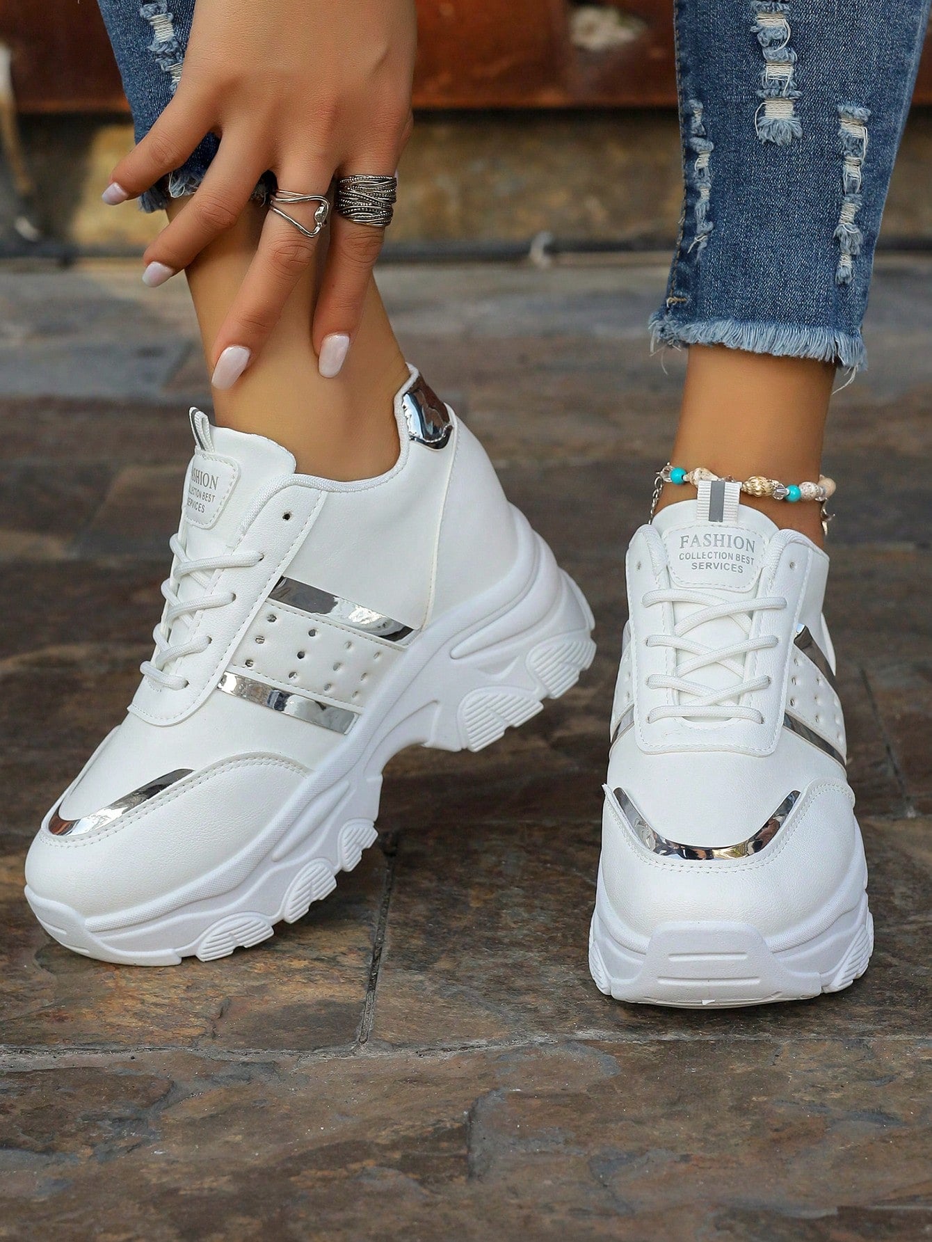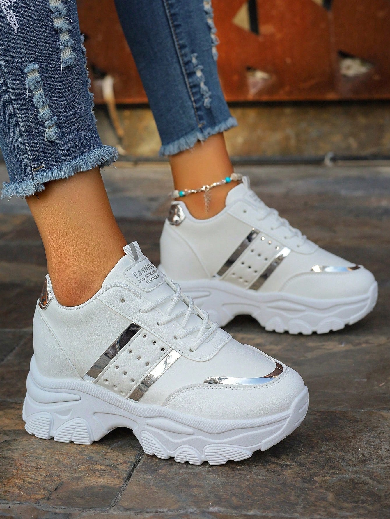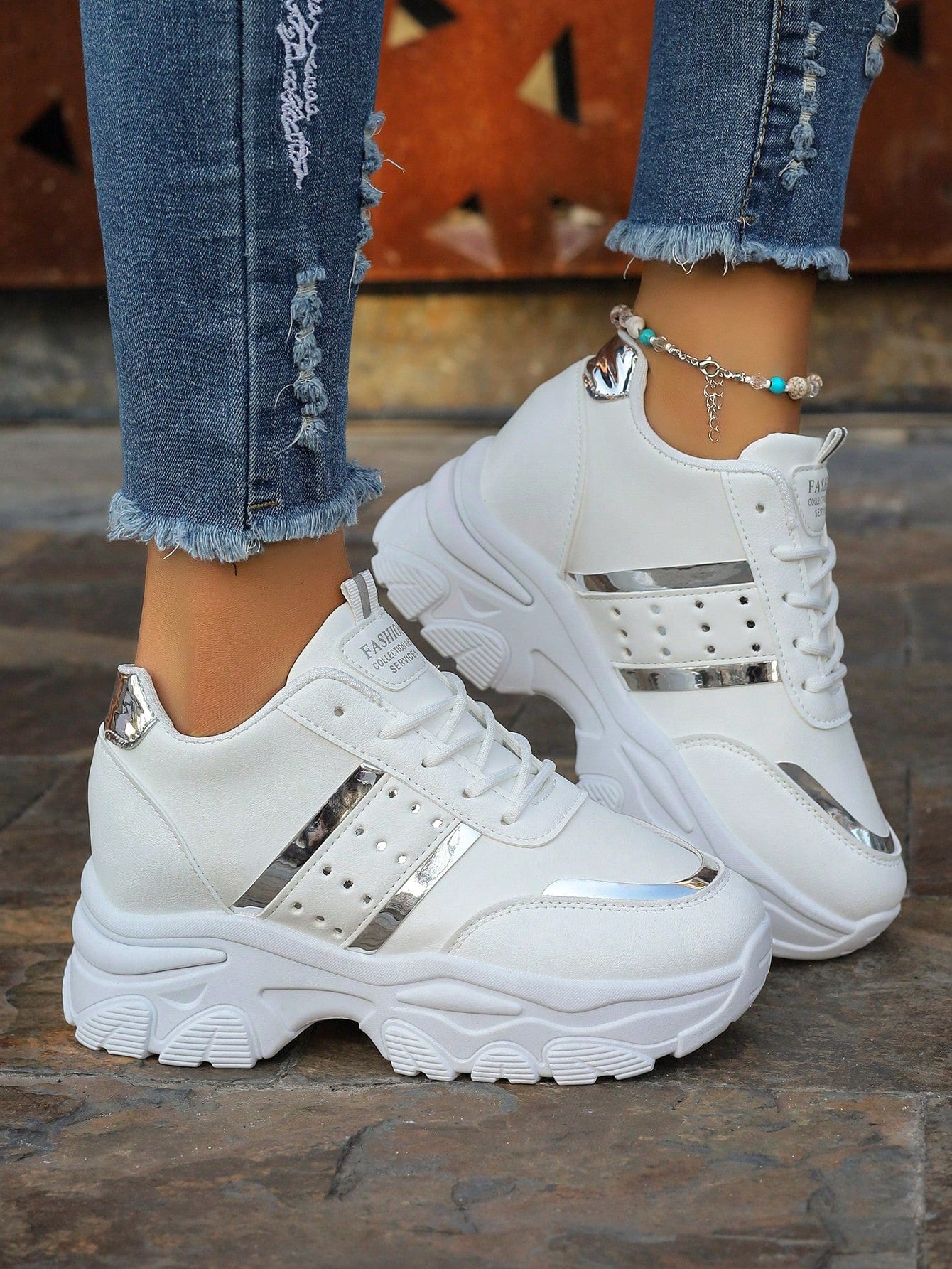 زوج واحد من الأحذية الرياضية النسائية البيضاء الجلدية الكاجوال ذات النعل السميك والمنصة، مع نعل داخلي مخفي.
