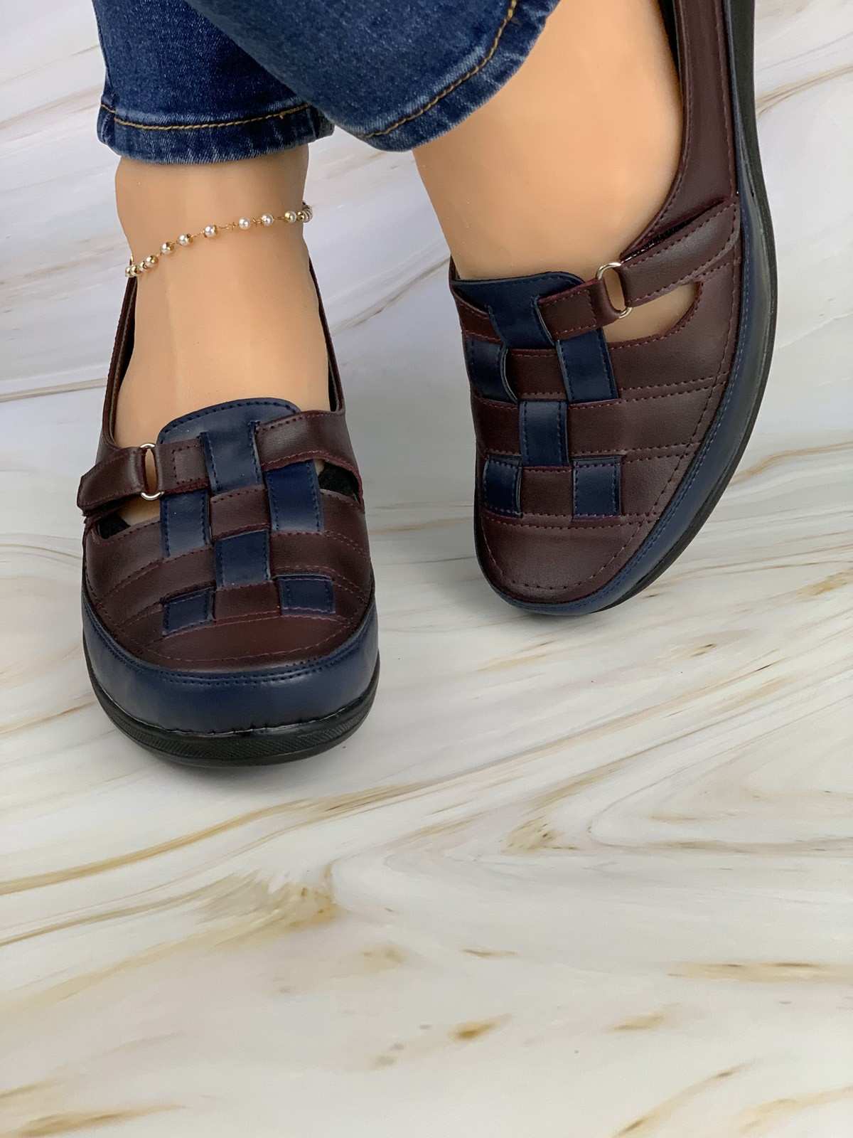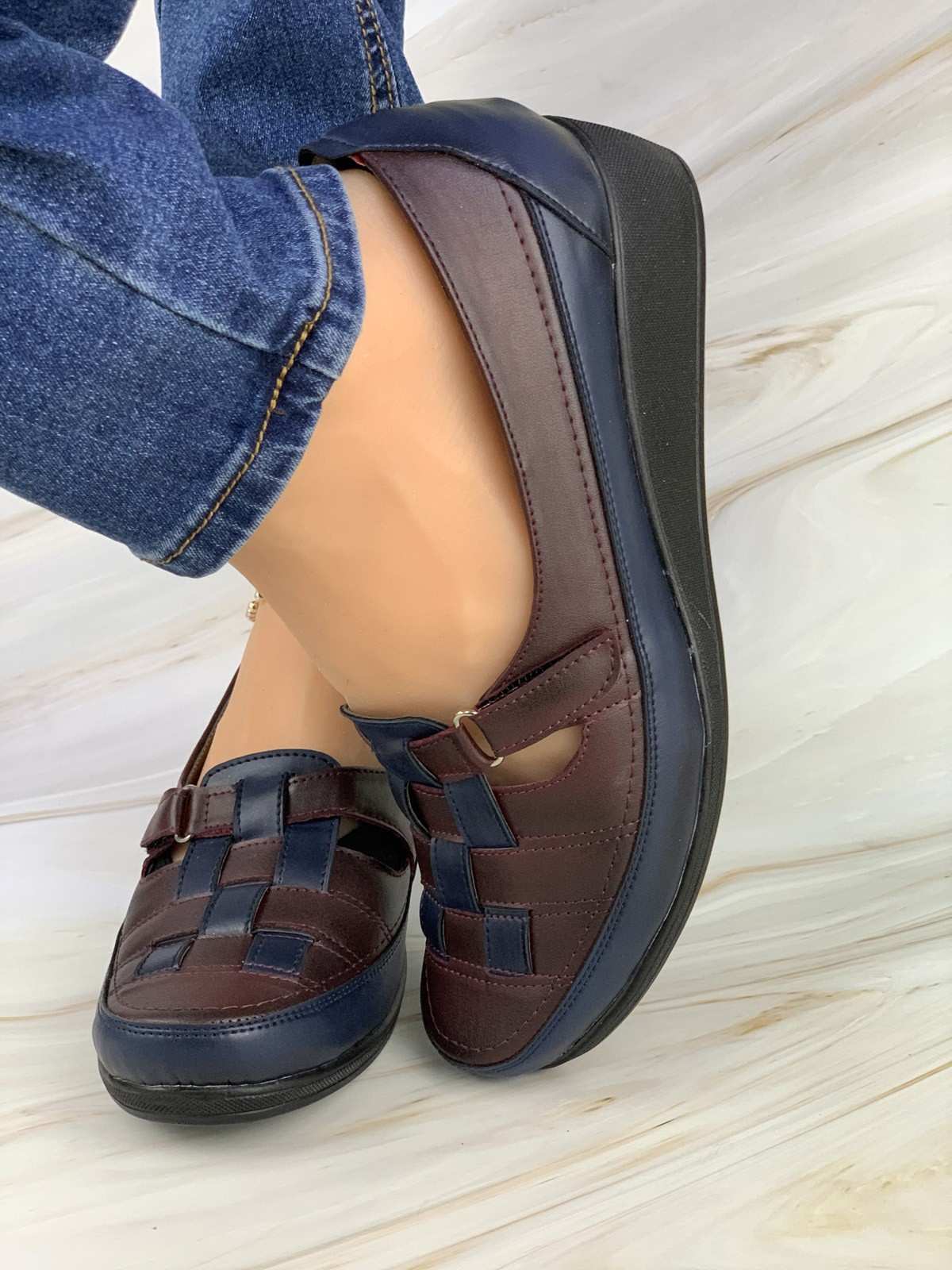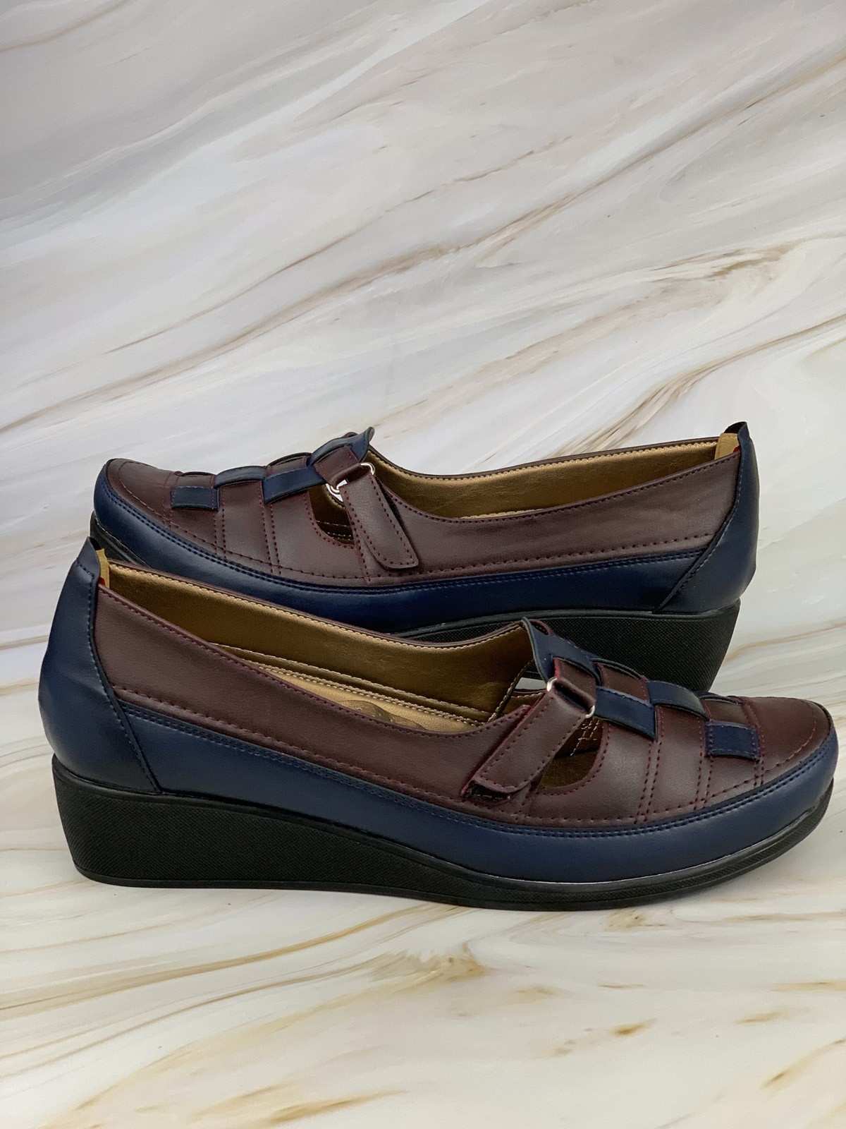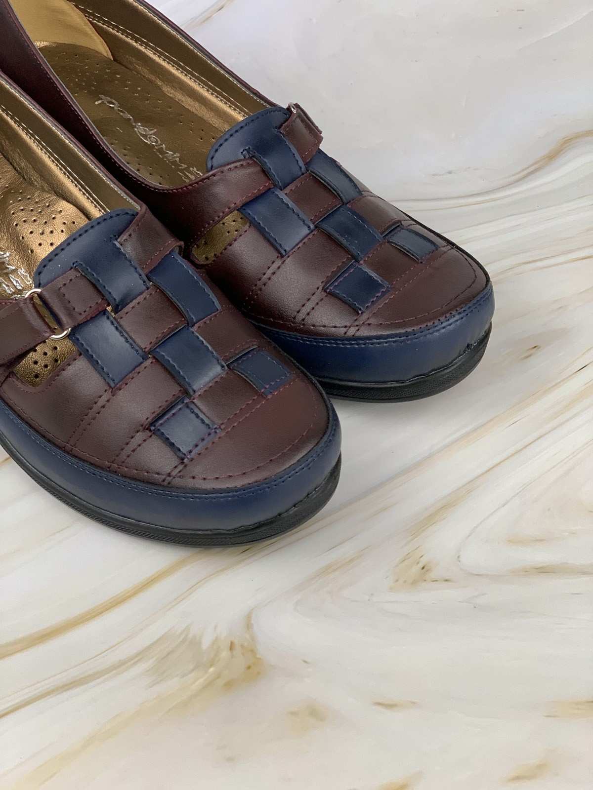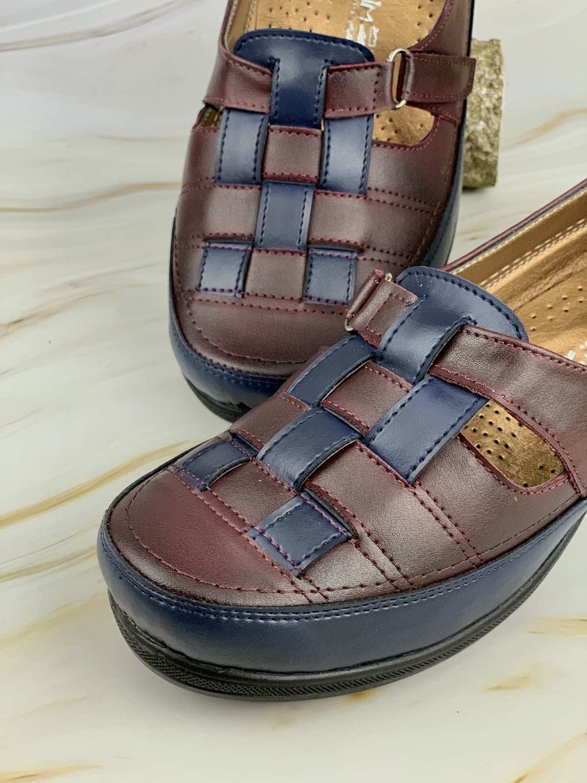 حذاء نسائي مفتوح مريح جلد أحمر وكحلي مع سيور جلدية، كعب طبي متوسط