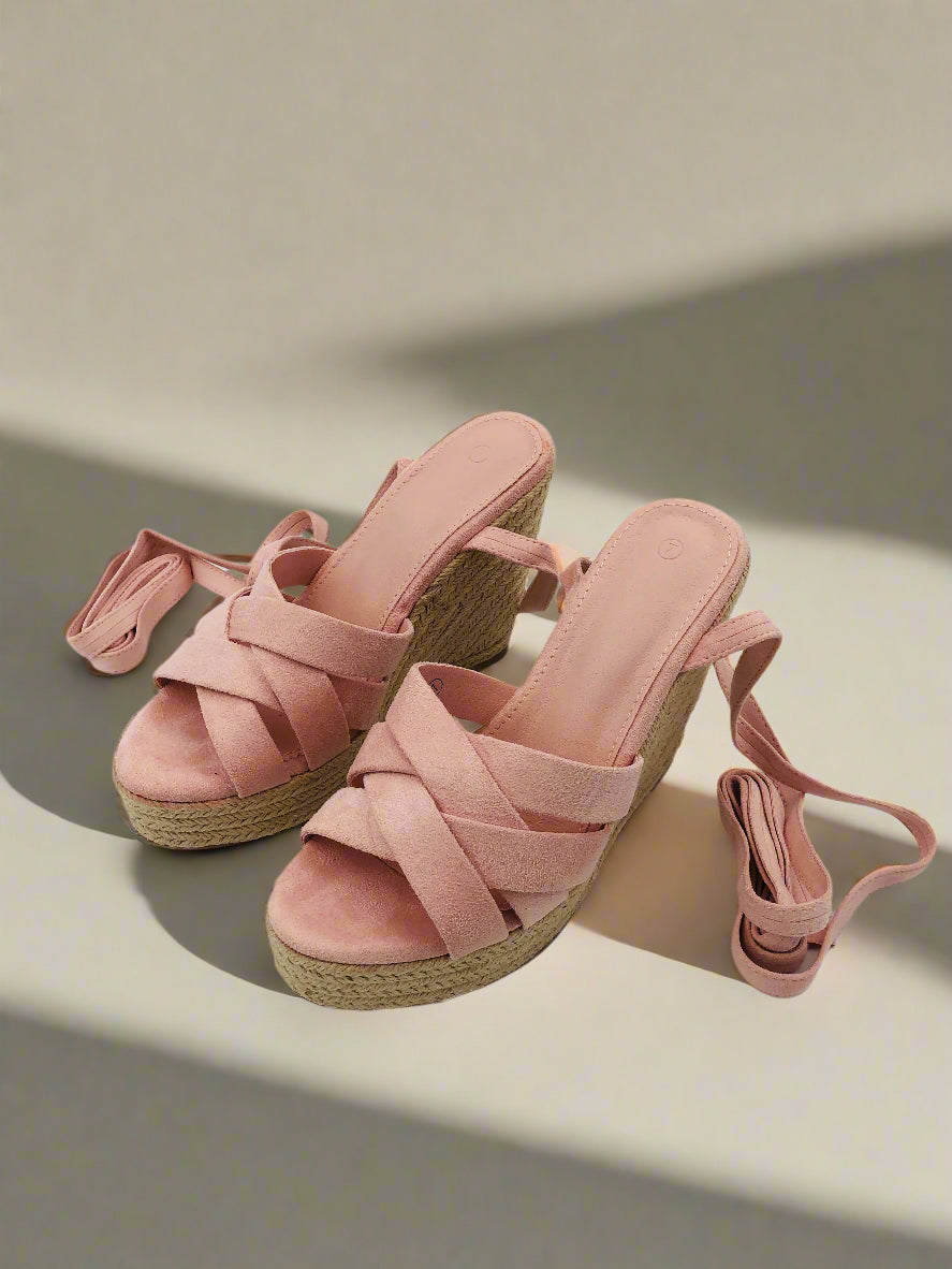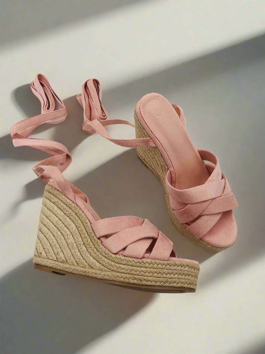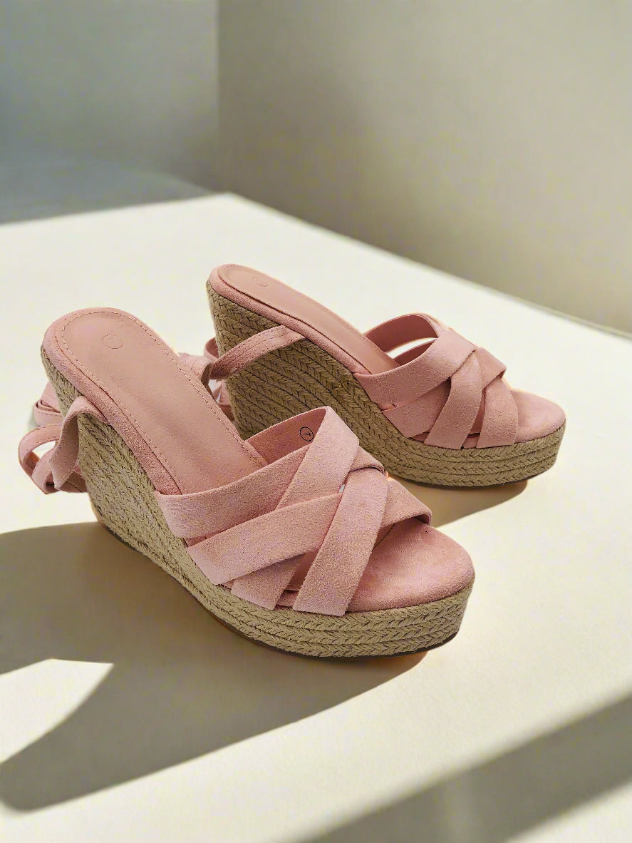 صنادل إسبادريل سميكة وردية للنساء، مفتوحة من الأمام، وأربطة متقاطعة، مع كعب منسوج وتصميم حزام خلفي متقاطع لفصل الصيف.