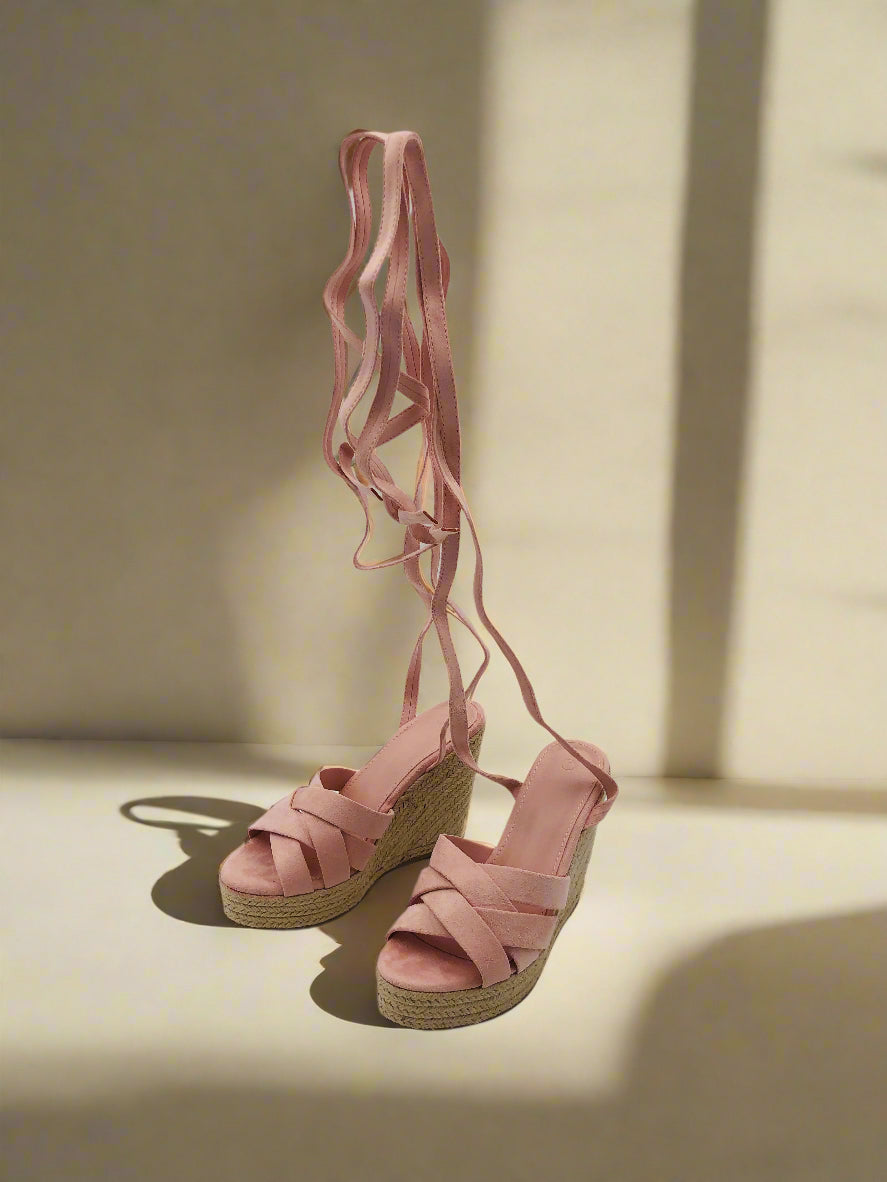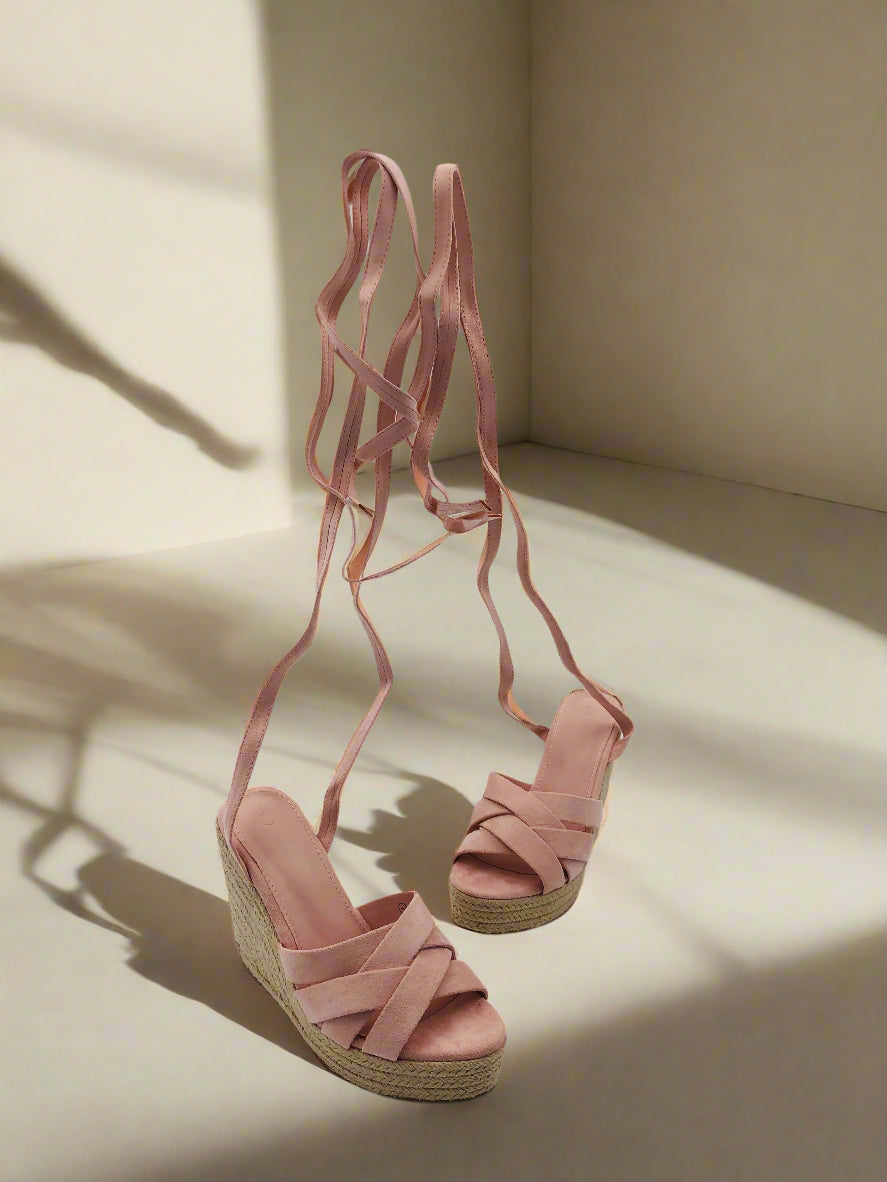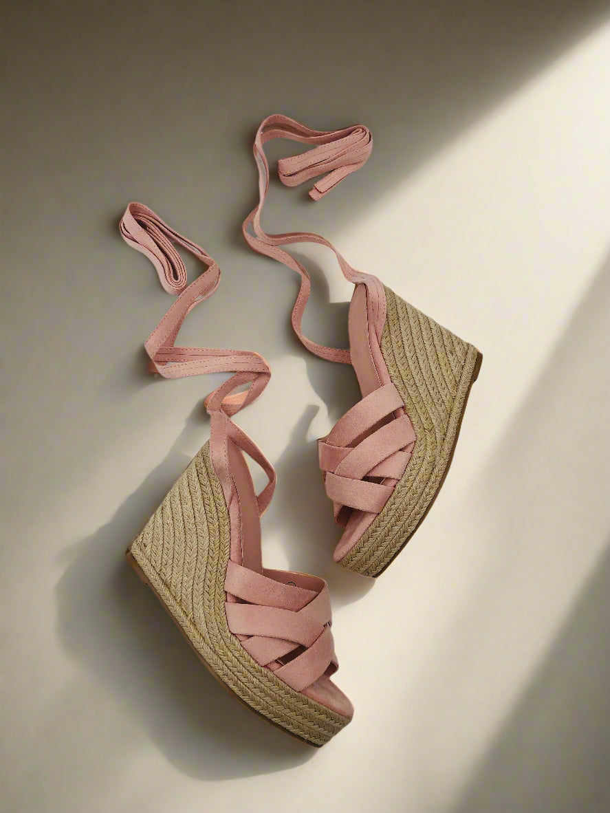 صنادل إسبادريل سميكة وردية للنساء، مفتوحة من الأمام، وأربطة متقاطعة، مع كعب منسوج وتصميم حزام خلفي متقاطع لفصل الصيف.