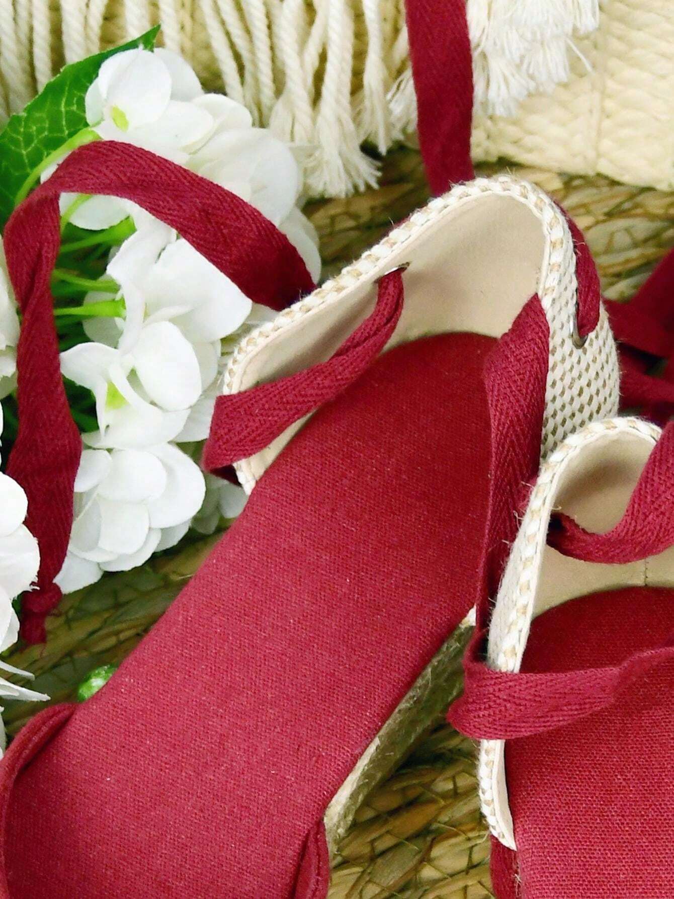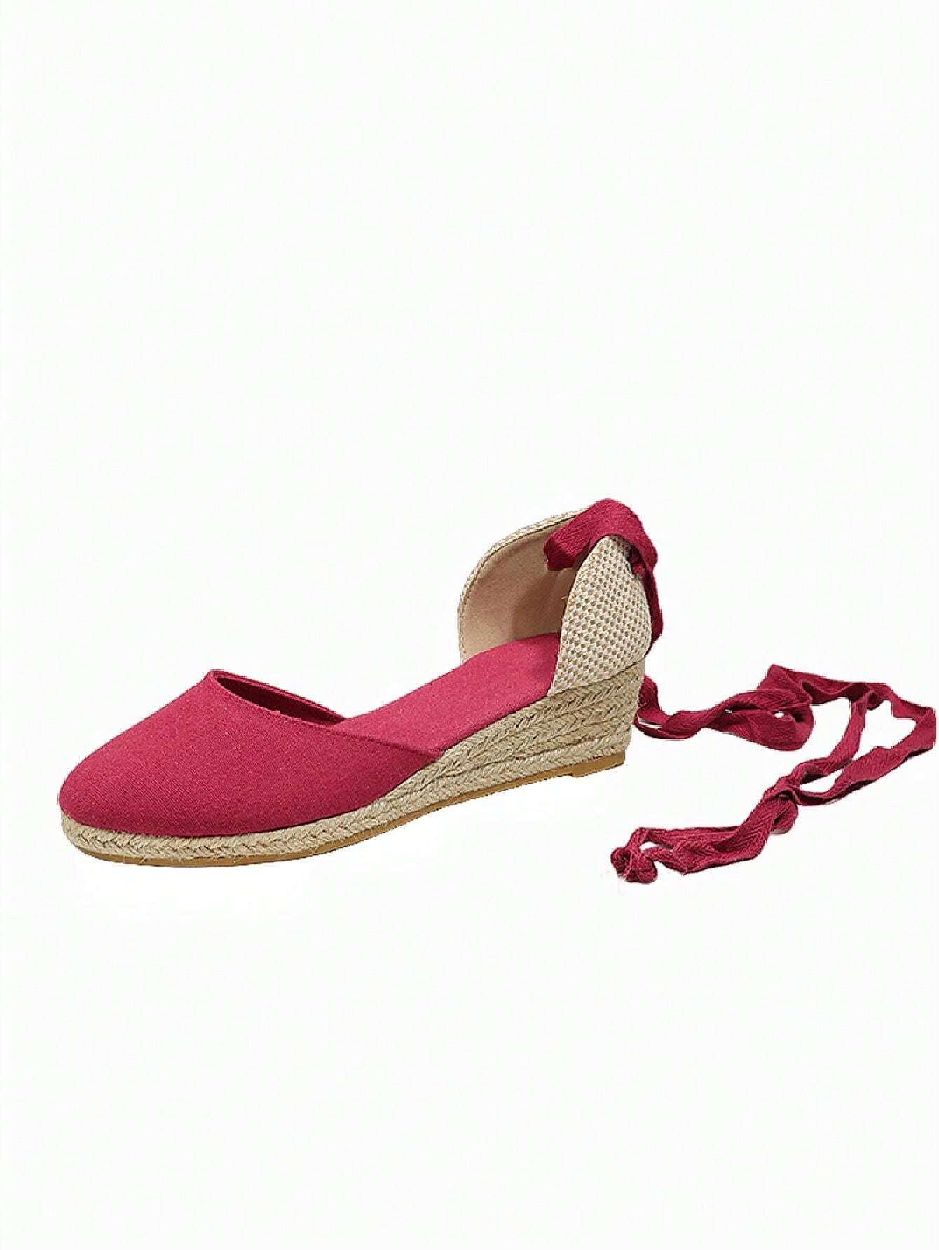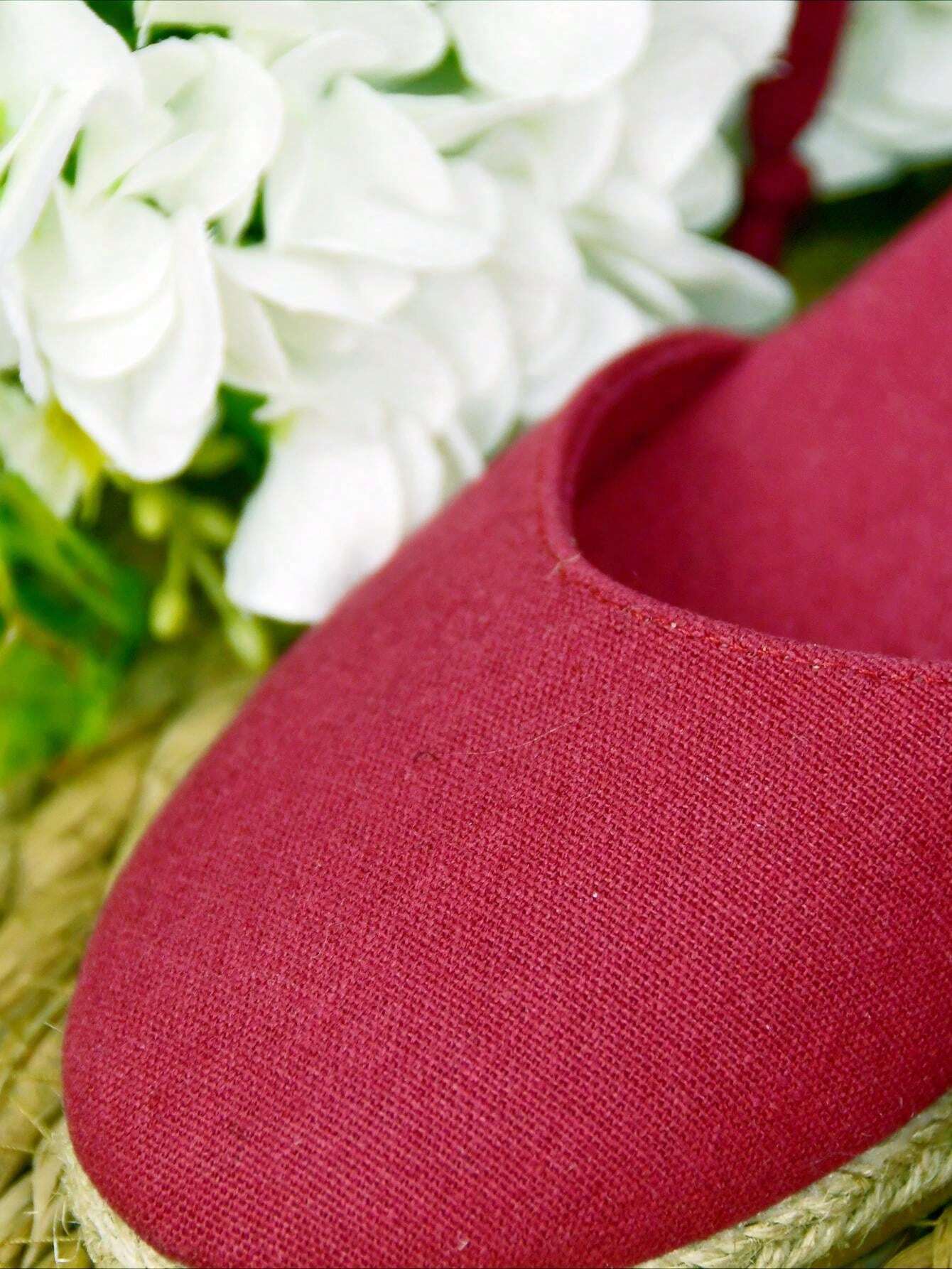 women Women's Red Wedge Heel Ballet Style Shoess With Braided Jute Platform And Ankle Tie Strap