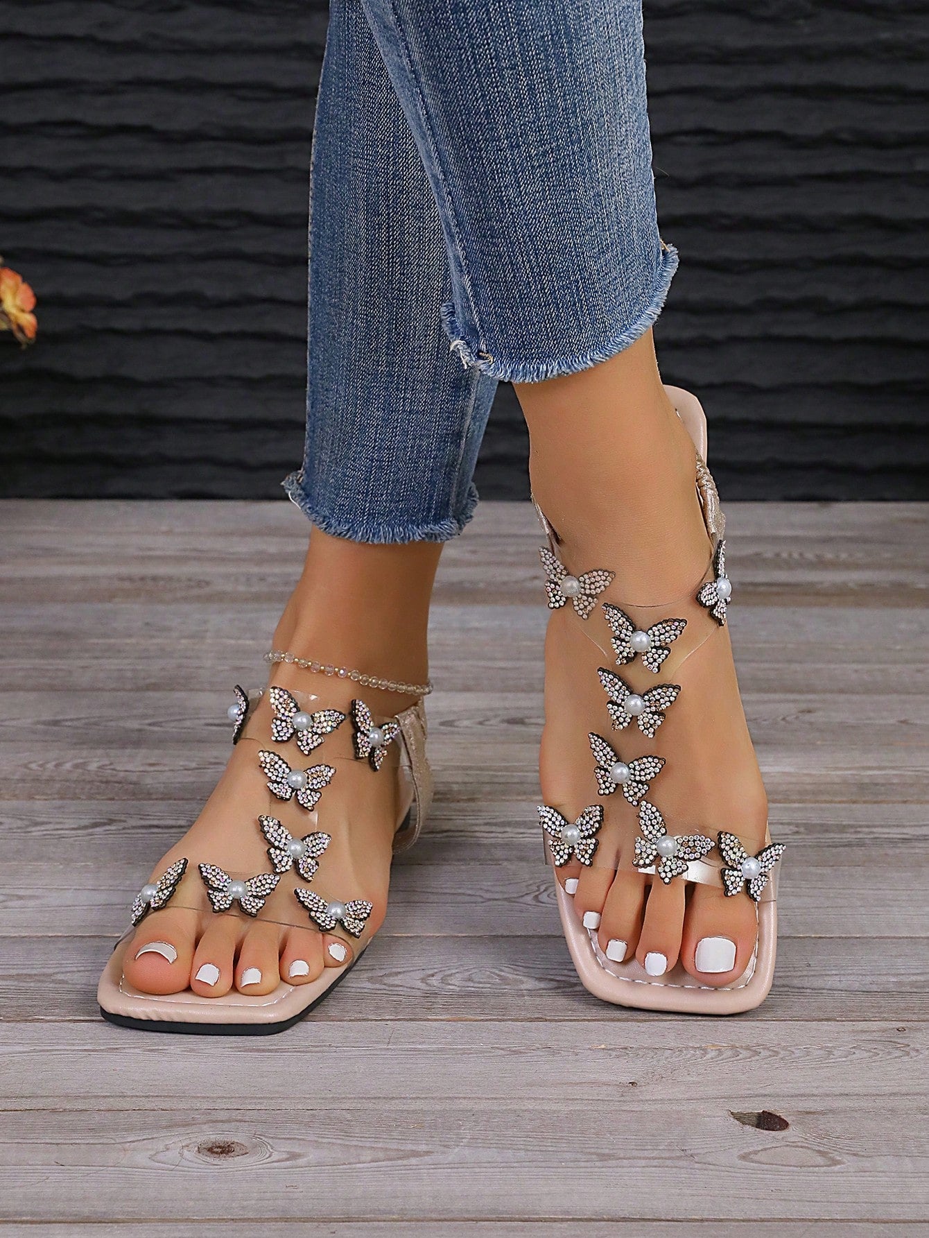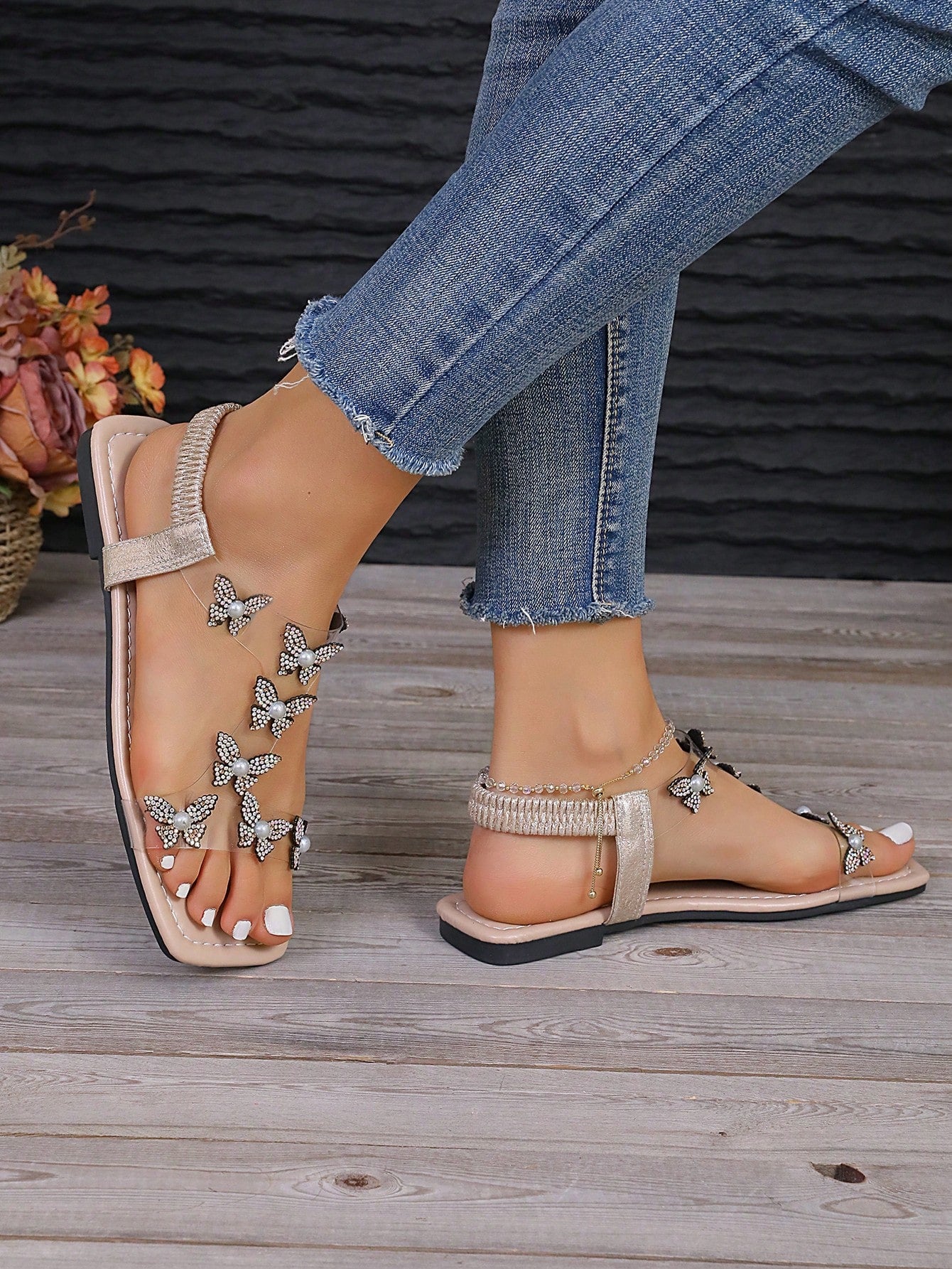 زوج واحد من الصنادل الصيفية المسطحة المريحة والعصرية متعددة الاستخدامات بتصميم اللؤلؤ والفراشات الفاخرة