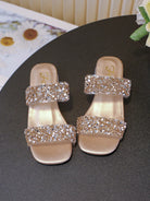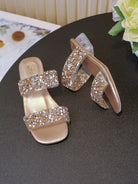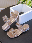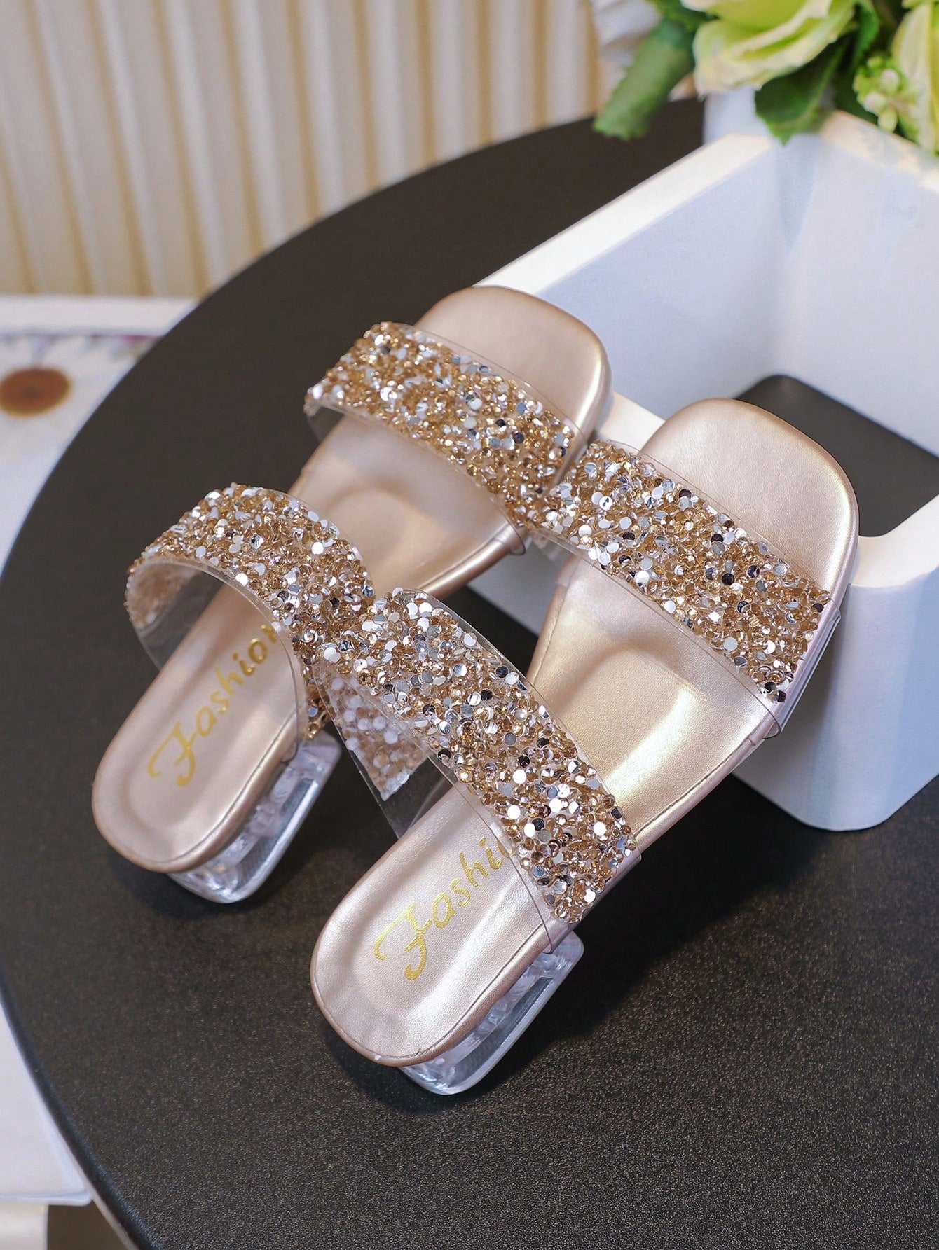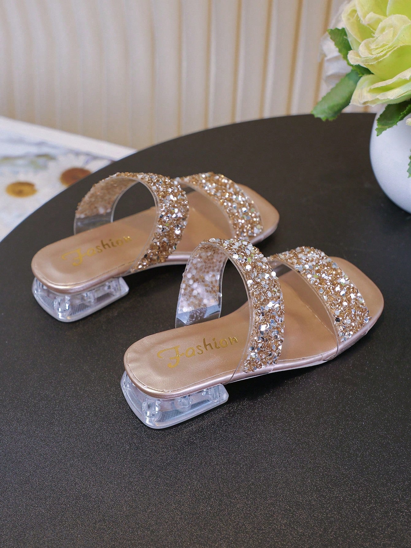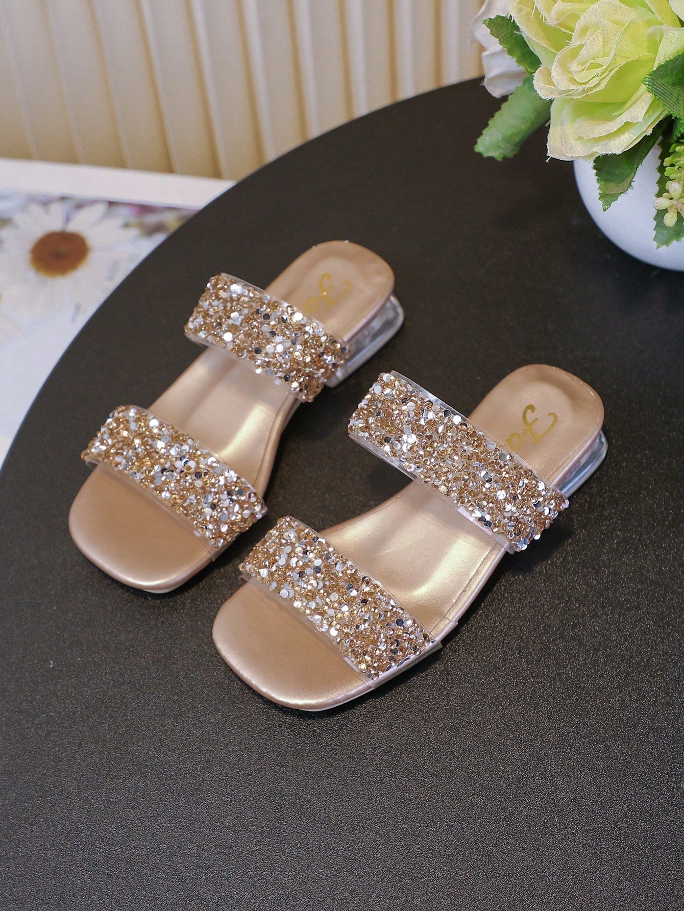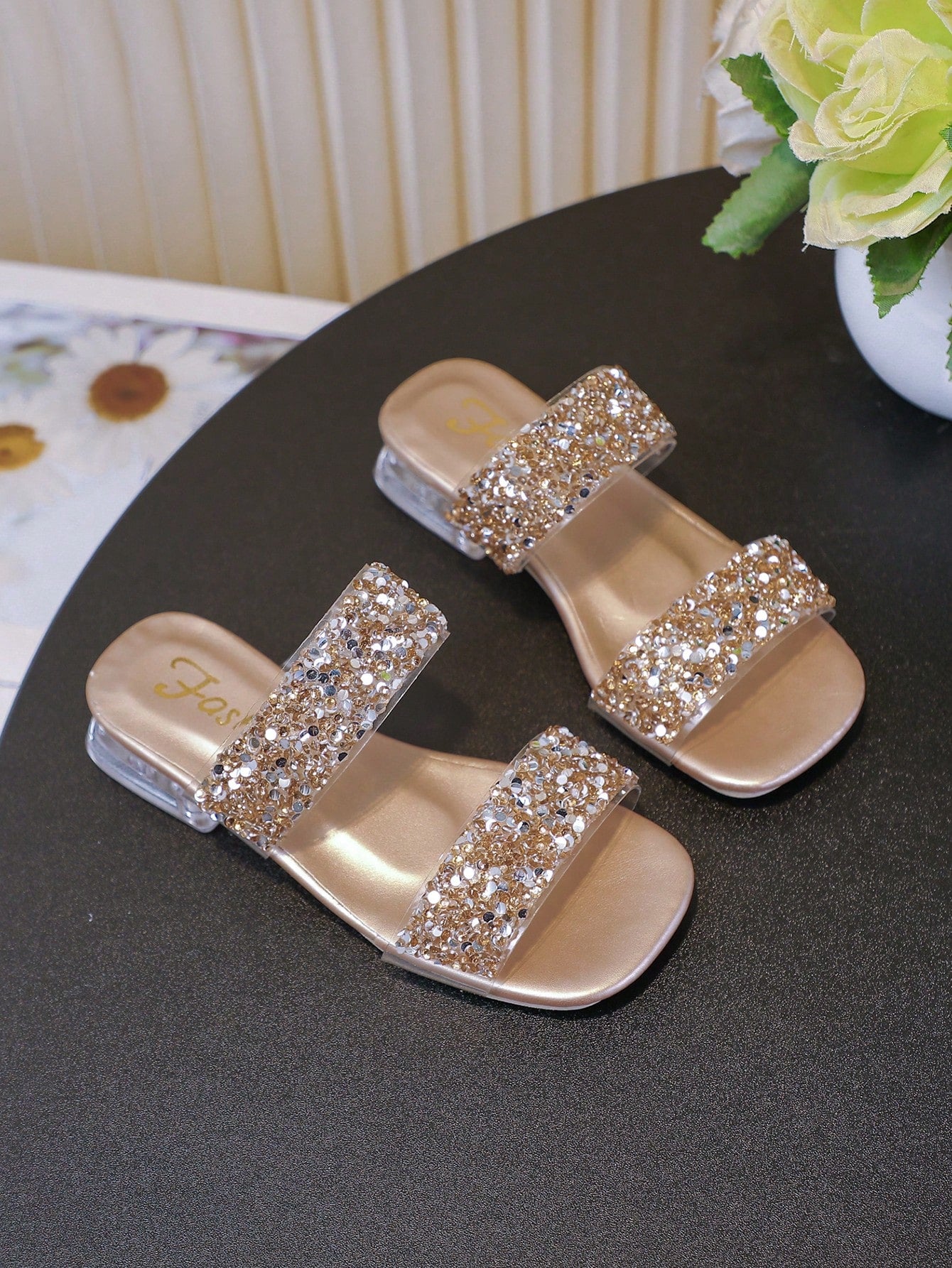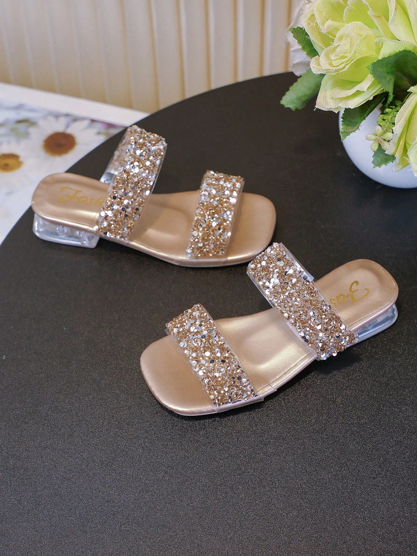 1 Pair Girl Summer Fashion Thick Heel Rhinestone Glitter Slides Wedge Sandals, Stylish & Versatile