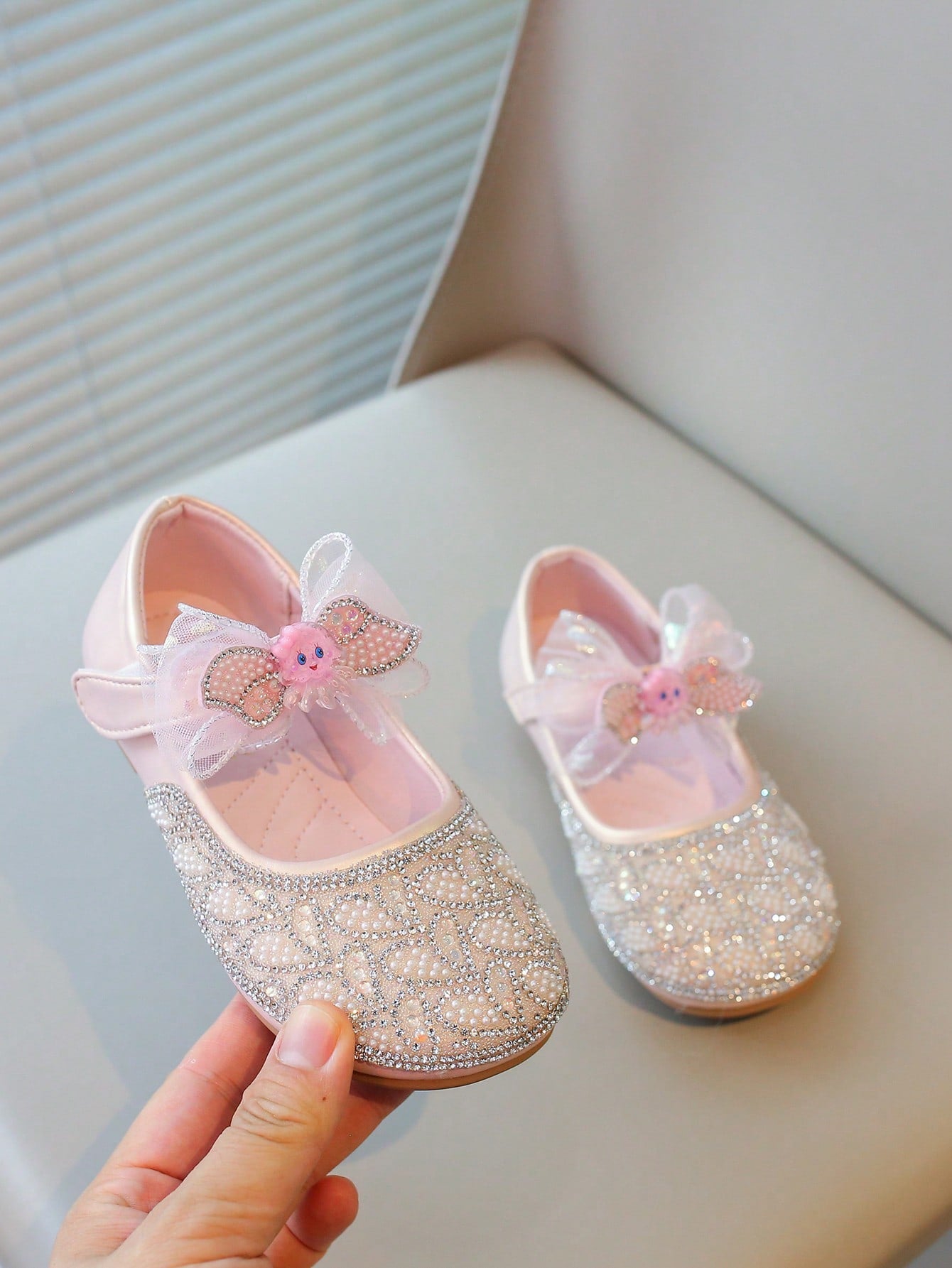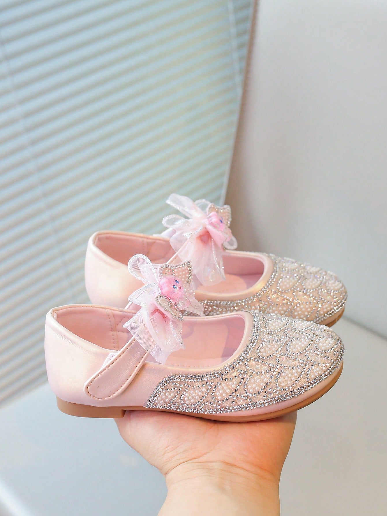 زوج واحد من الأحذية المسطحة المزينة بفيونكة وأحجار الراين واللؤلؤ للفتيات
