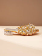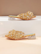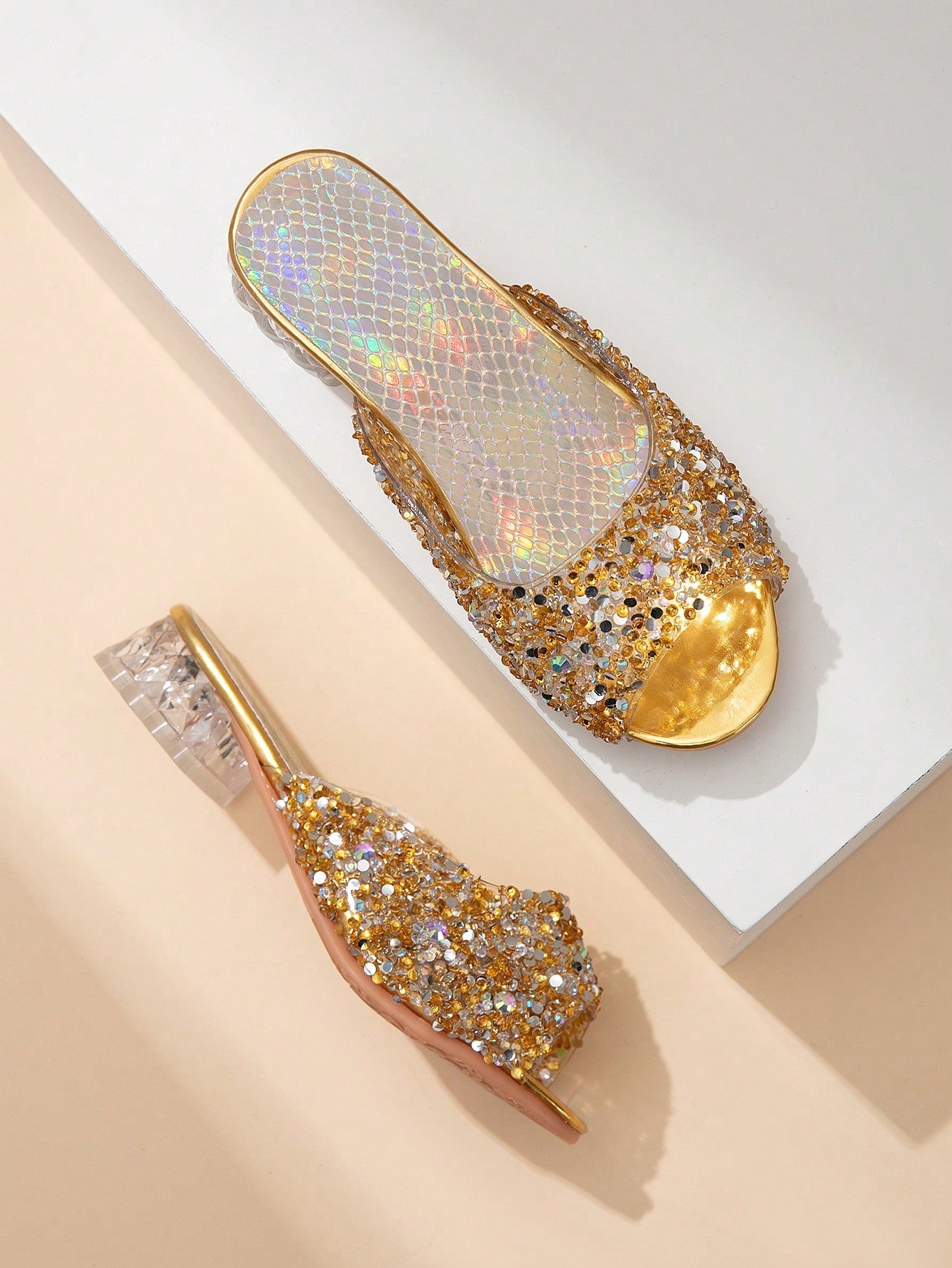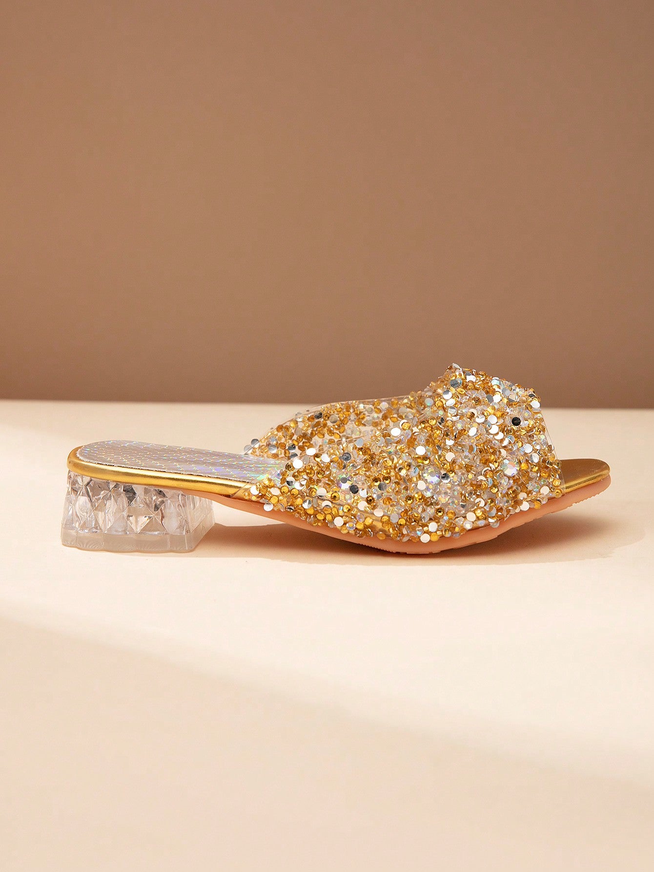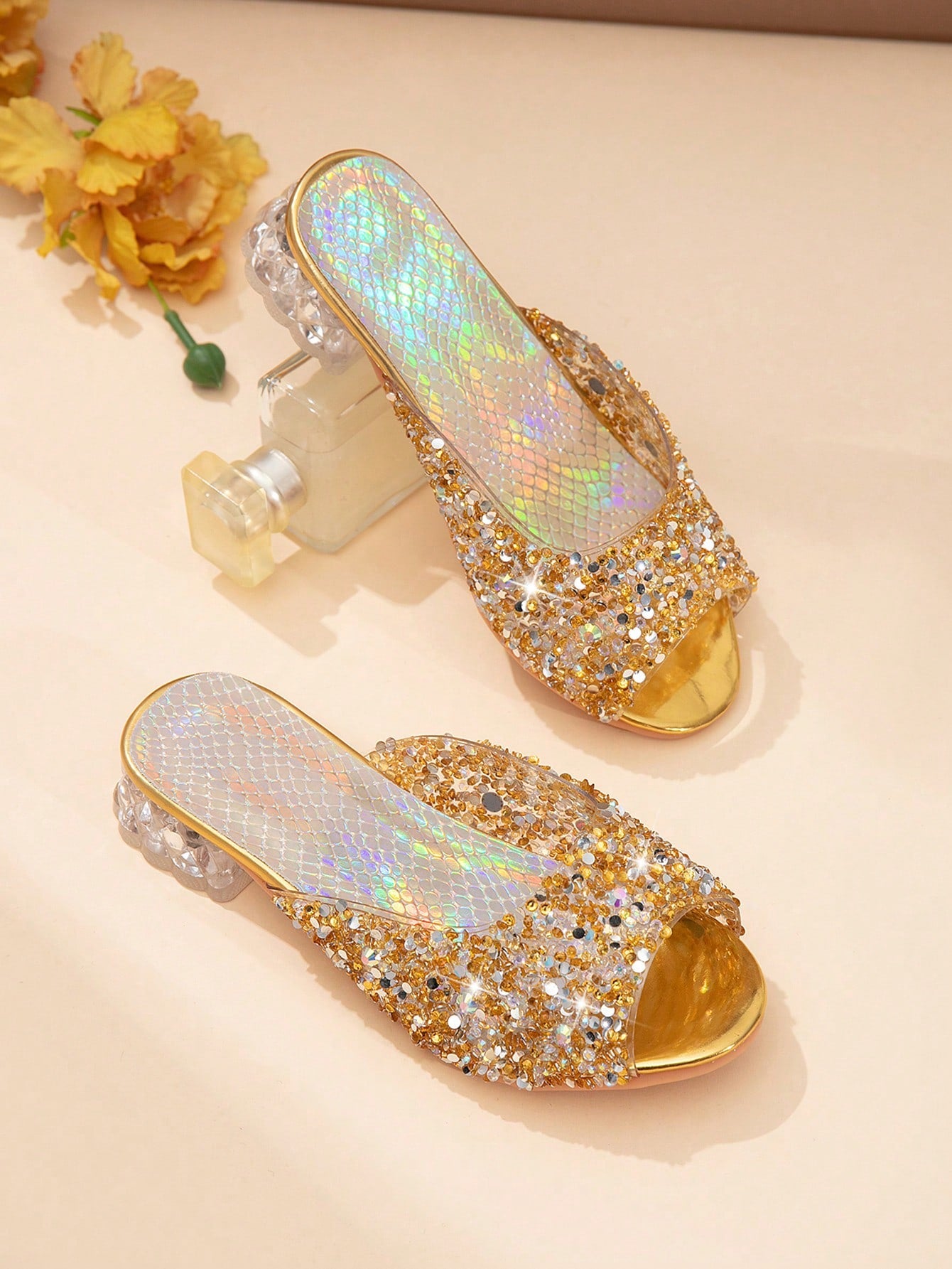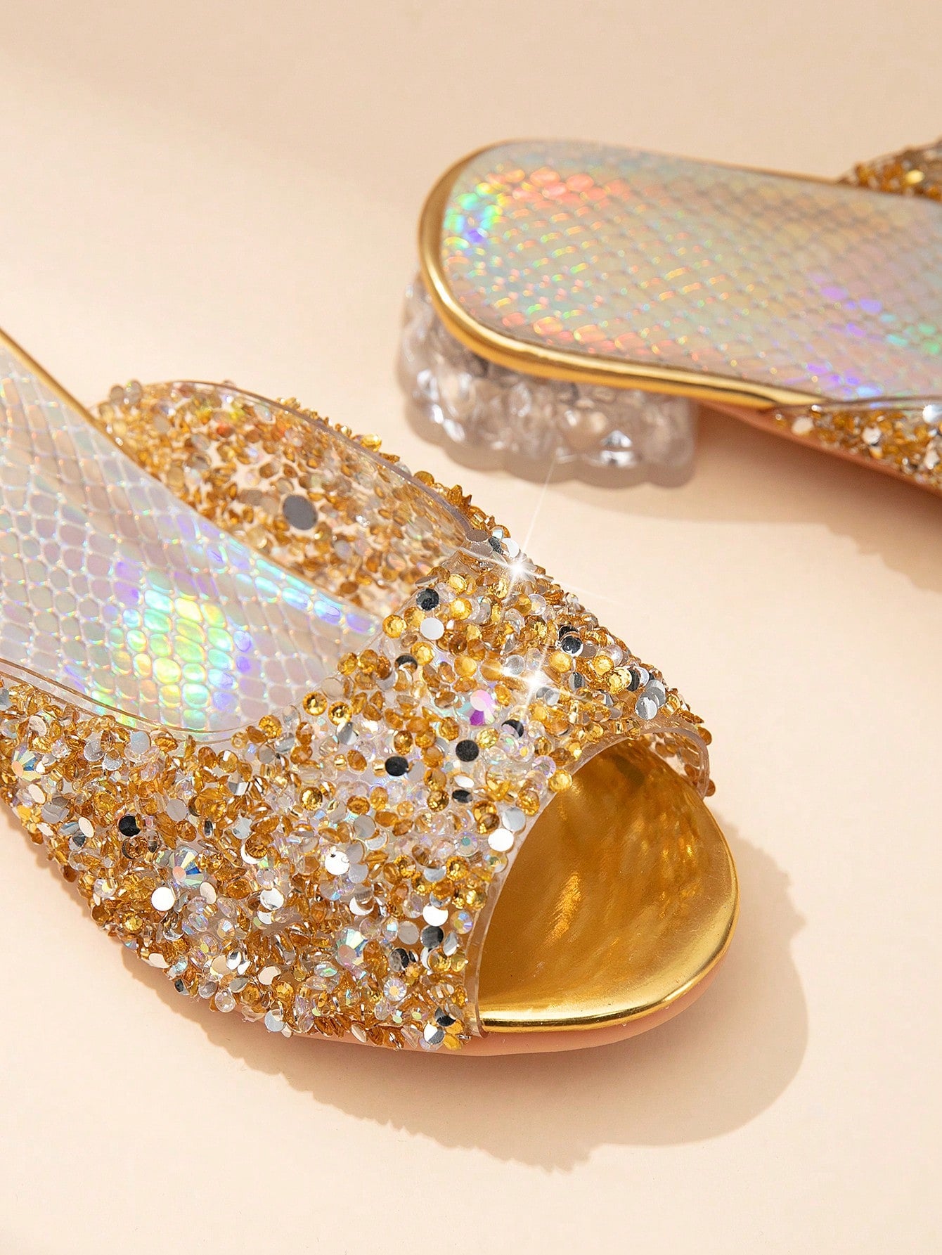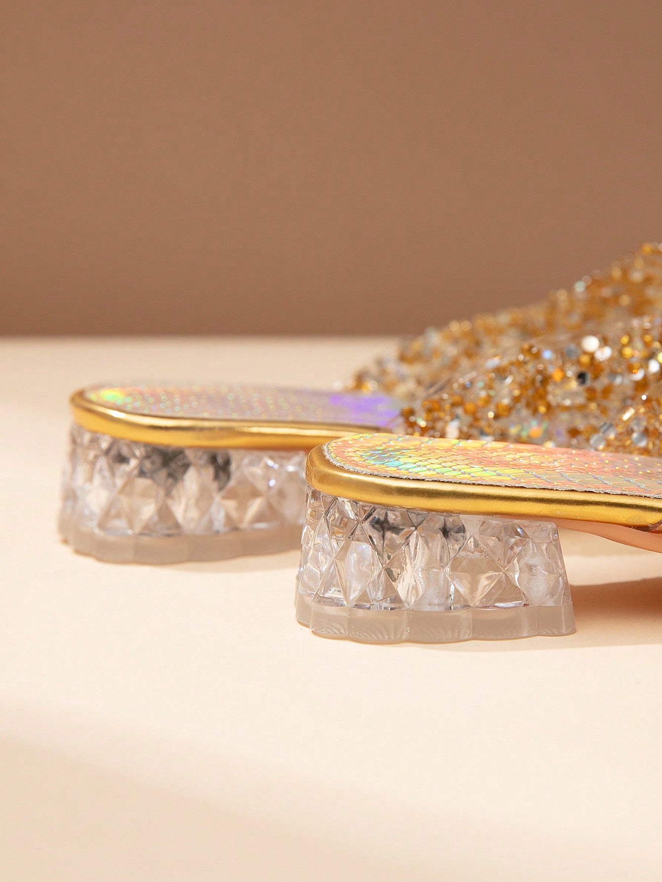 زوج واحد من الصنادل الصيفية الأنيقة ذات الكعب العالي الكريستالي للفتيات الصغيرات