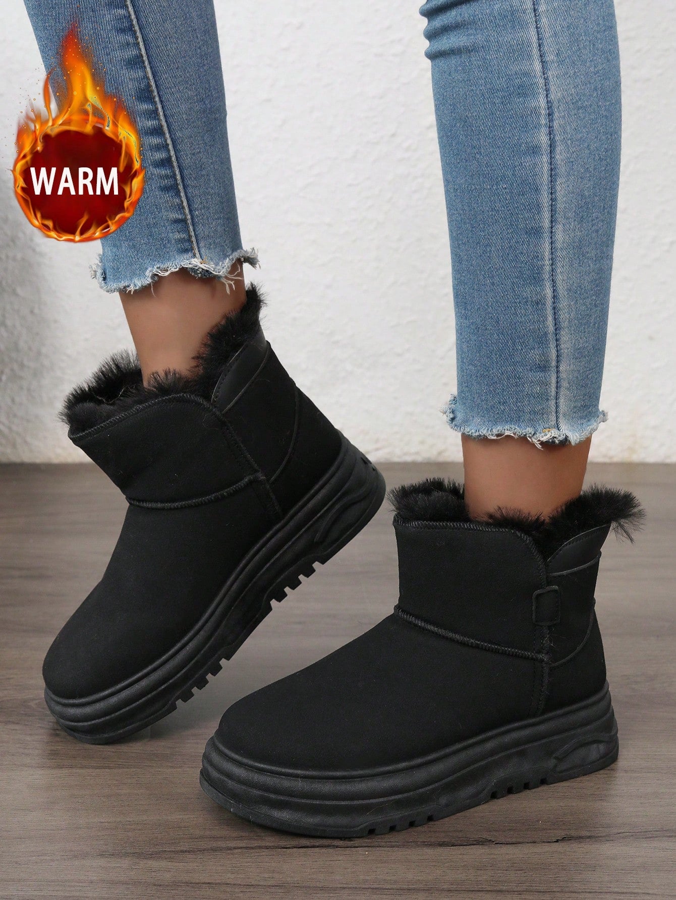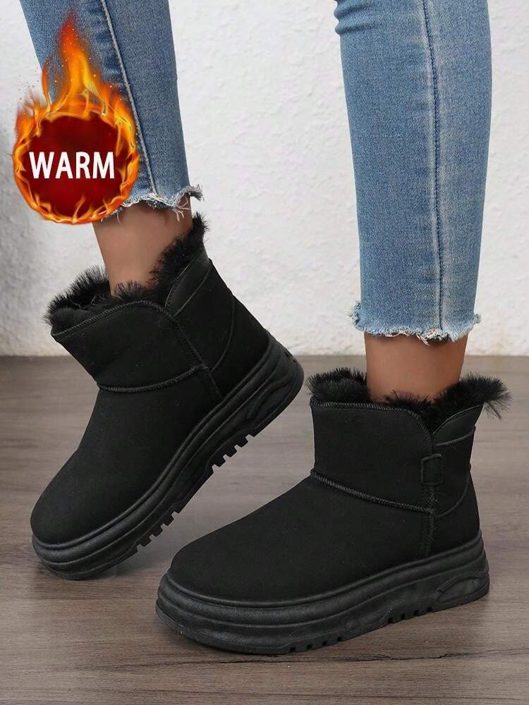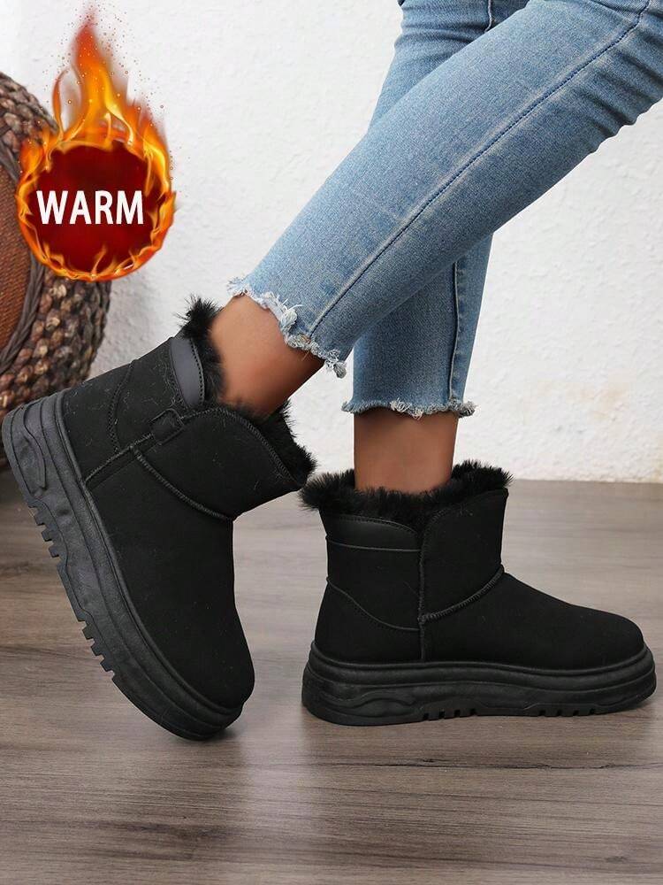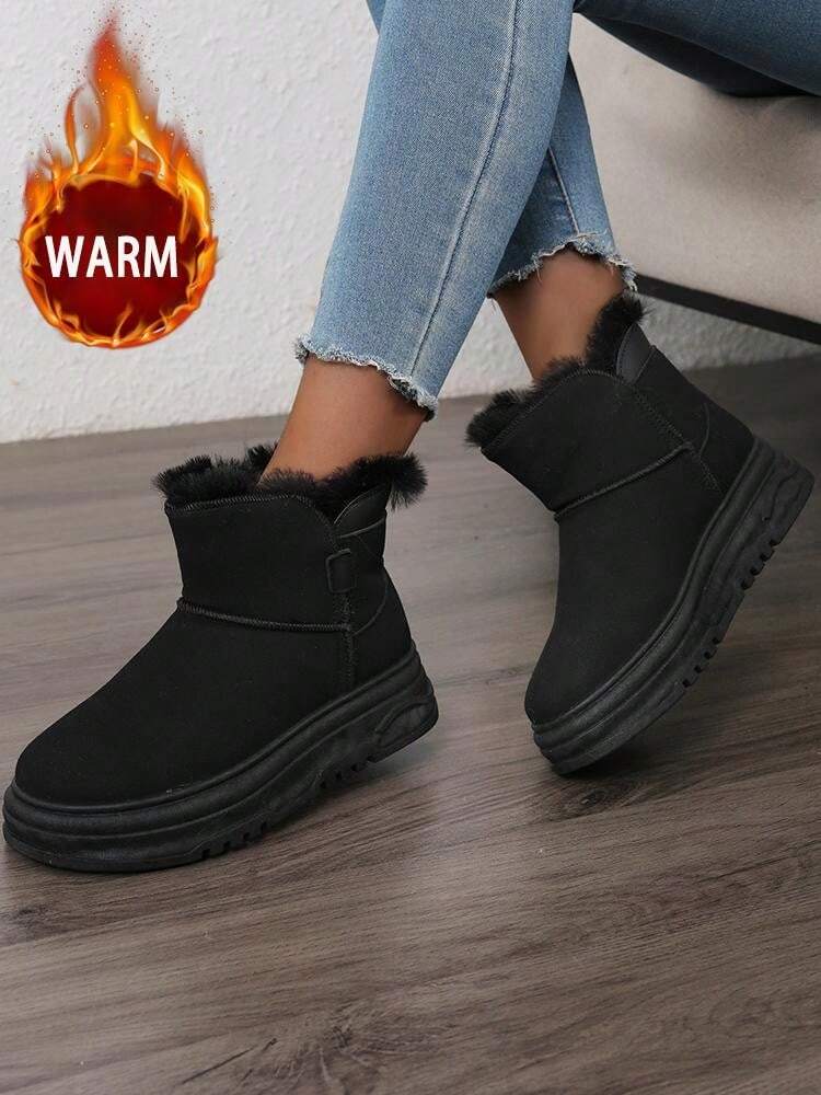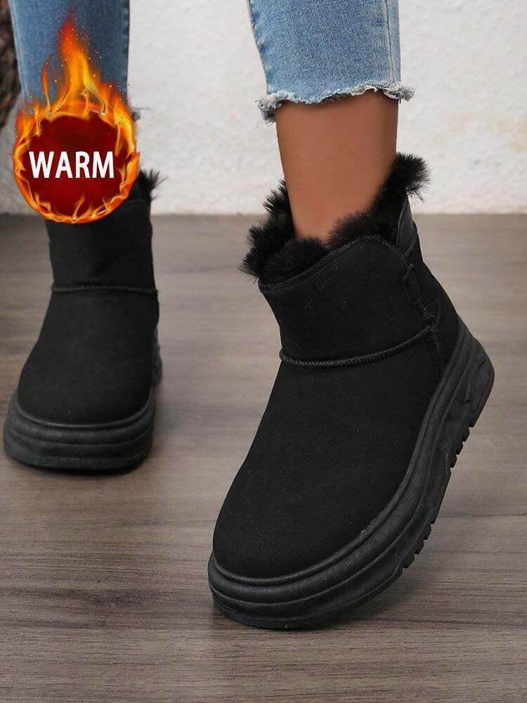 زوج واحد من أحذية الثلج الشتوية الدافئة للنساء، أحذية جلدية عالية الرقبة مقاومة للماء بأصابع مستديرة وبطانة من الفرو