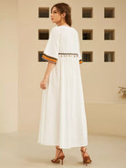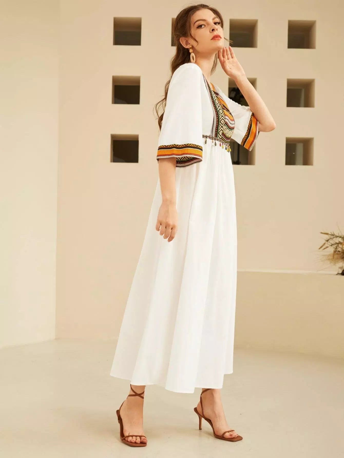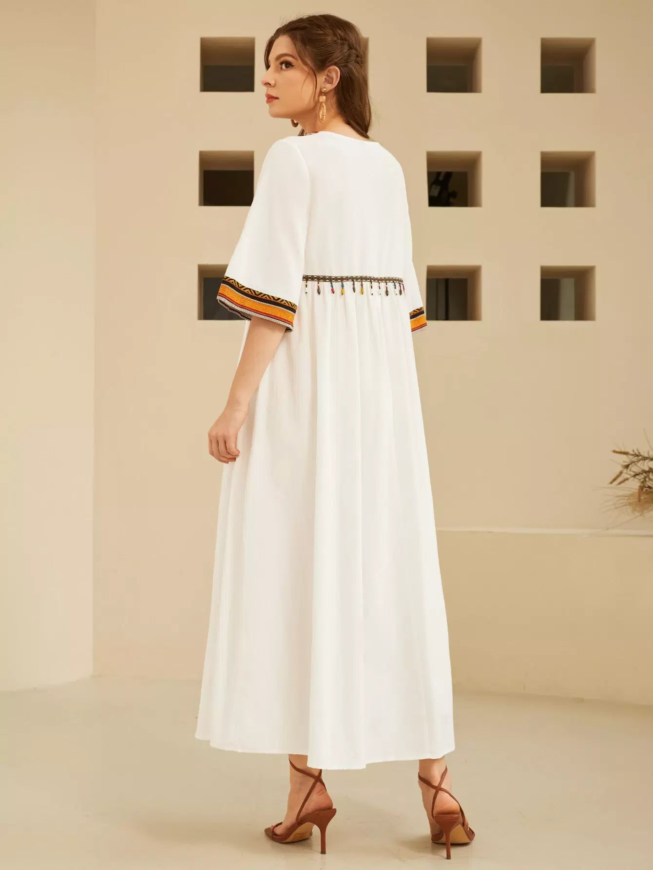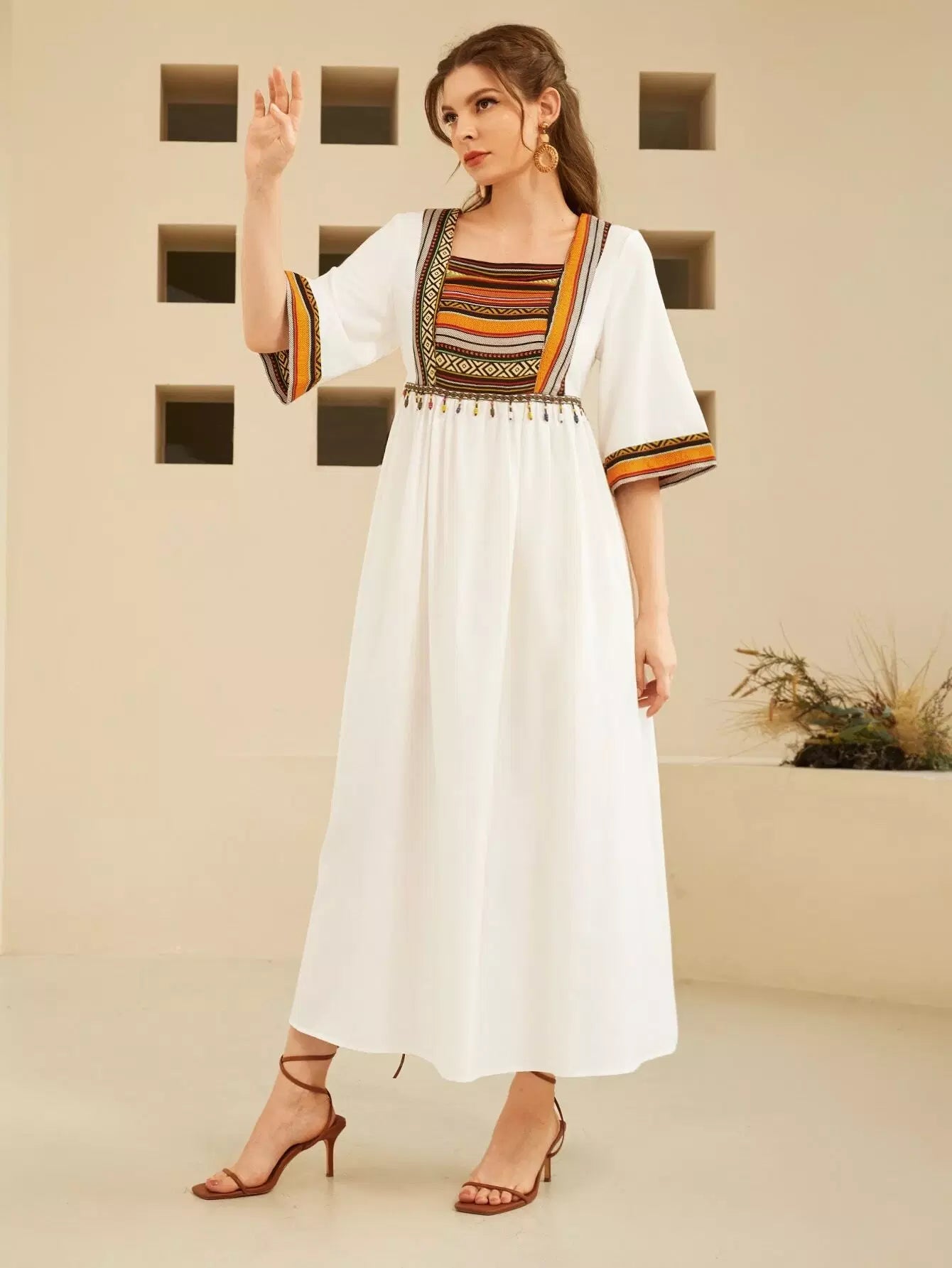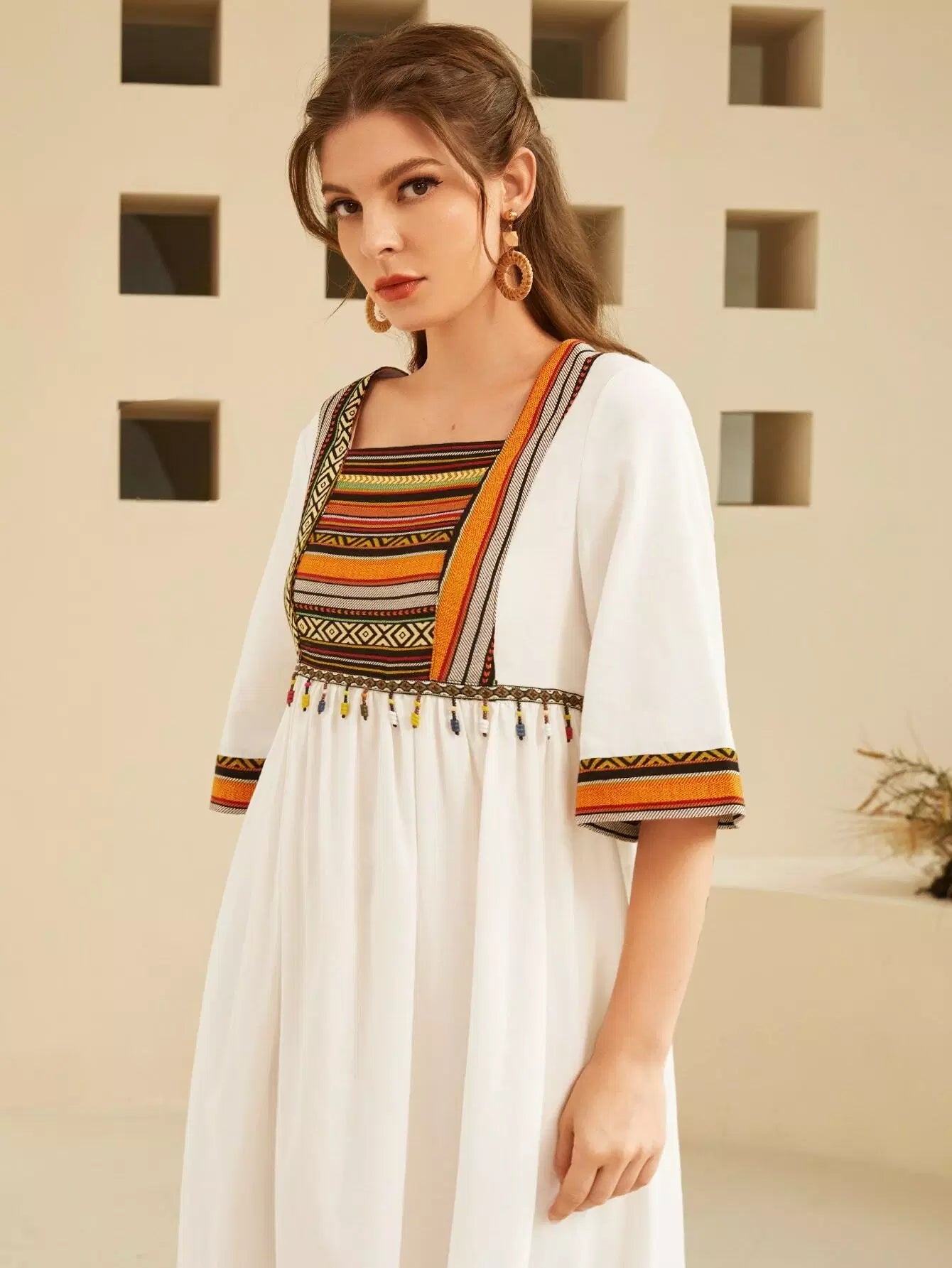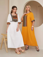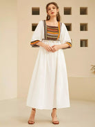 فستان بتفاصيل شريطية مطرزة بالرسومات وياقة مربعة قطعة واحدة