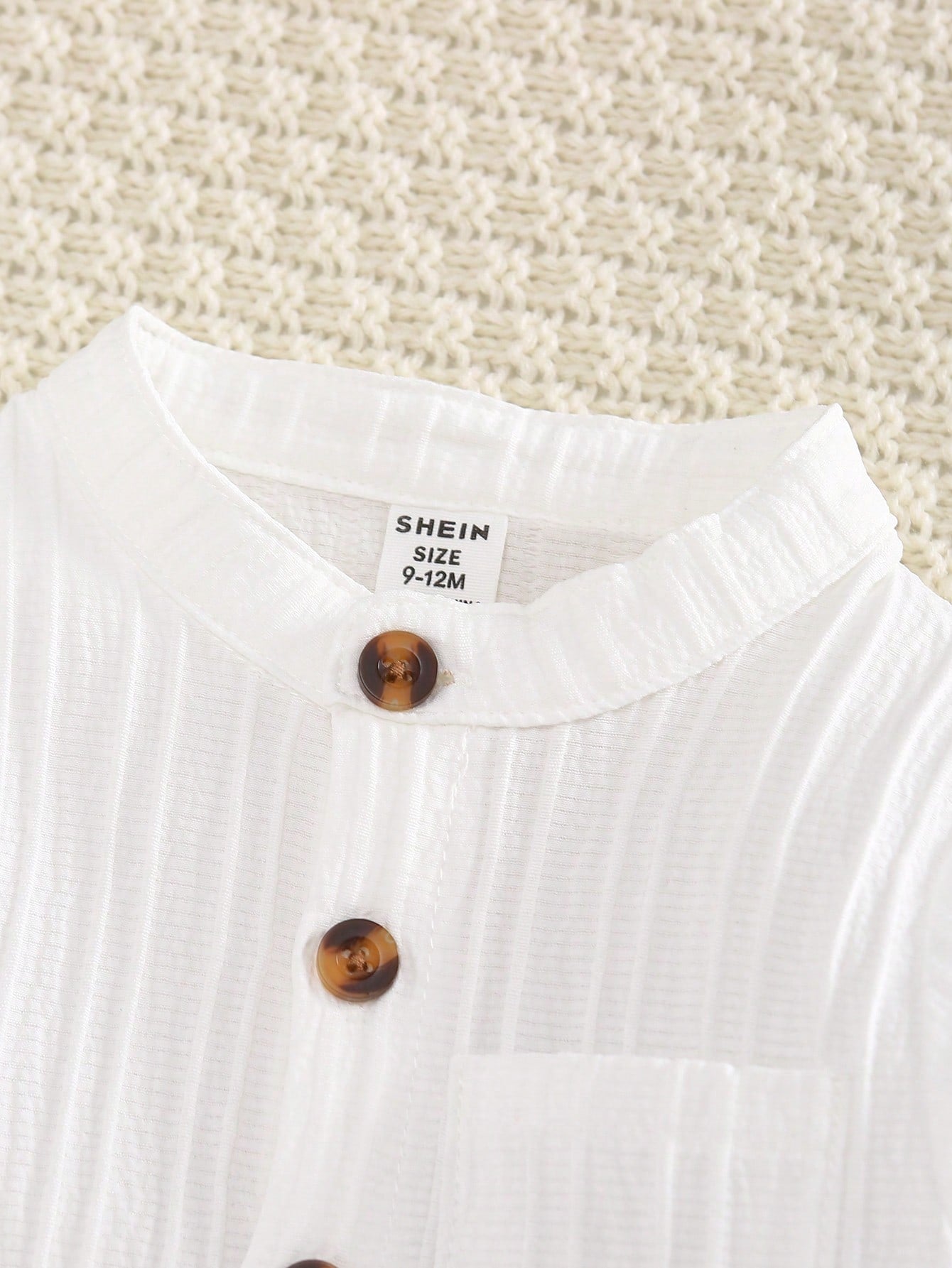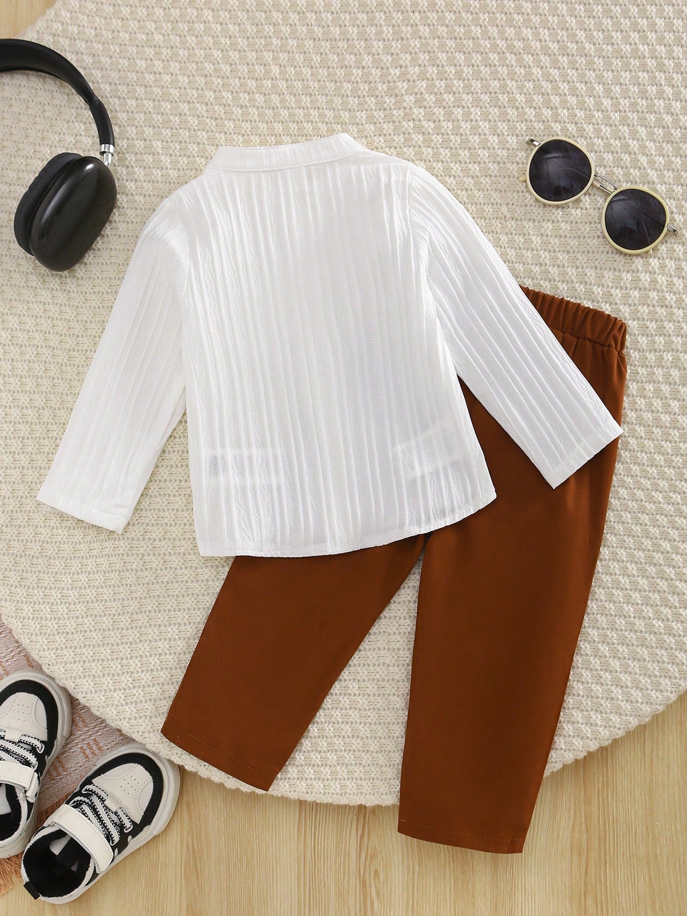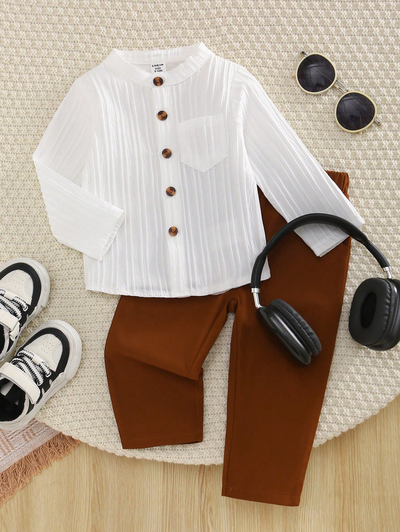 1 Set Toddler Boys' Stand Collar Textured Fabric Shirt With Pants, Designed With Quality Fabrics To Provide