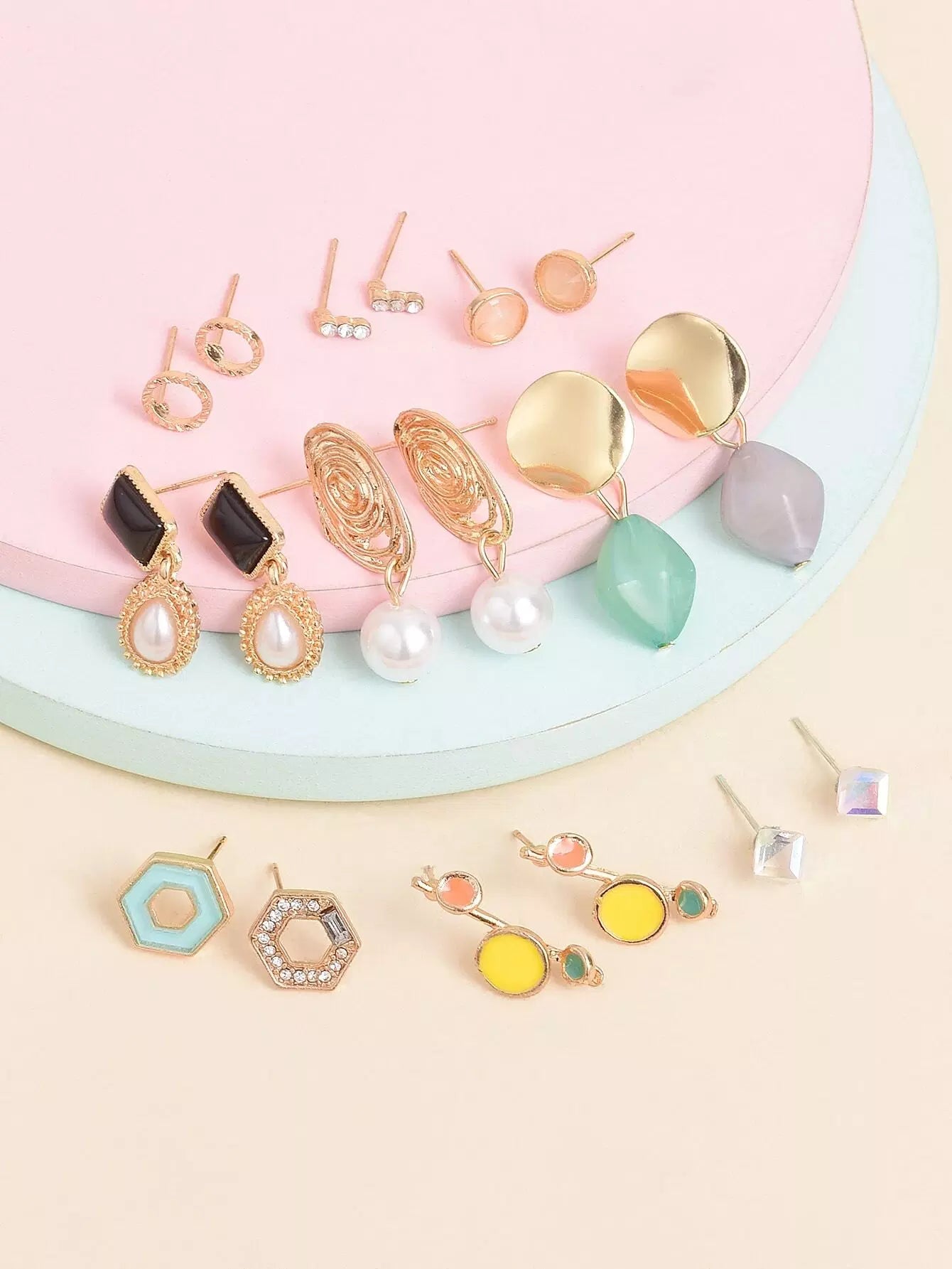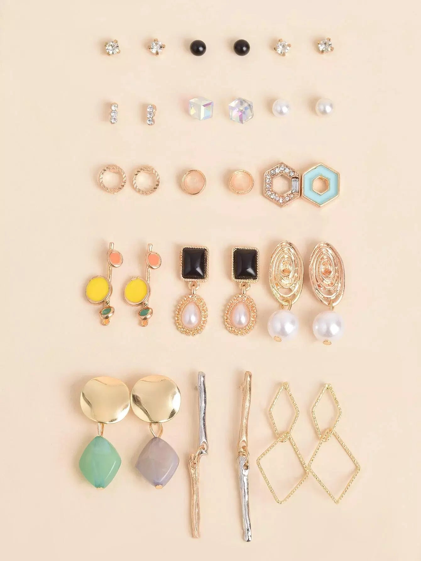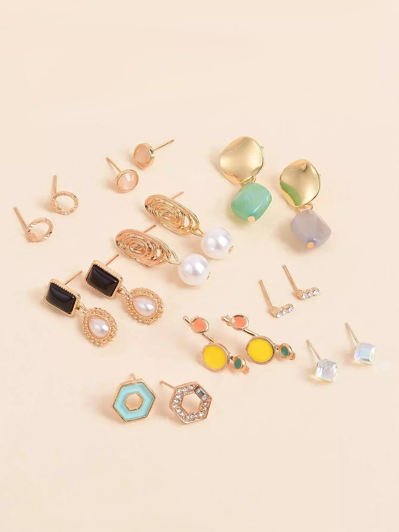 للنساء - 15 زوجًا من الأقراط ذات التصميم الجغرافي واللؤلؤ الصناعي
