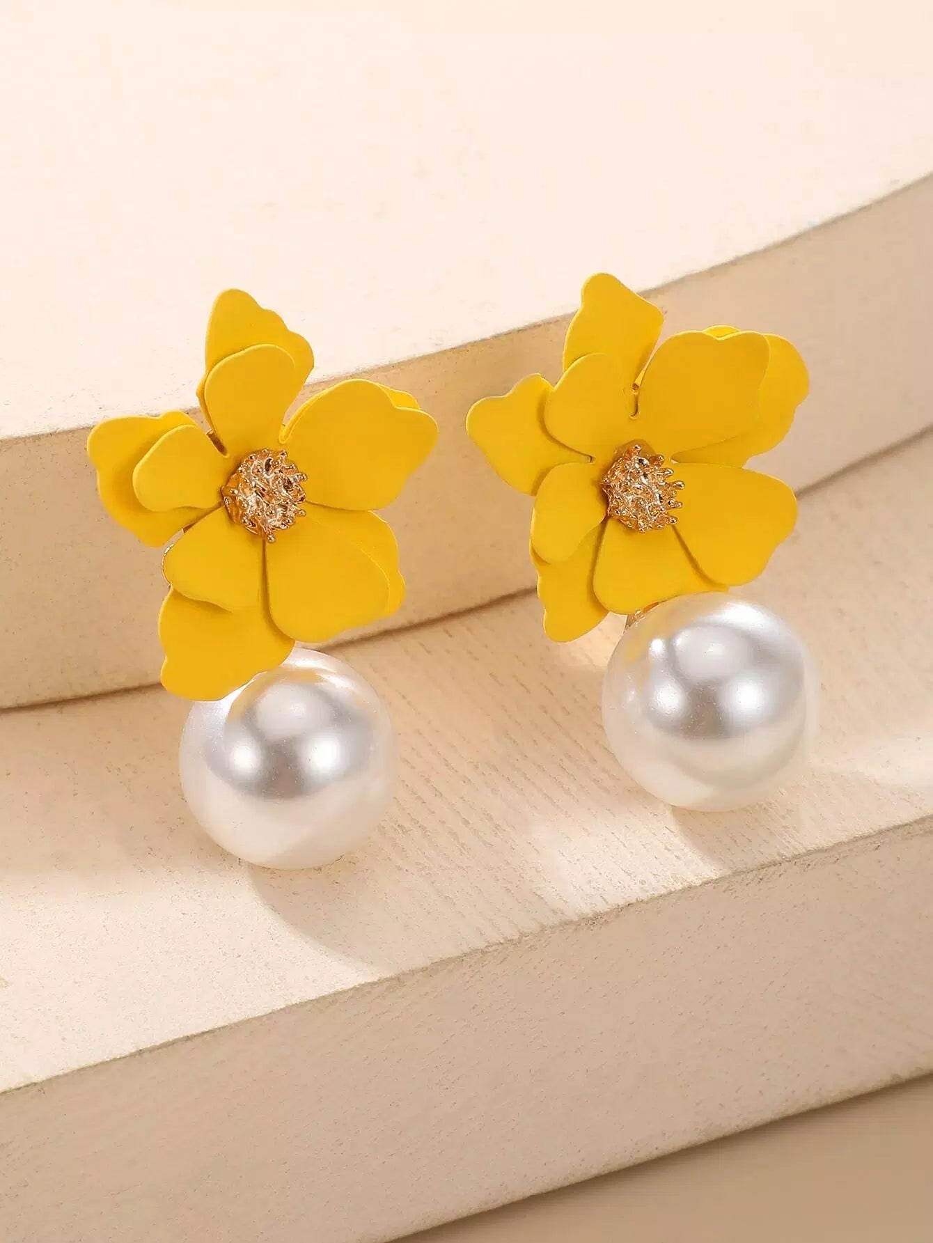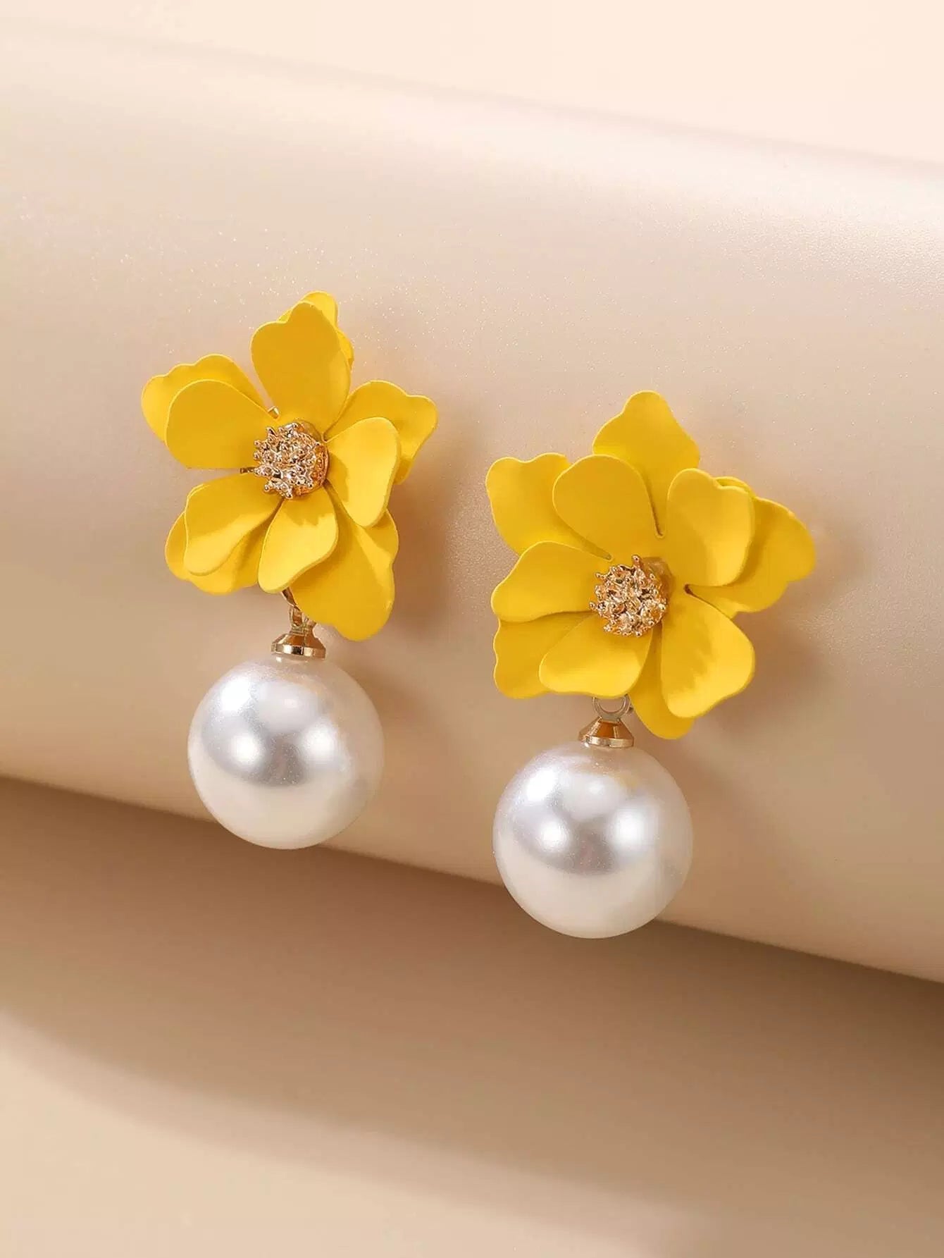 زوج واحد من الأقراط المتدلية بتصميم زهور مزخرف باللؤلؤ