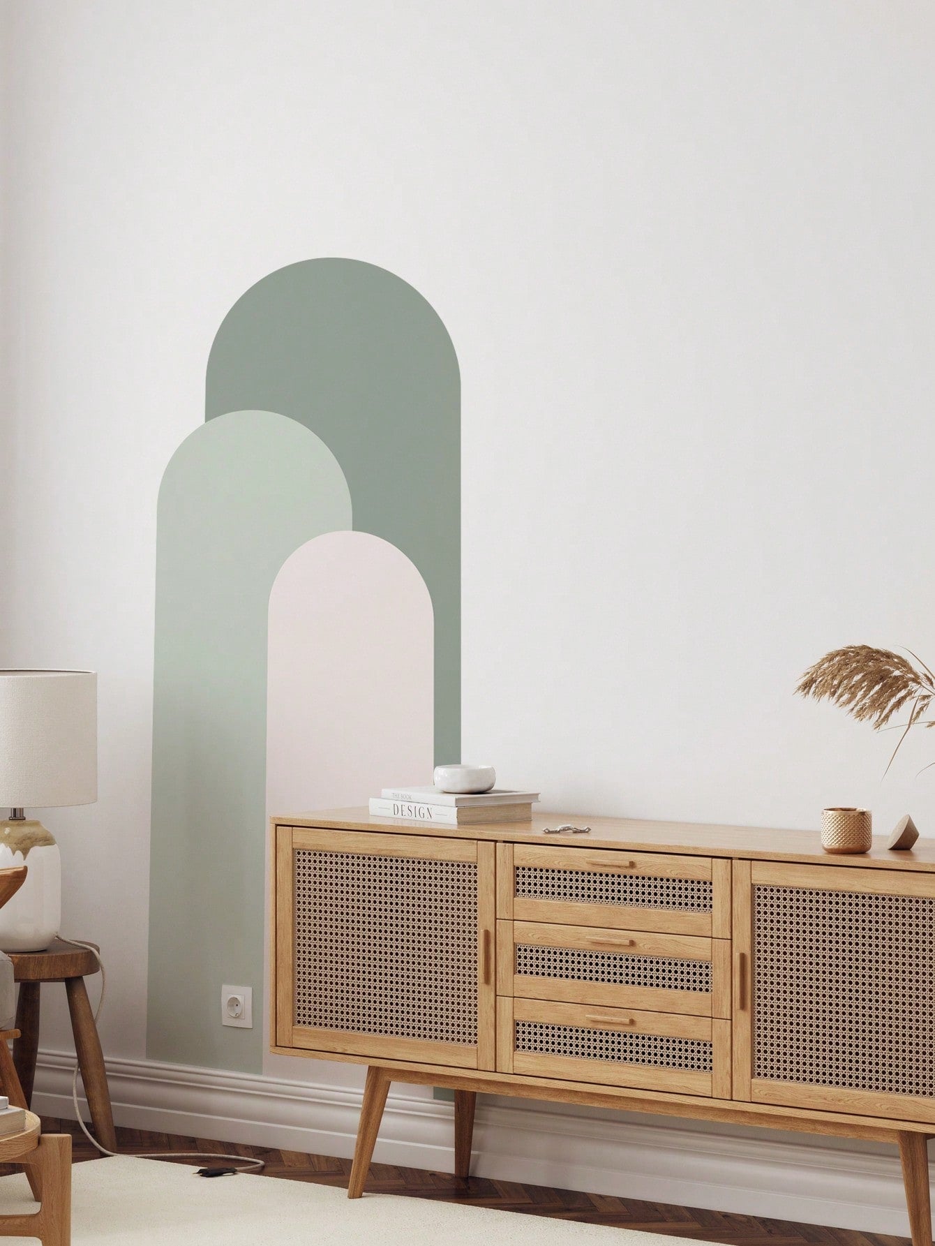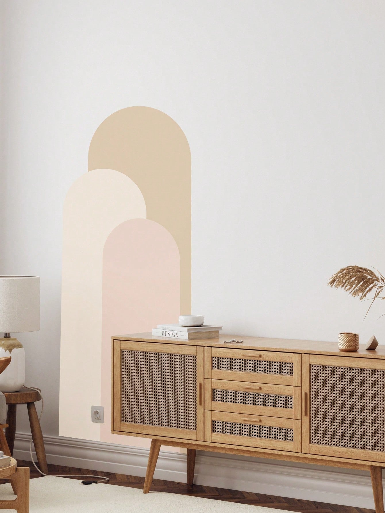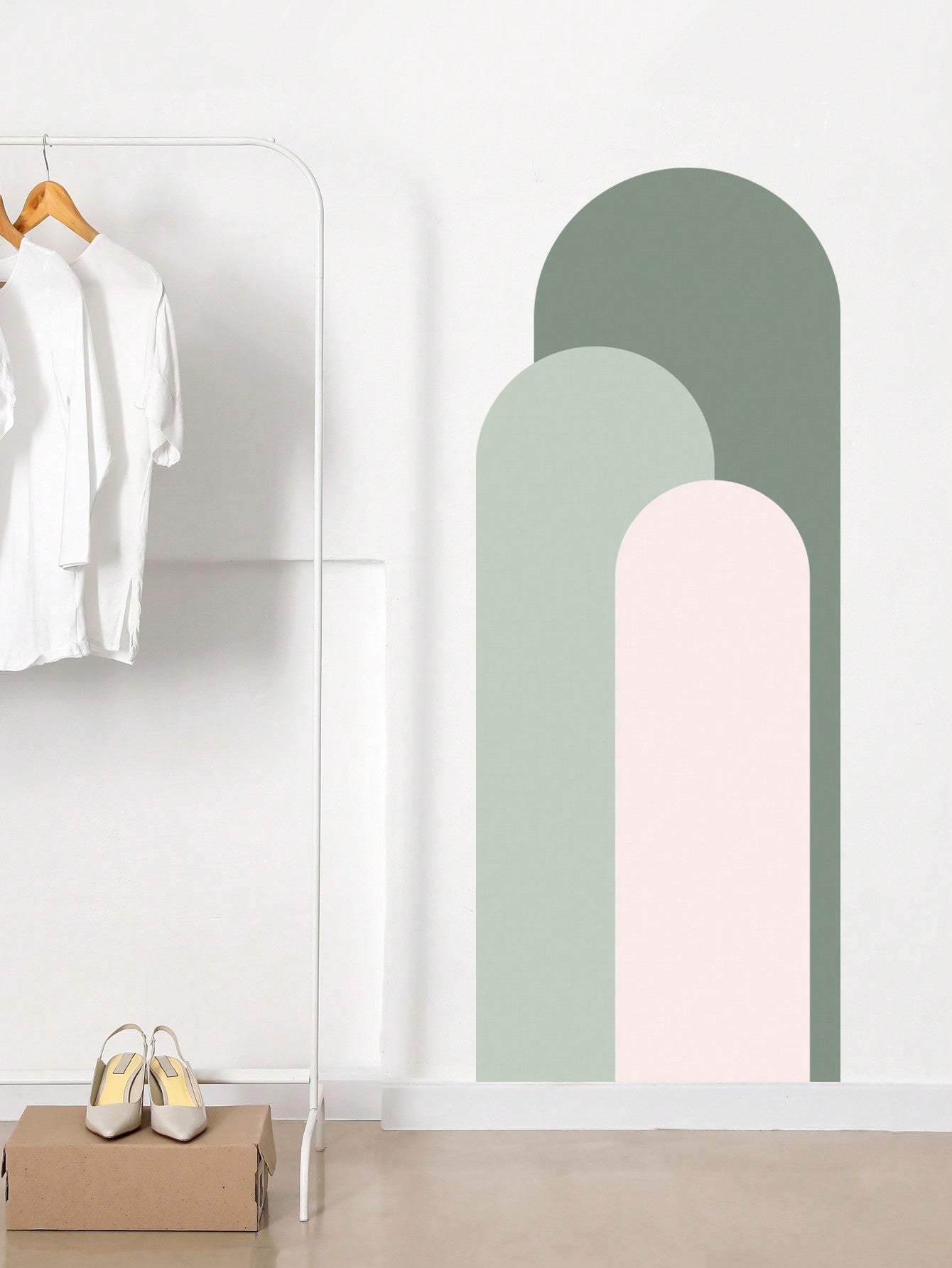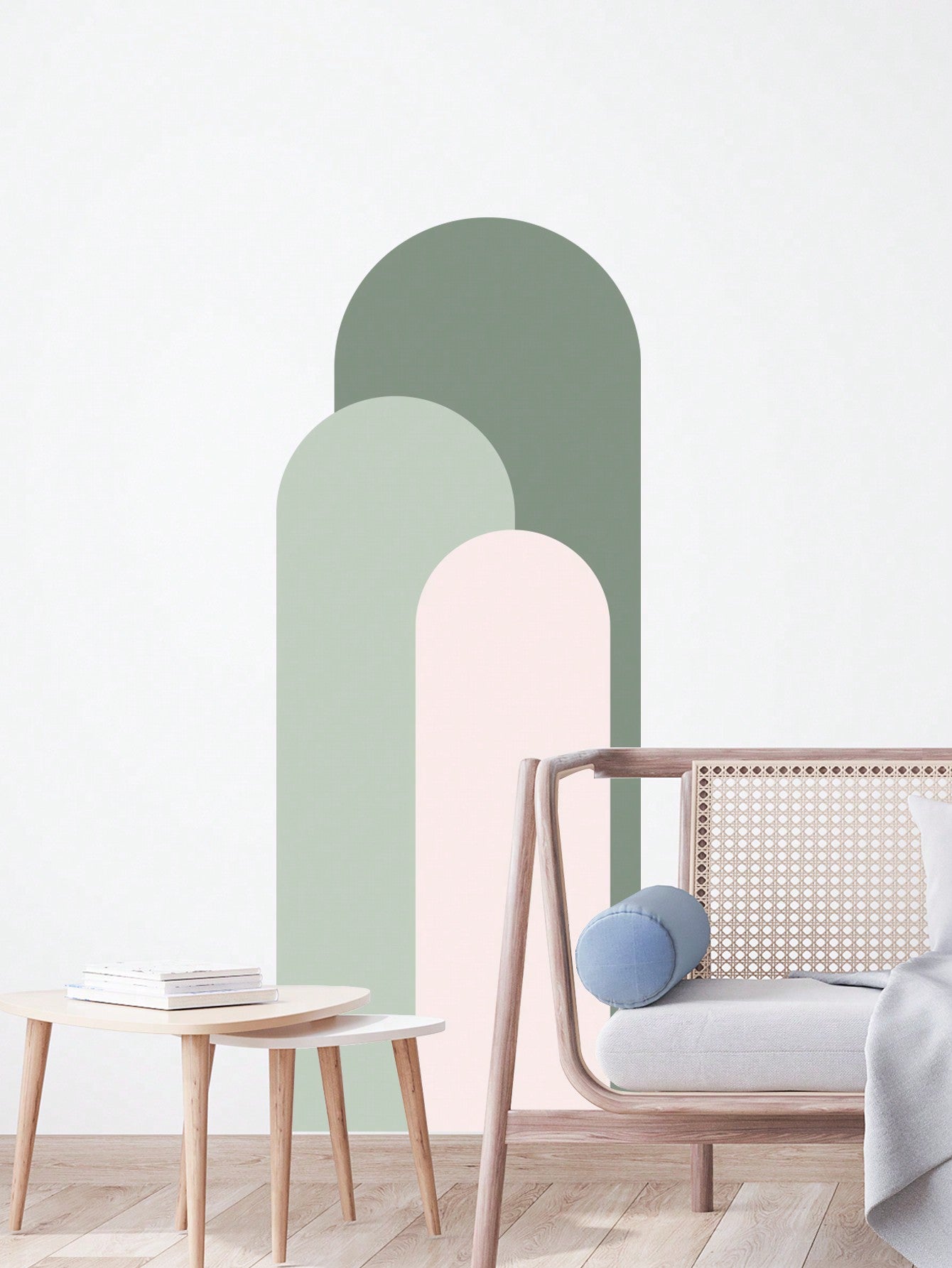 ملصق حائط بنمط قوس وريشة - تصميم بسيط وعصري باللونين الوردي والأبيض