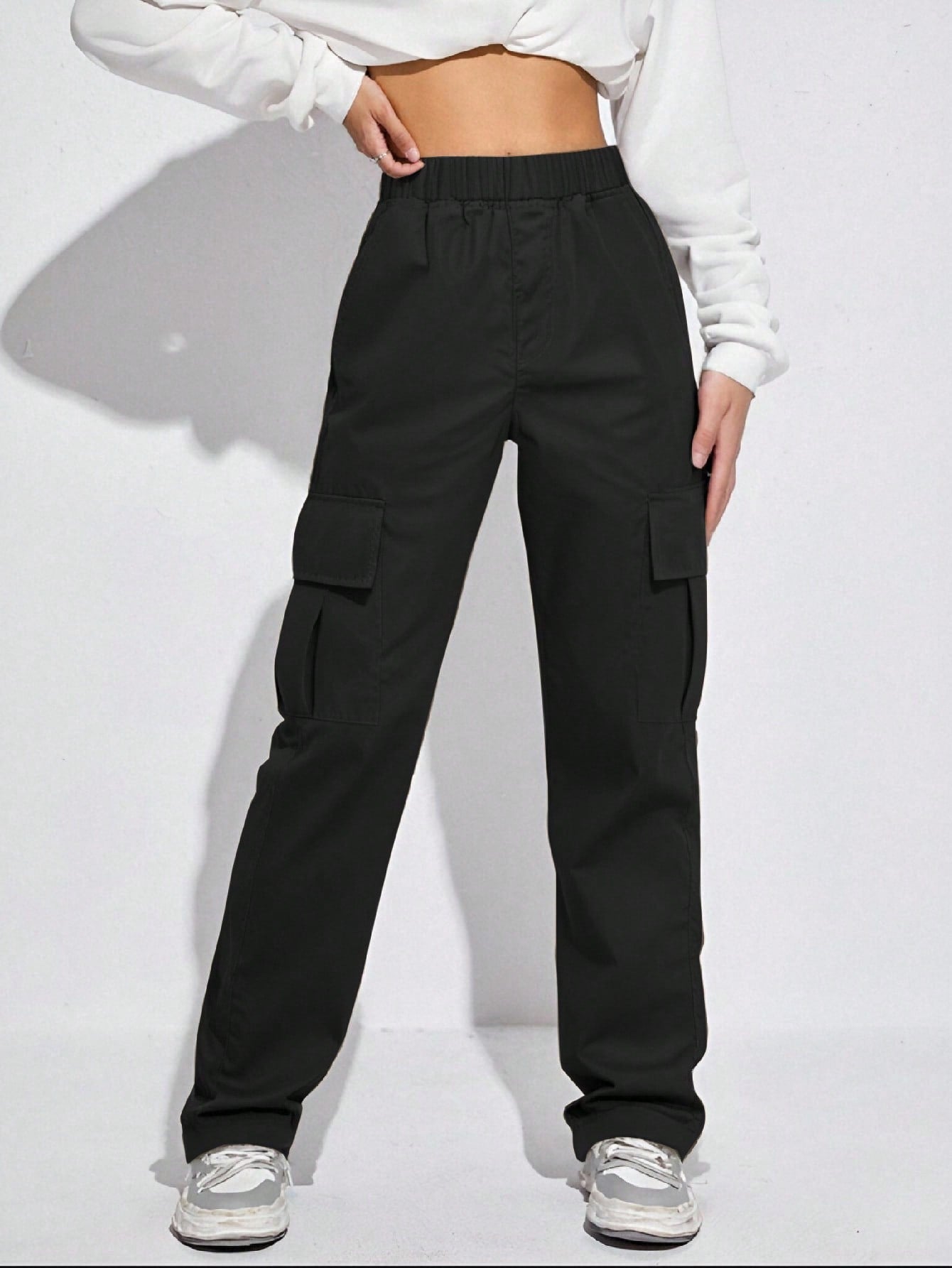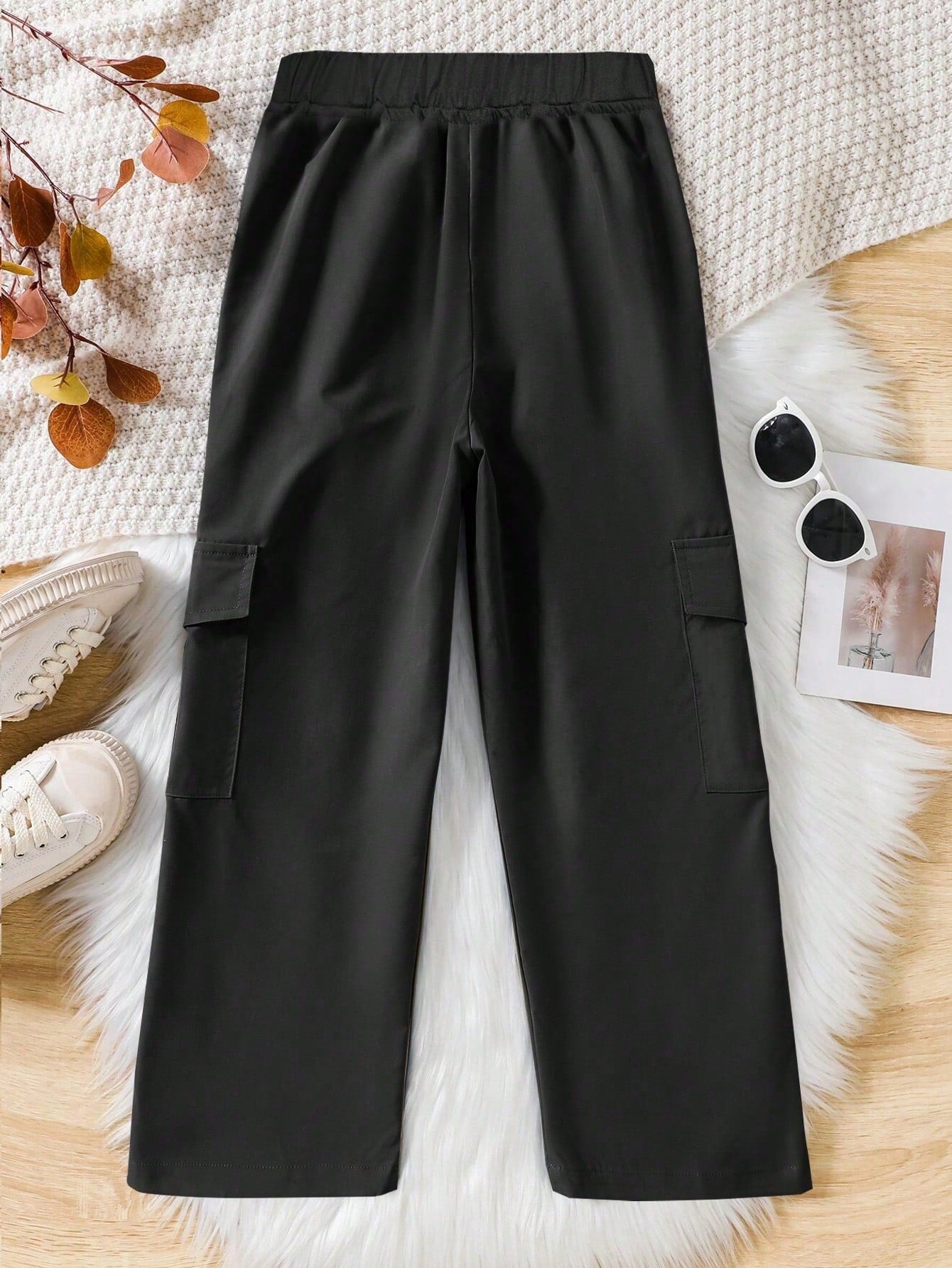 بنطال كارجو فضفاض بلون موحد أنيق للبنات/المراهقات، قطعة واحدة، مزود بجيوب متعددة