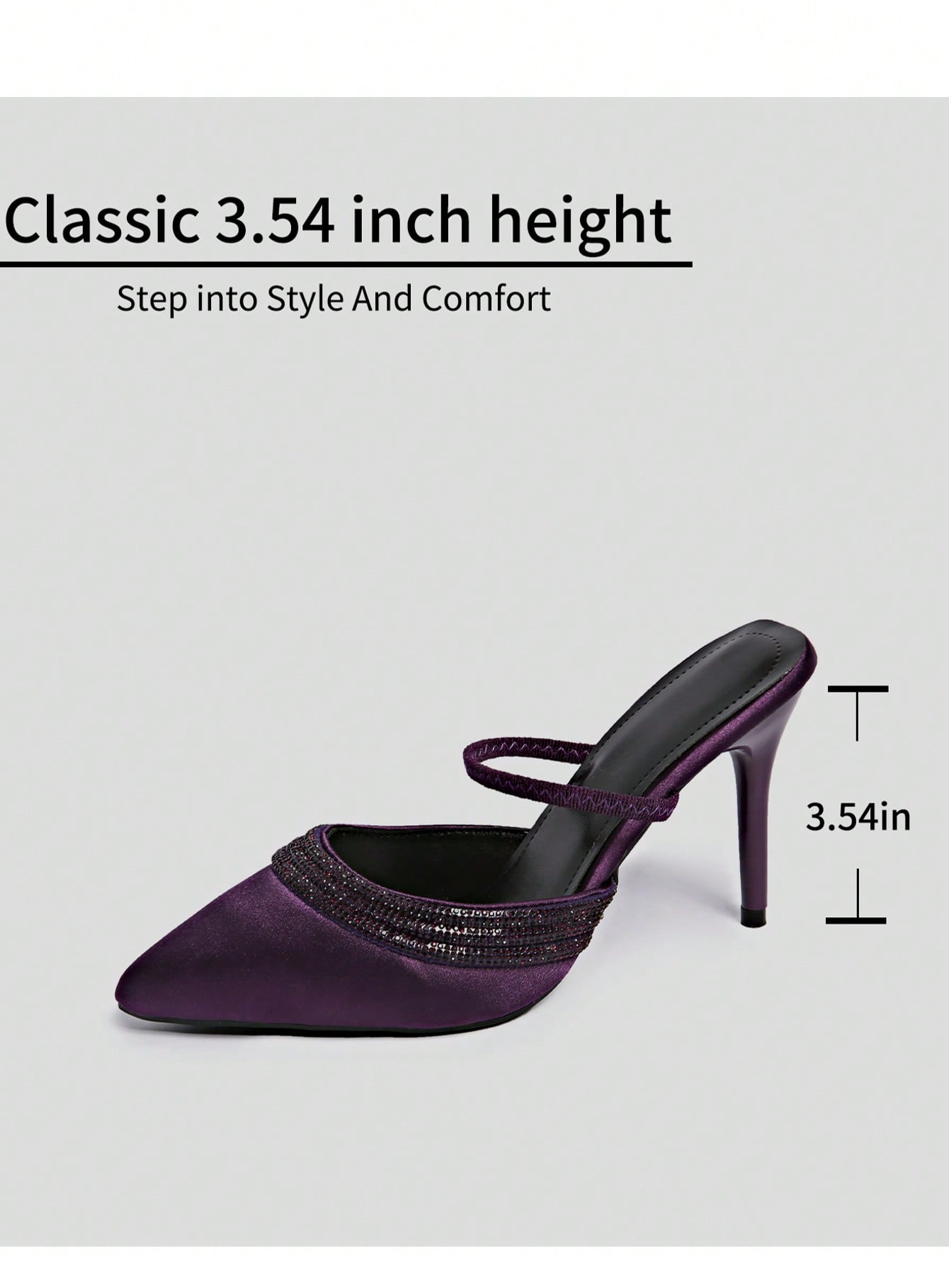 women 2025 Spring & Autumn New Purple Sharp Toe Thin High Heel Shallow Satin Rhinestone Strap Mule Sandals For Women