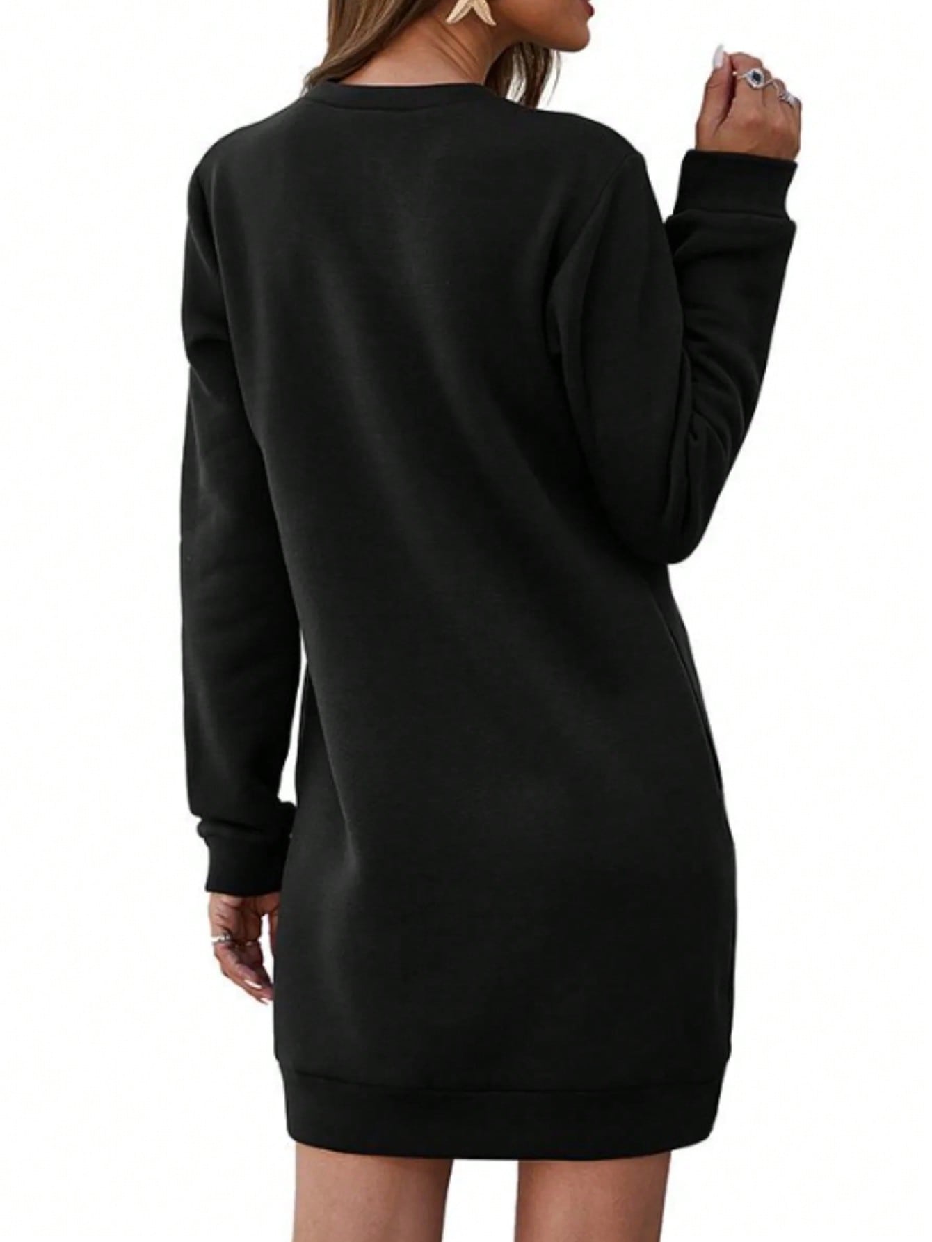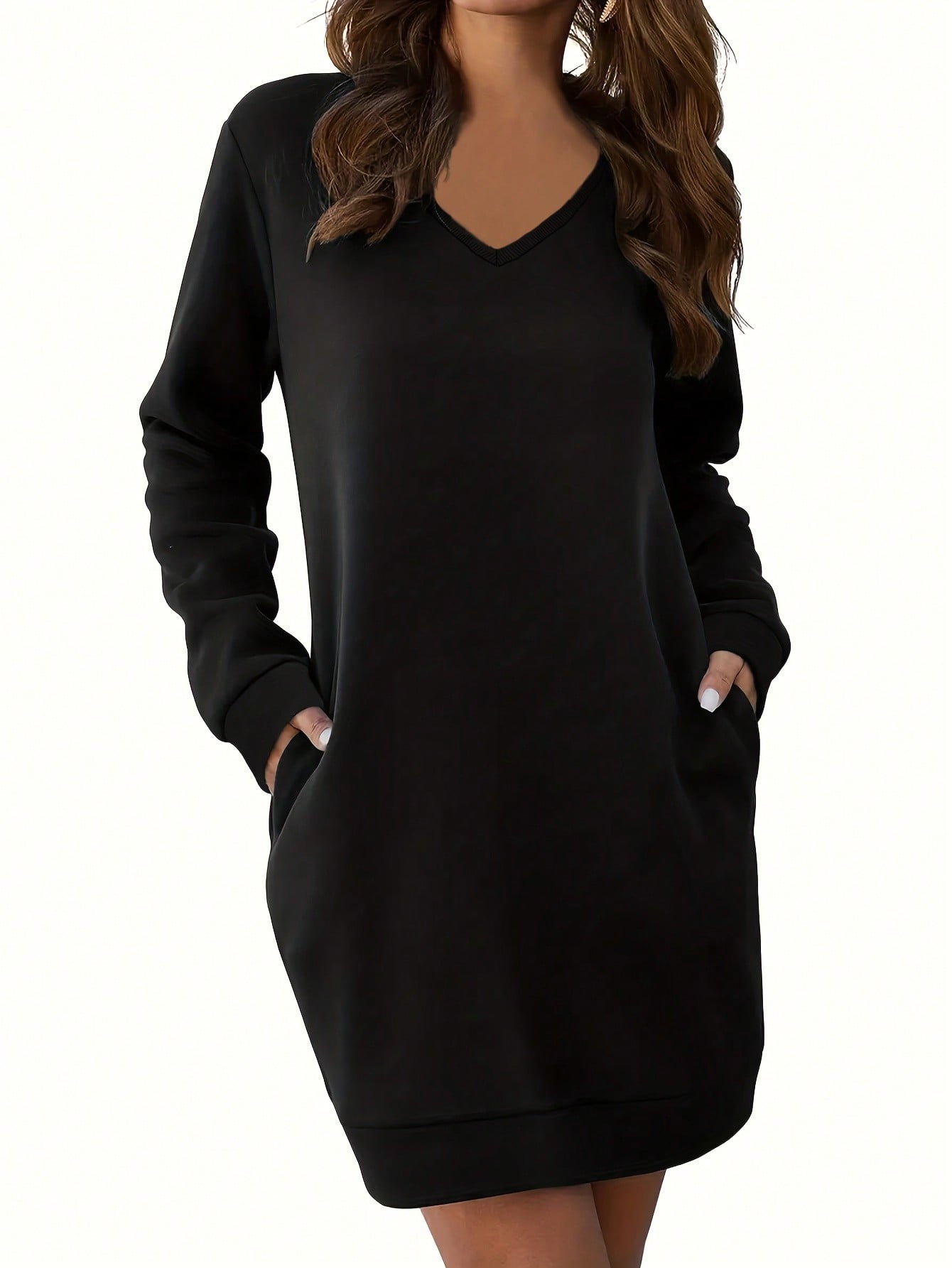 فستان سويت شيرت فضفاض بلون موحد، بياقة على شكل حرف V وجيب، وزنه 250 غرام، مناسب للإطلالات الكاجوال