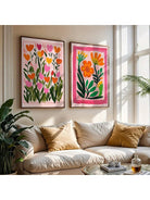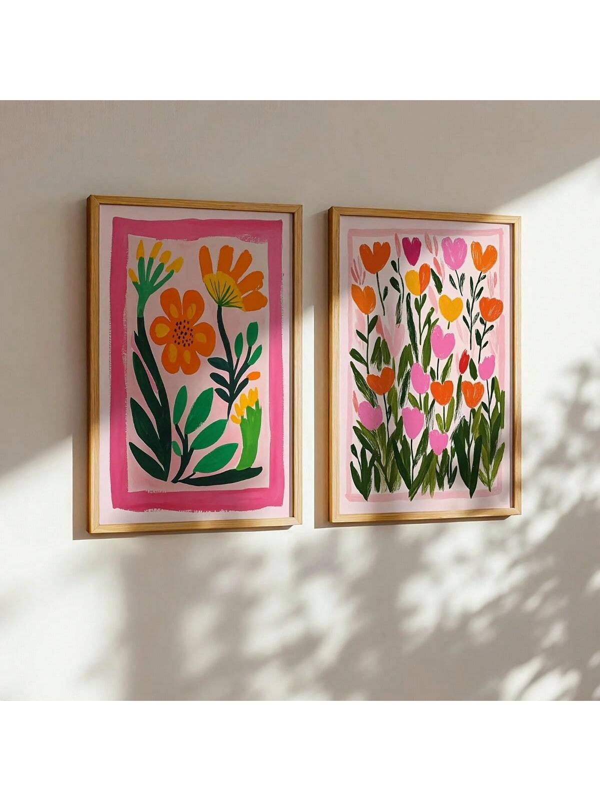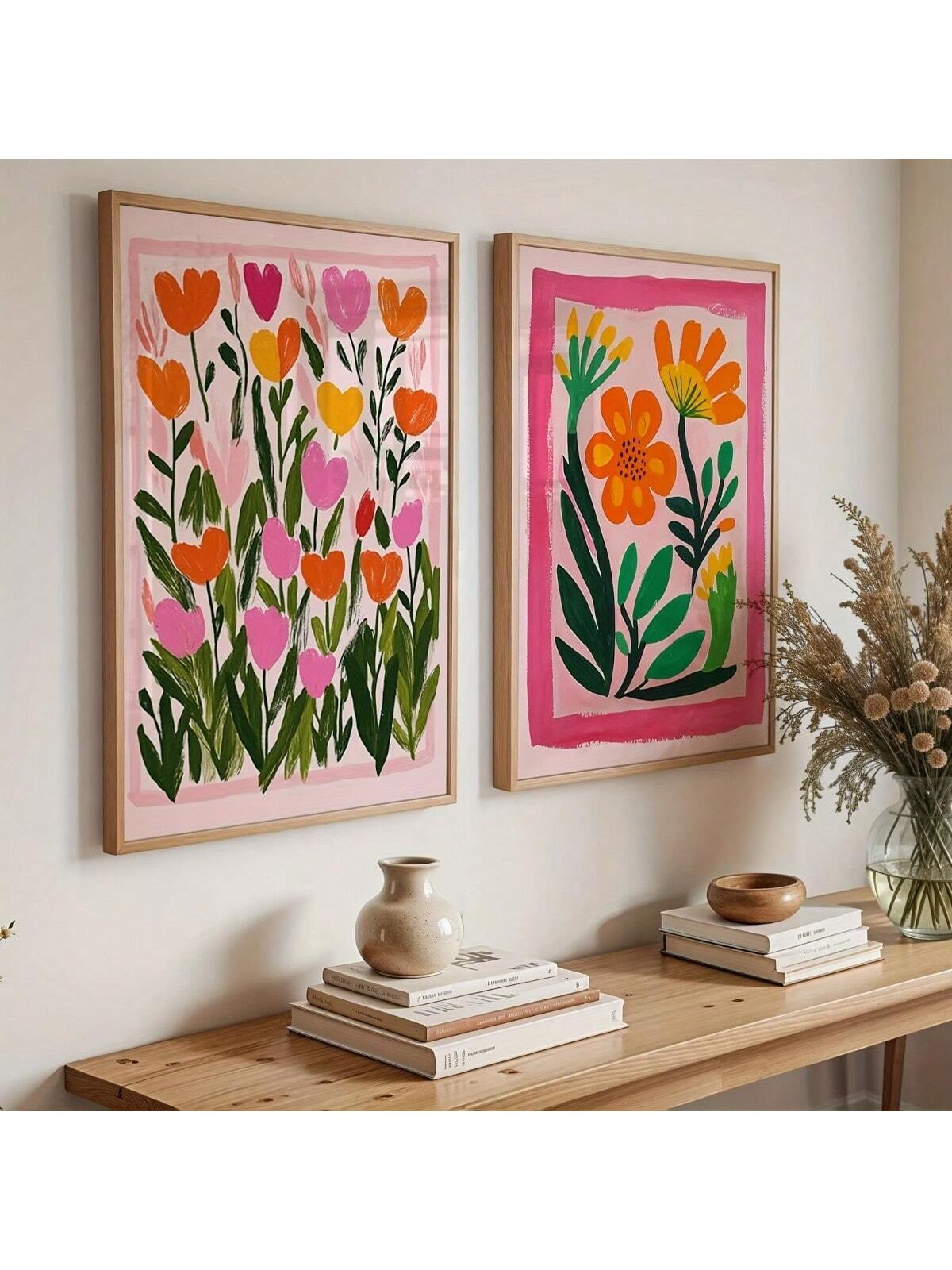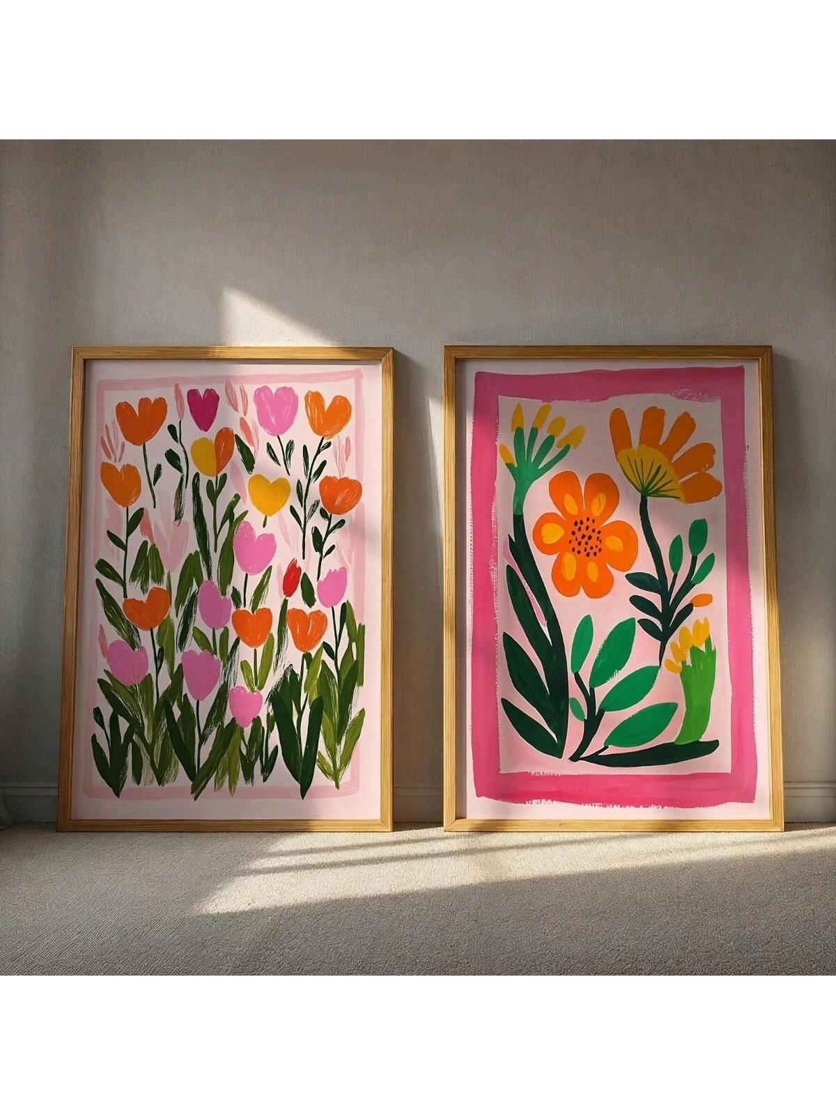 لوحتان جداريتان من القماش بدون إطار - ملصقات نباتية زهرية بنمط الدوبامين