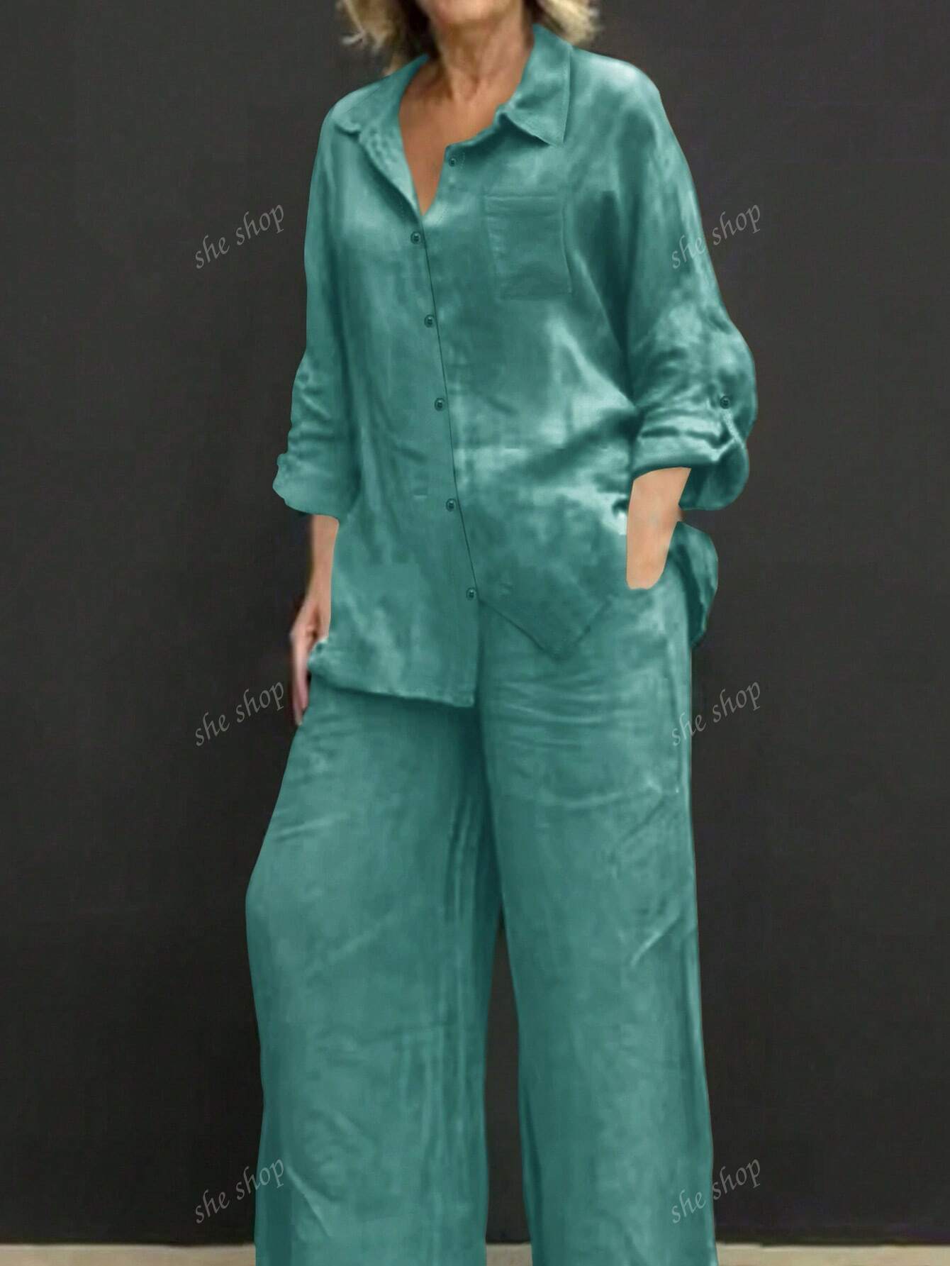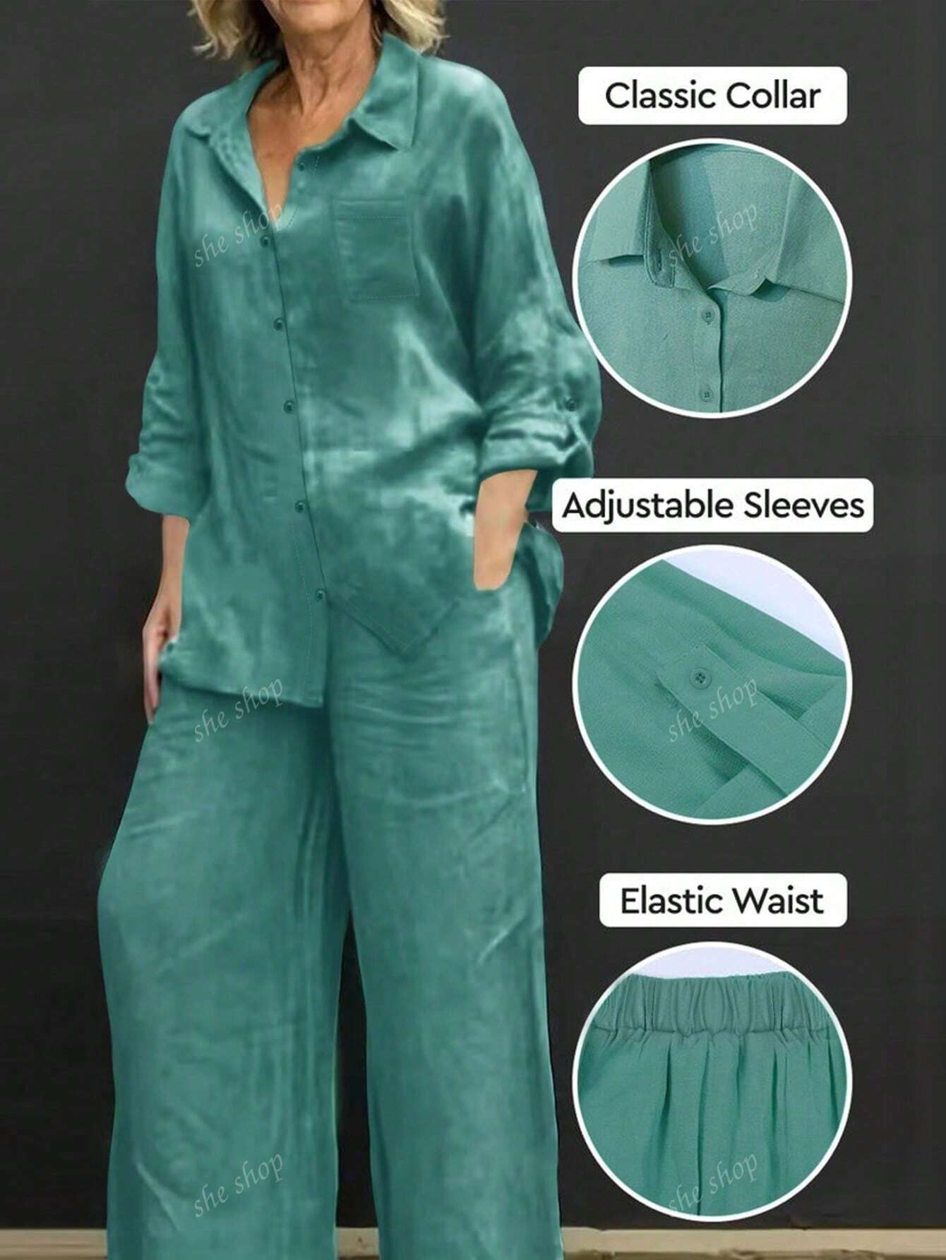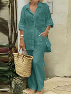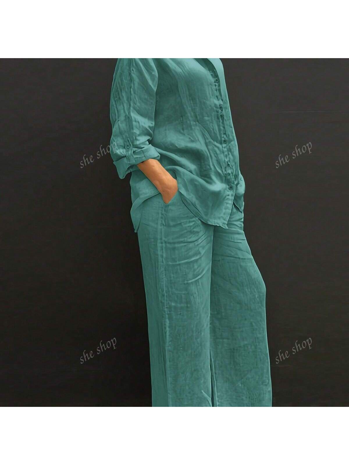 طقم مكون من قطعتين: قميص بولو بياقة عادية وبنطال فضفاض بخصر مطاطي، بلوزة قميص أنيقة متعددة الاستخدامات بلون موحد.