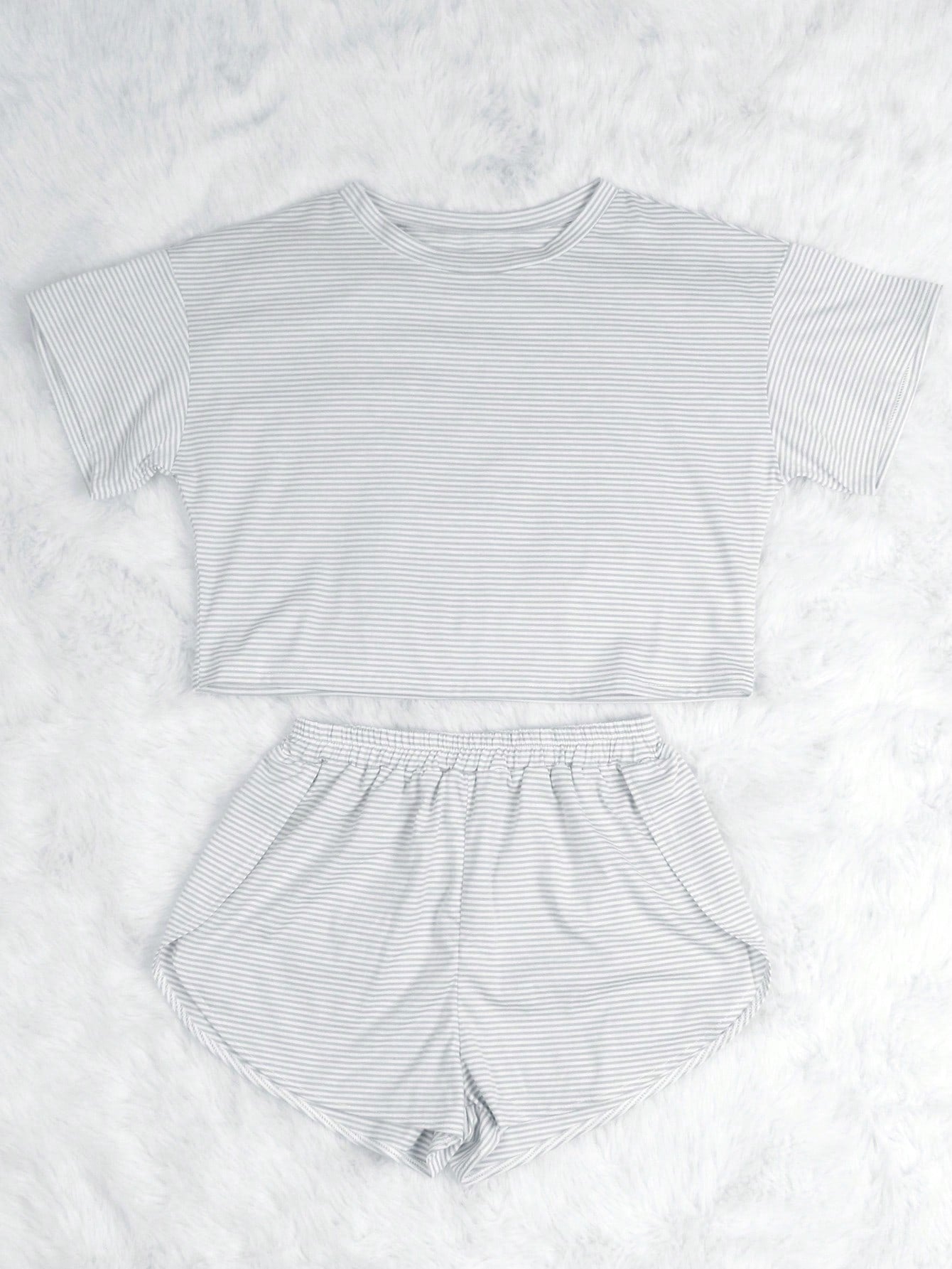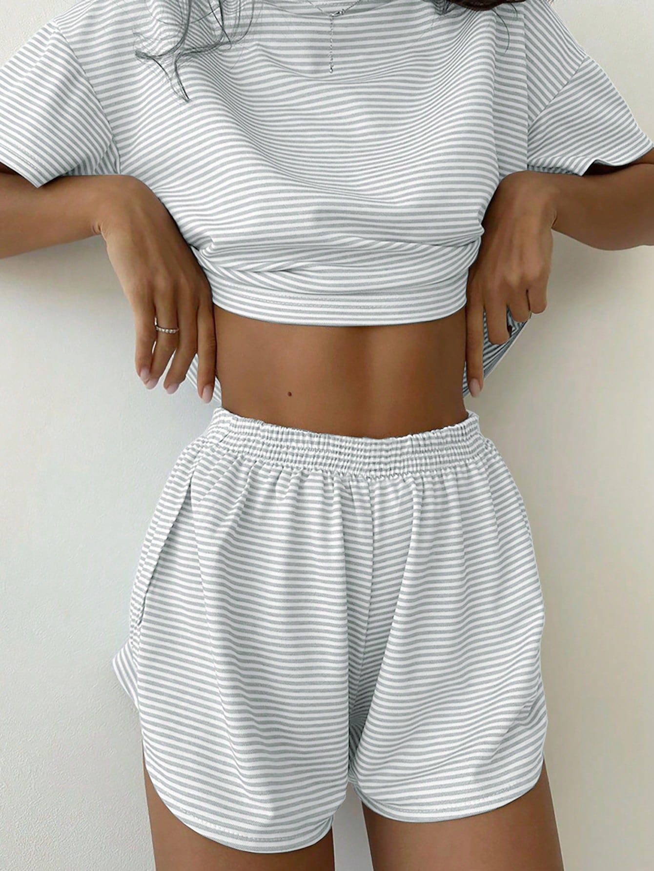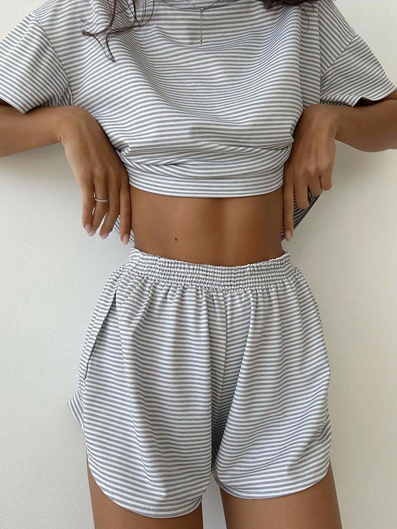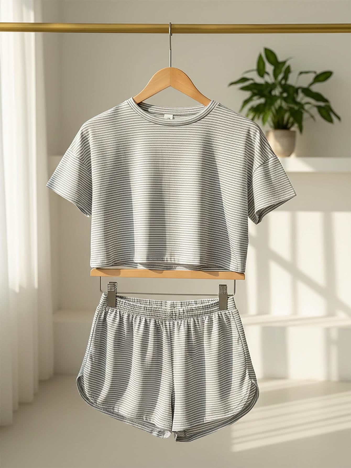 طقم من قطعتين، بلوزة محبوكة فضفاضة بتصميم مخطط وحافة جانبية مشقوقة.