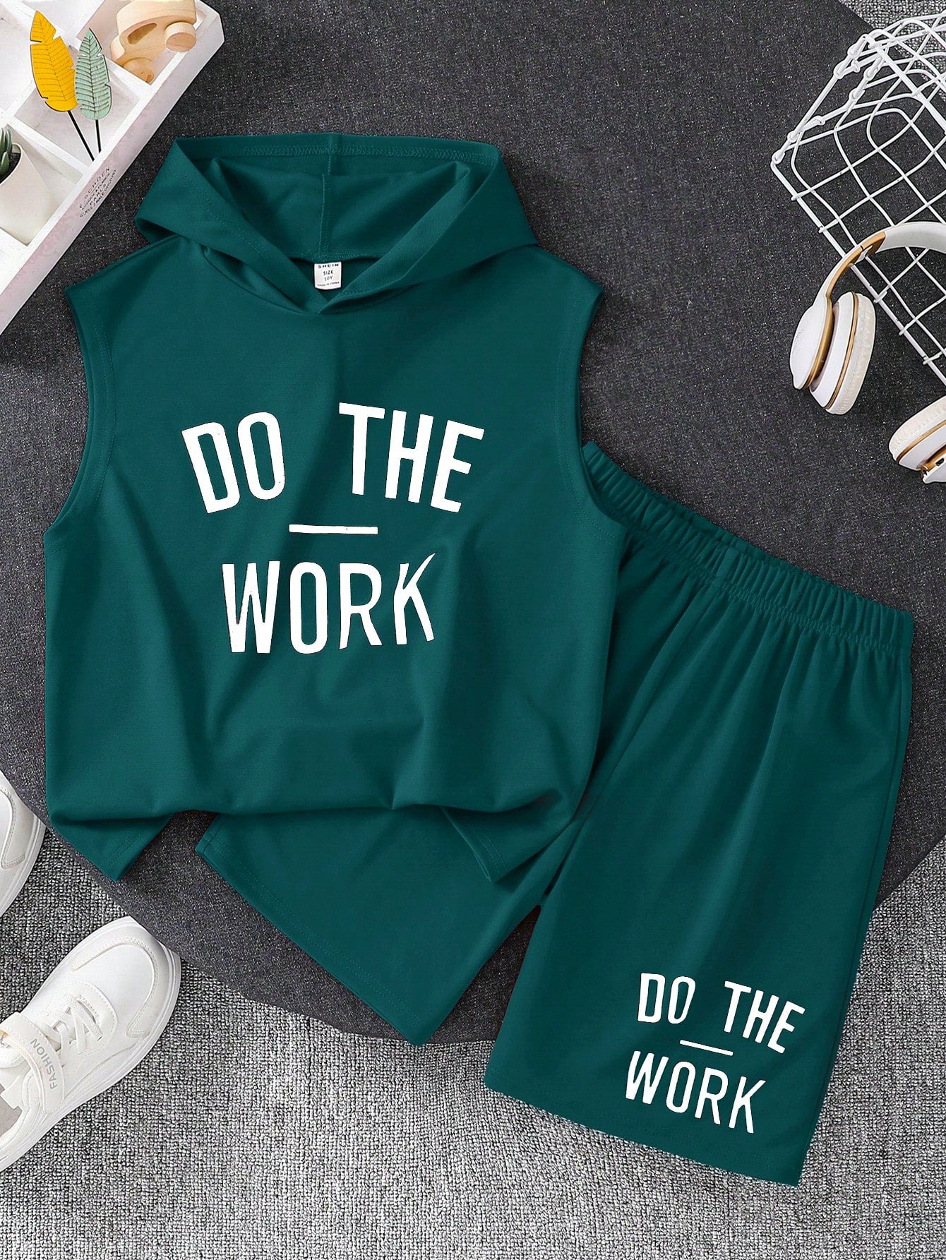 2pcs/Set Tween Boy Letter Print Loose Hoodie Vest And Shorts Set, Suitable For Summer Outgoing, Sports,
