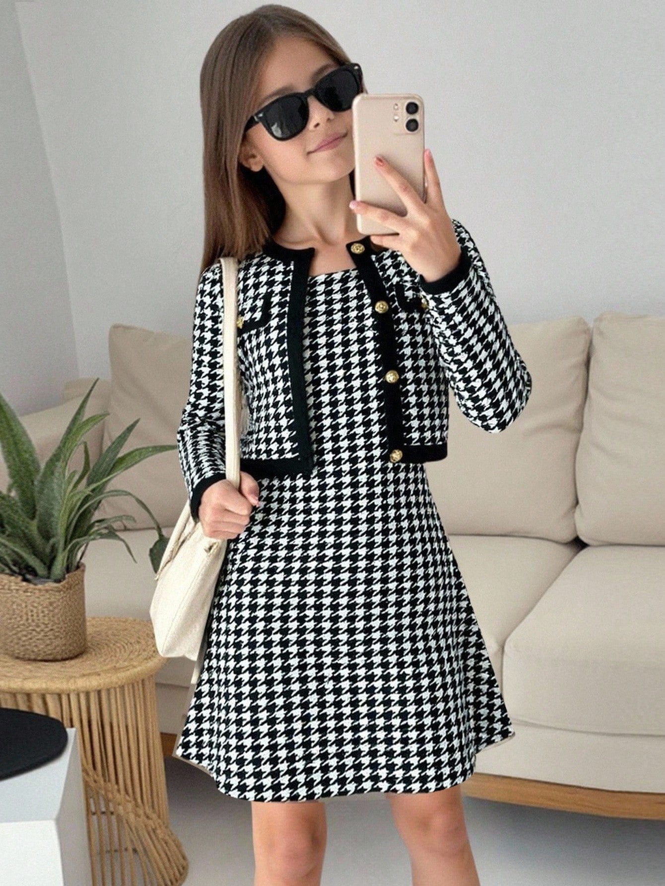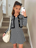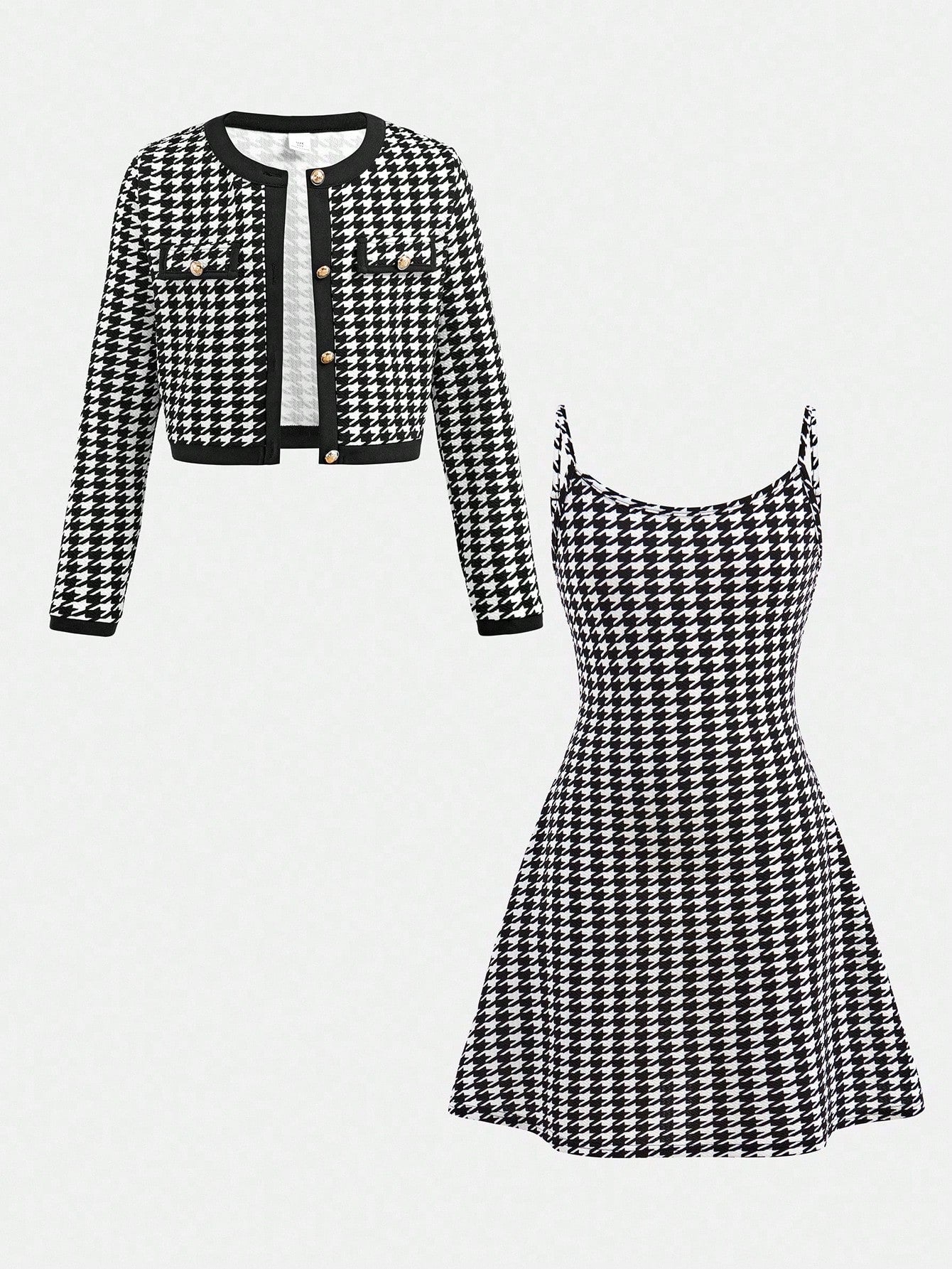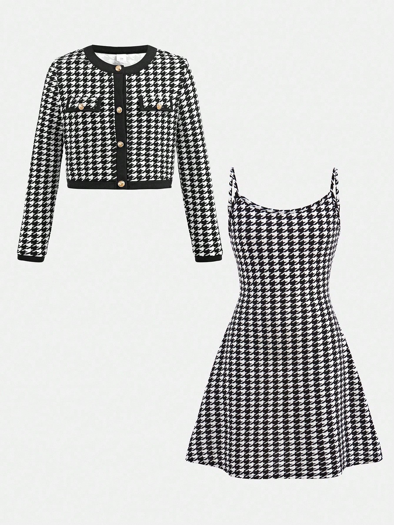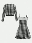 طقم من قطعتين: فستان داخلي بنقشة مربعات فرنسية وجاكيت بلون متباين للفتيات المراهقات