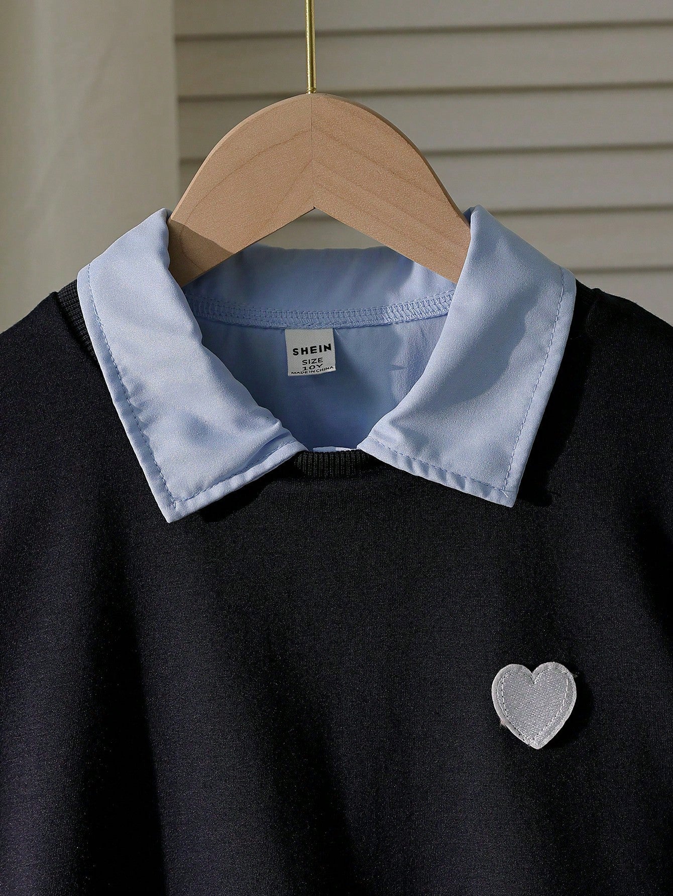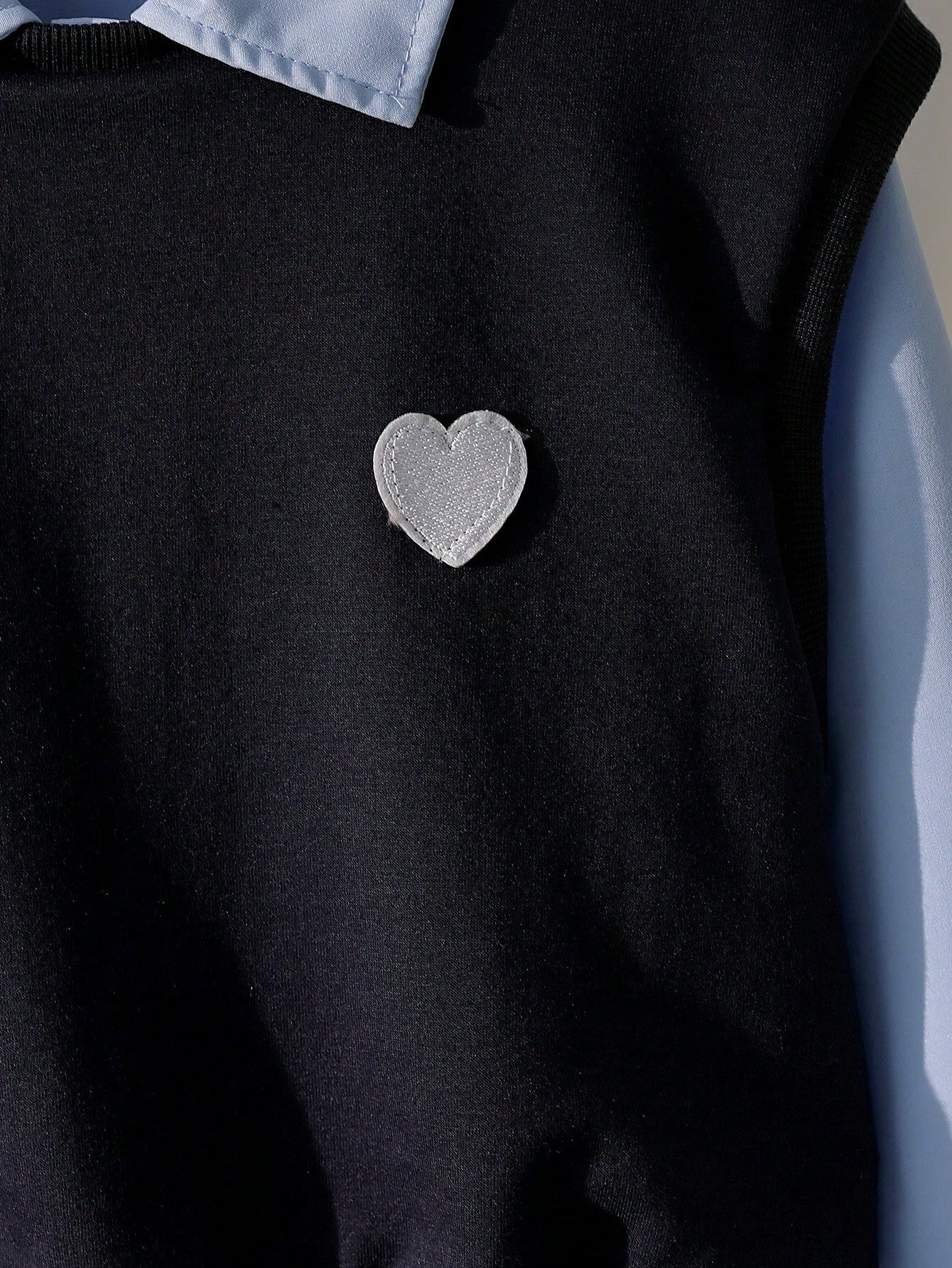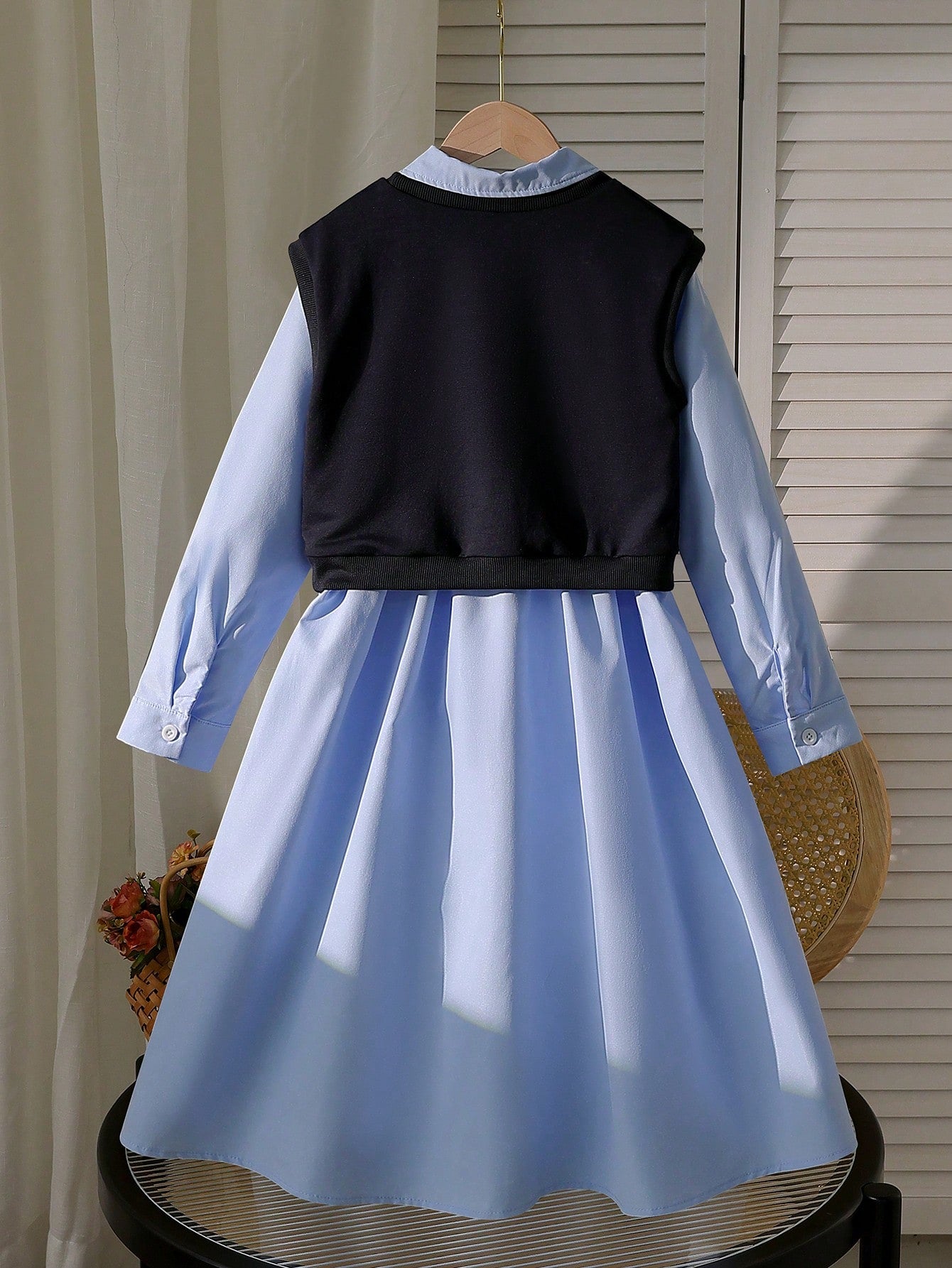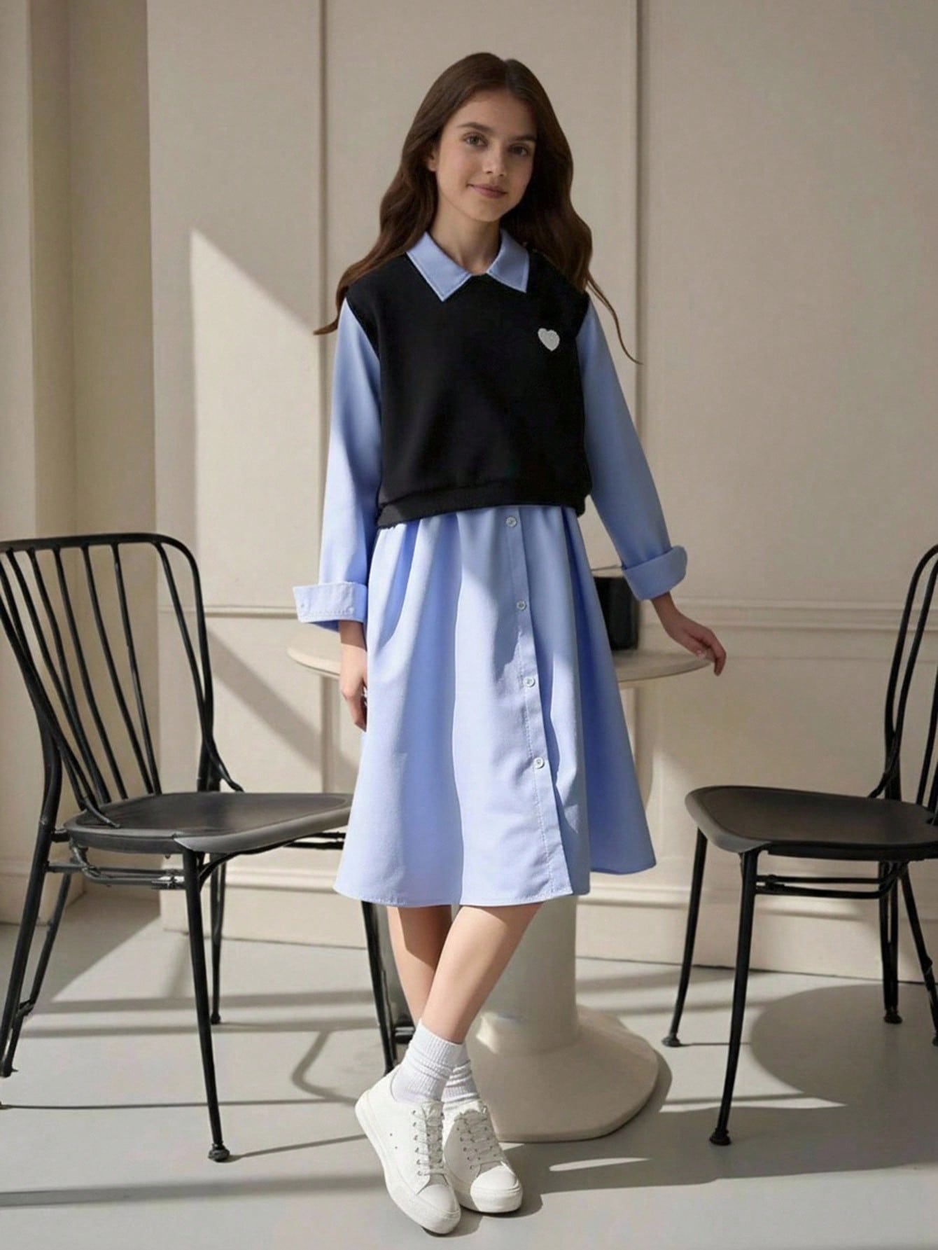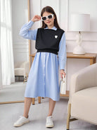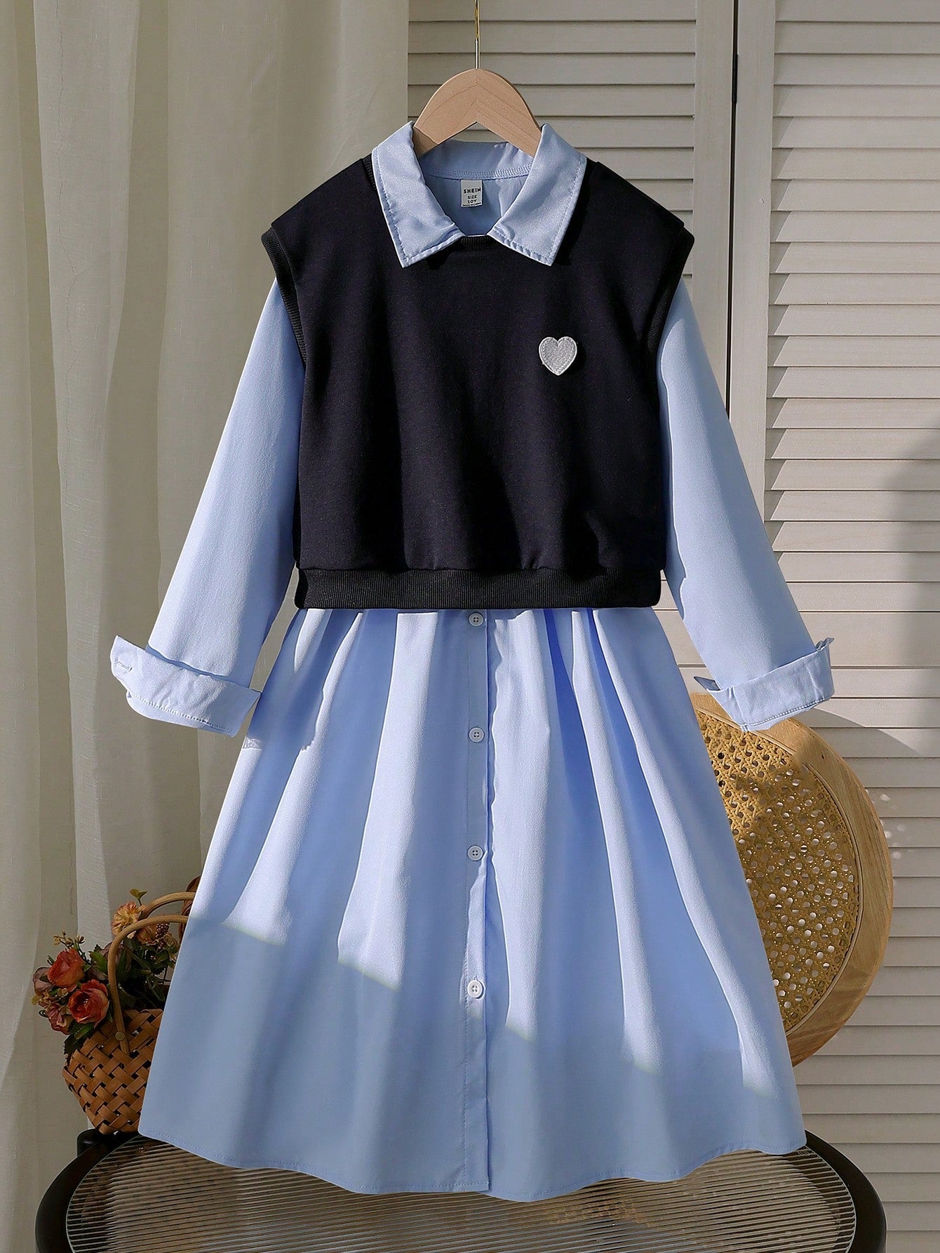 طقم من قطعتين: فستان بأكمام طويلة وياقة مطوية للبنات الصغيرات، وسترة بدون أكمام مزينة بطبعة قلوب.