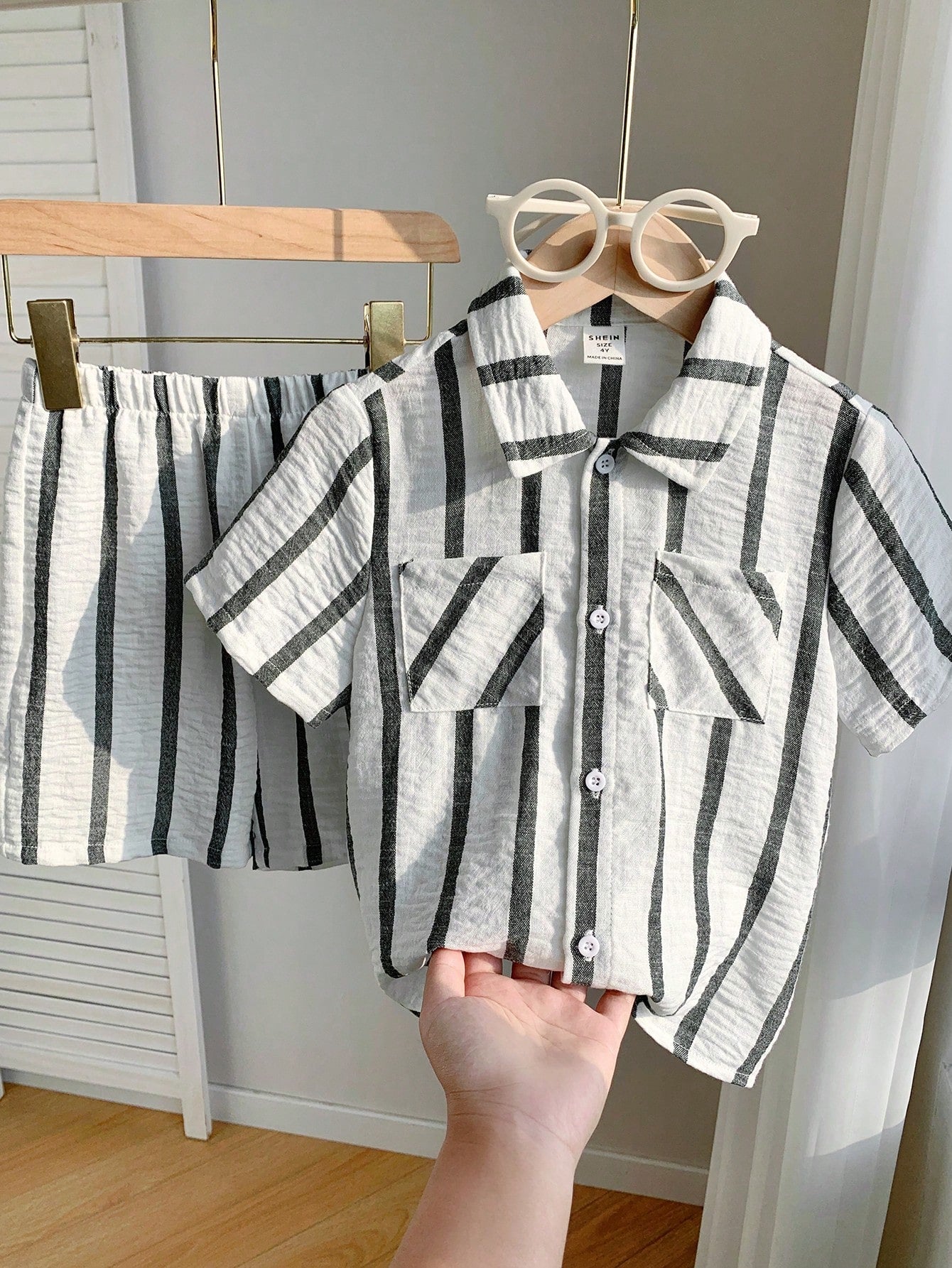 طقم مكون من قطعتين من قميص مخطط عمودي مريح بأكمام قصيرة وشورت مخطط للأولاد الصغار، ملابس صيفية