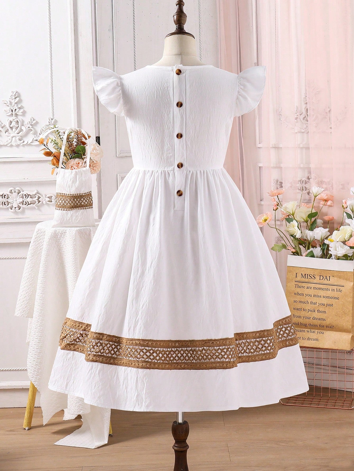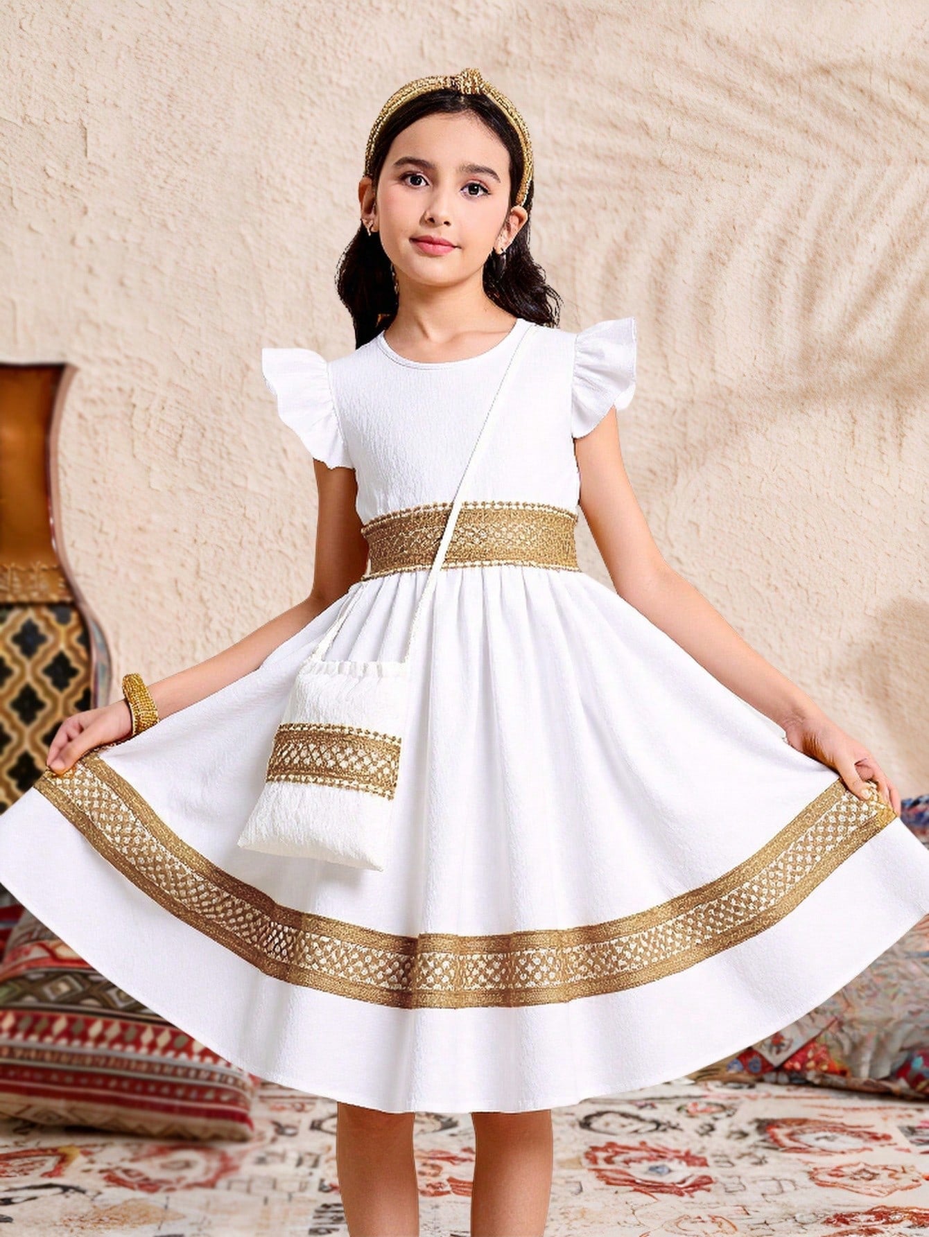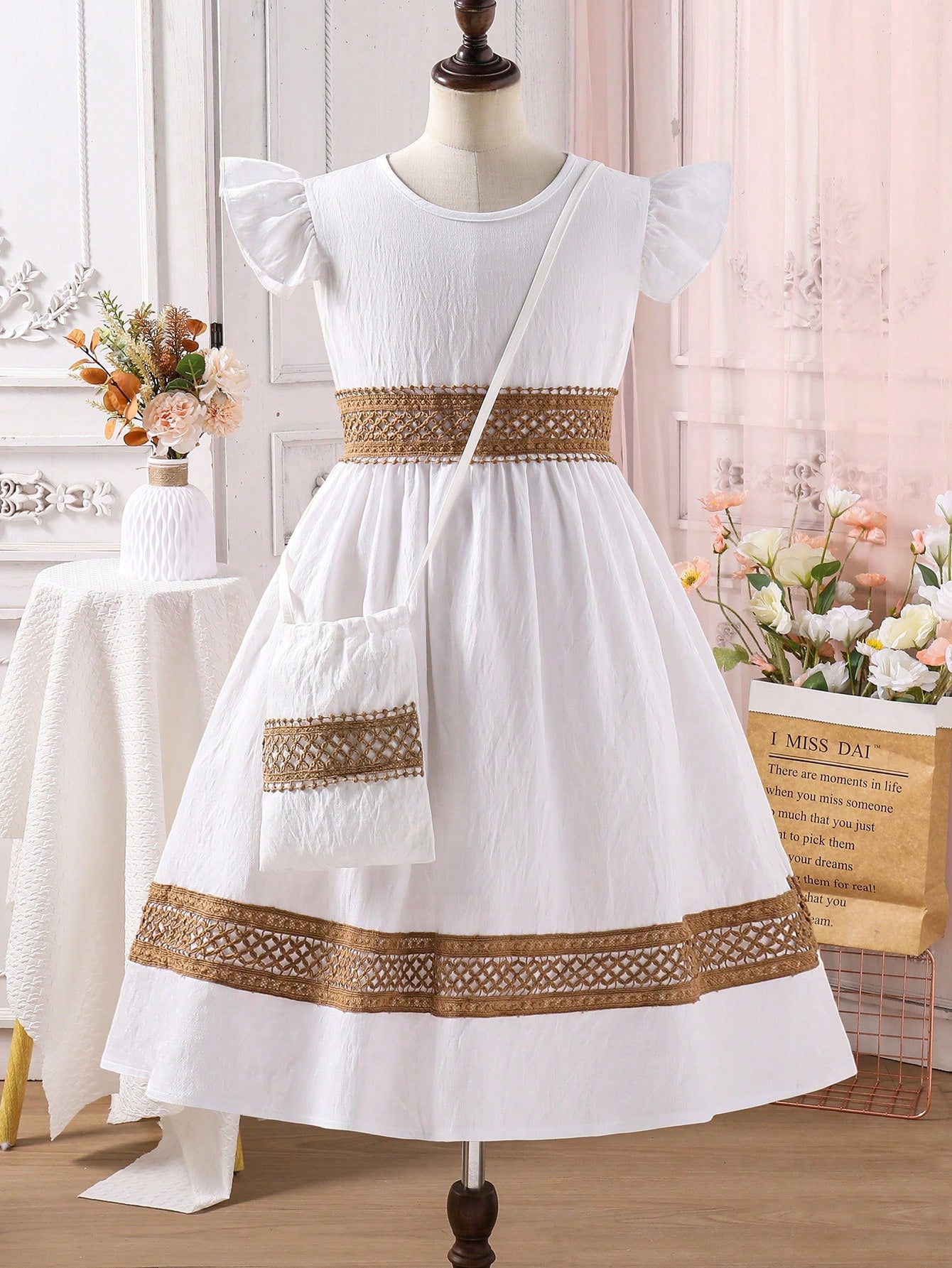 2pcs Tween Girls Cap Sleeve Floral Lace Trim Round Neck Dress + Crossbody Bag, Vacation Style, Spring/Summer
