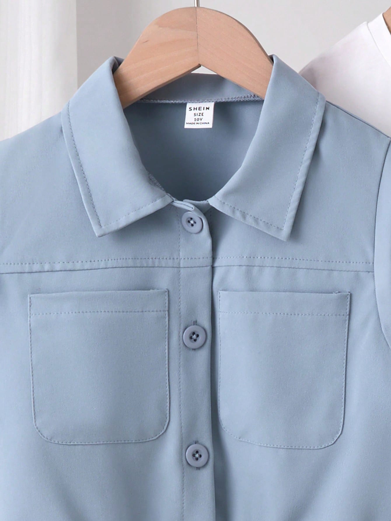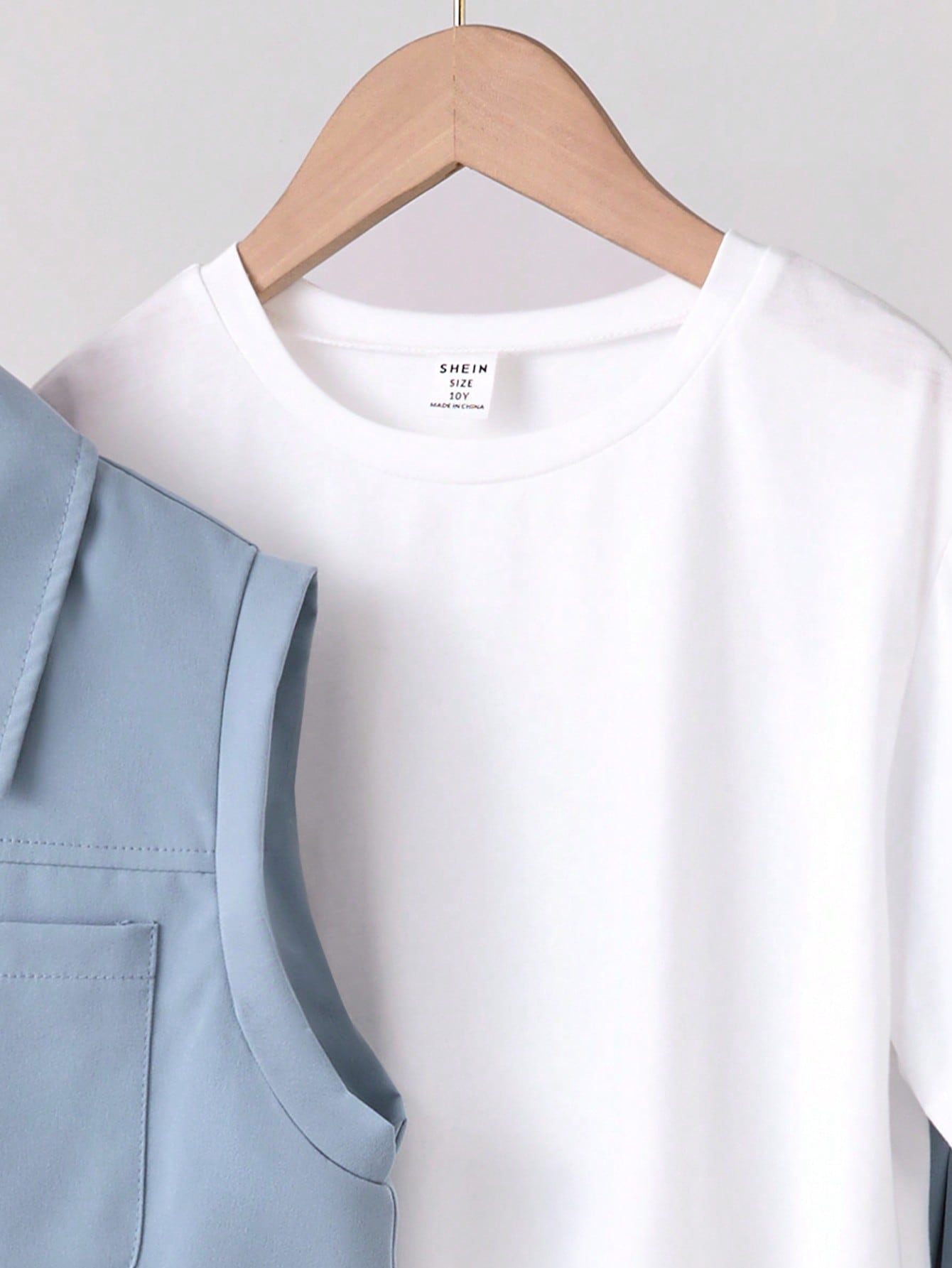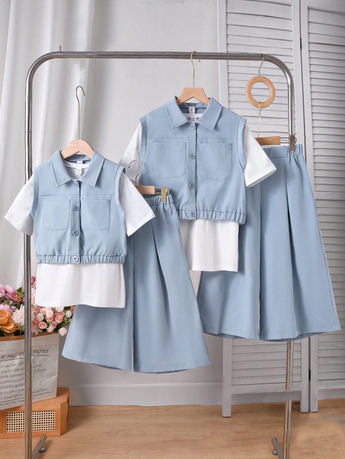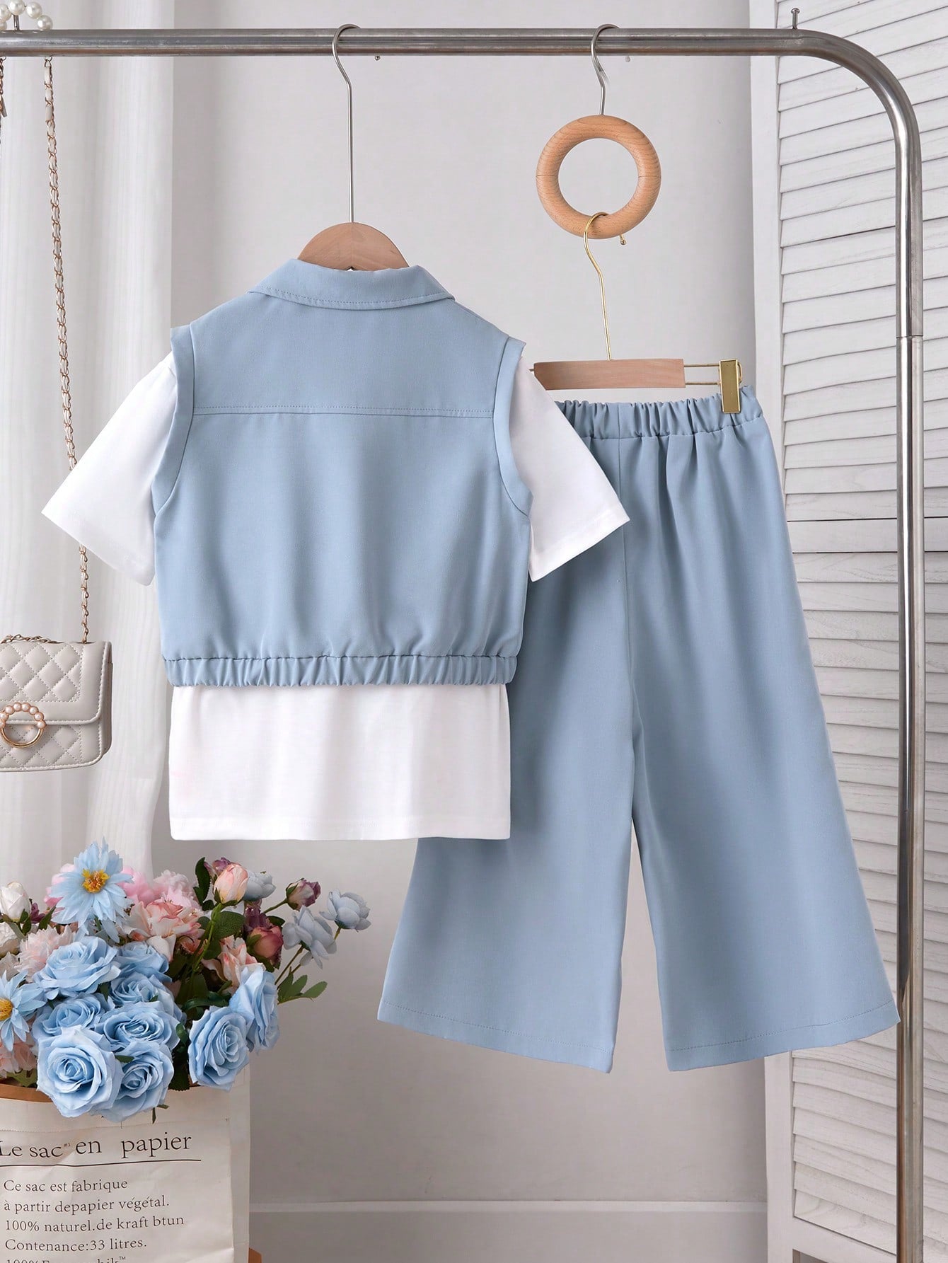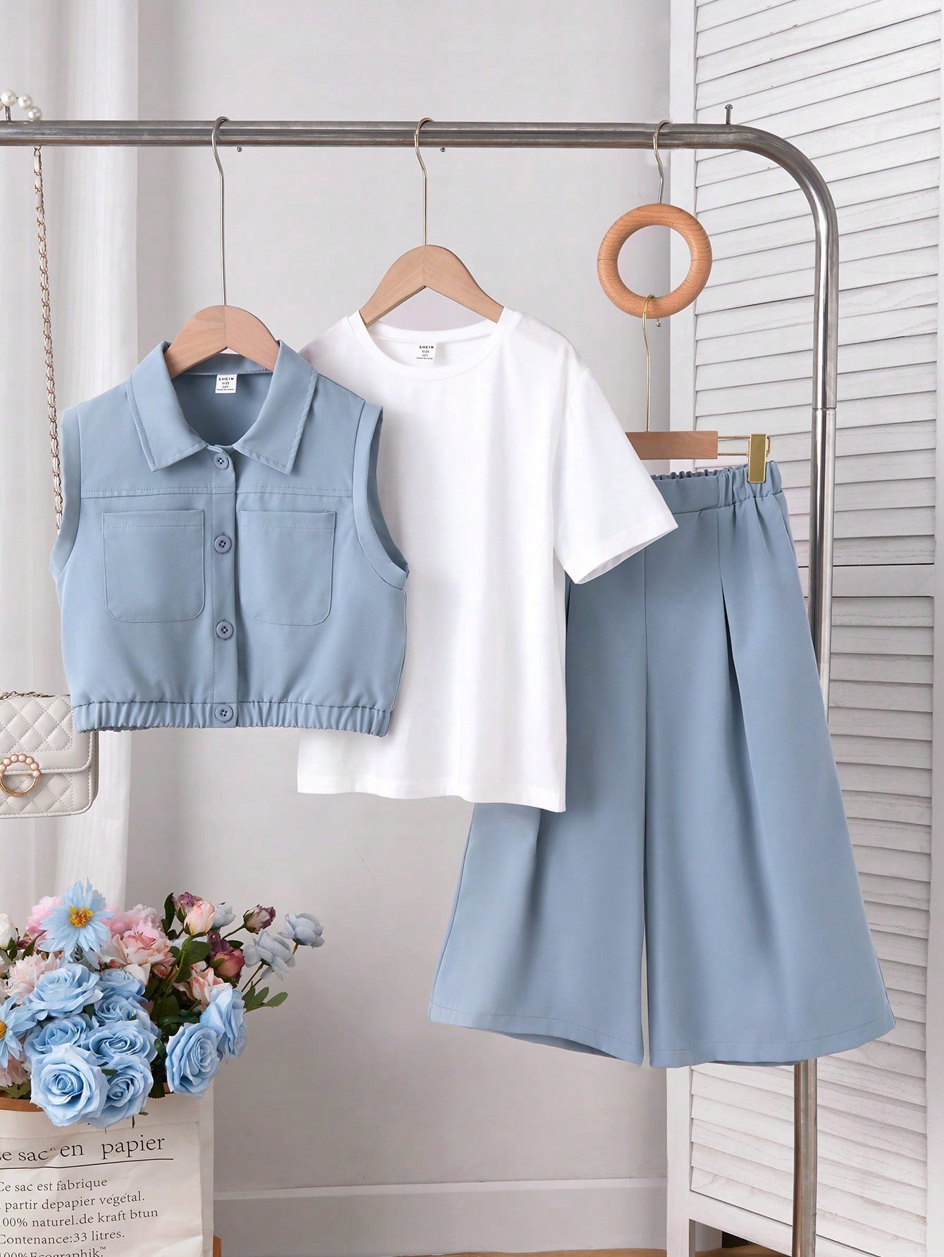 kids 3Pcs Girls Outfit Set: Sleeveless Collared Pocket Vest + Casual Top + Casual Wide Leg Pants