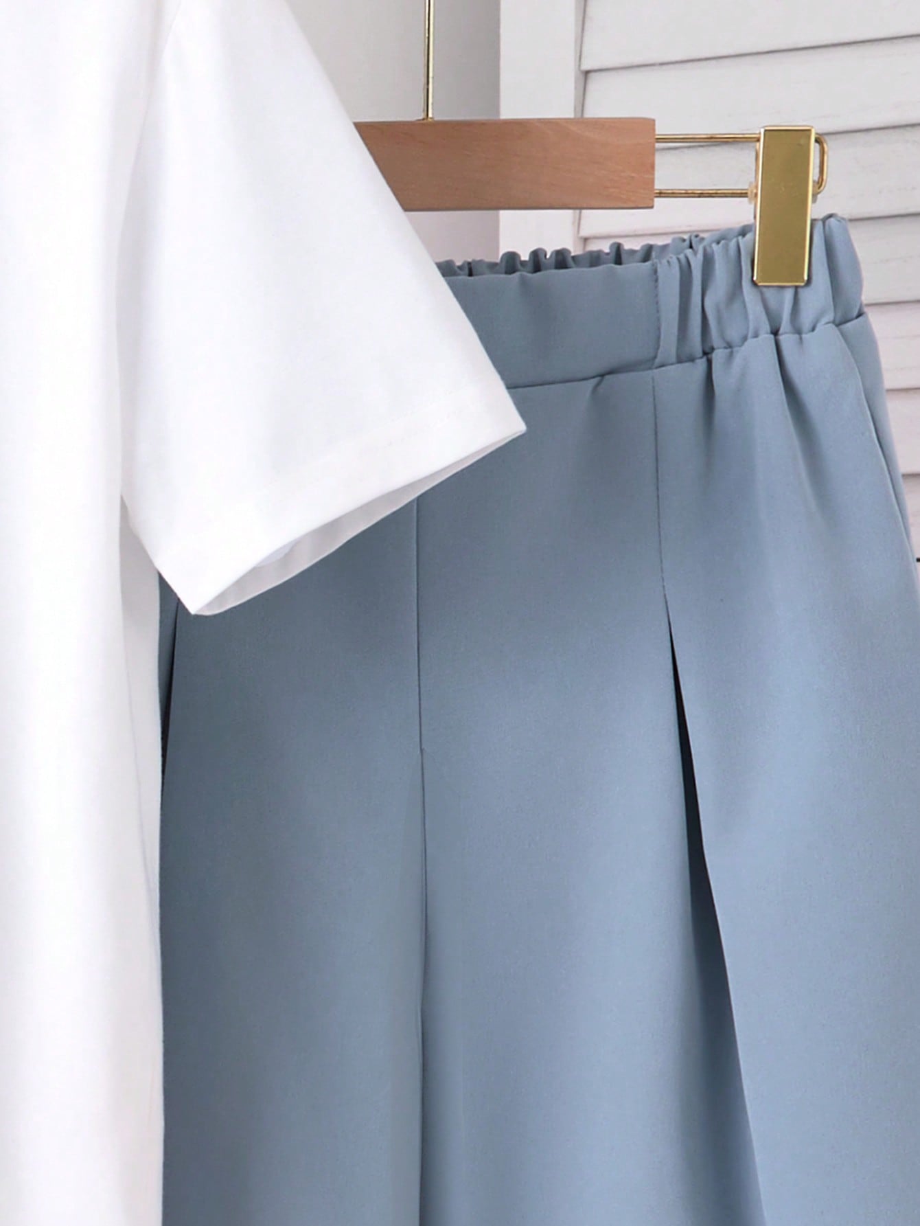طقم ملابس للبنات مكون من 3 قطع: سترة بدون أكمام وياقة وجيب + بلوزة كاجوال + بنطال واسع الساق