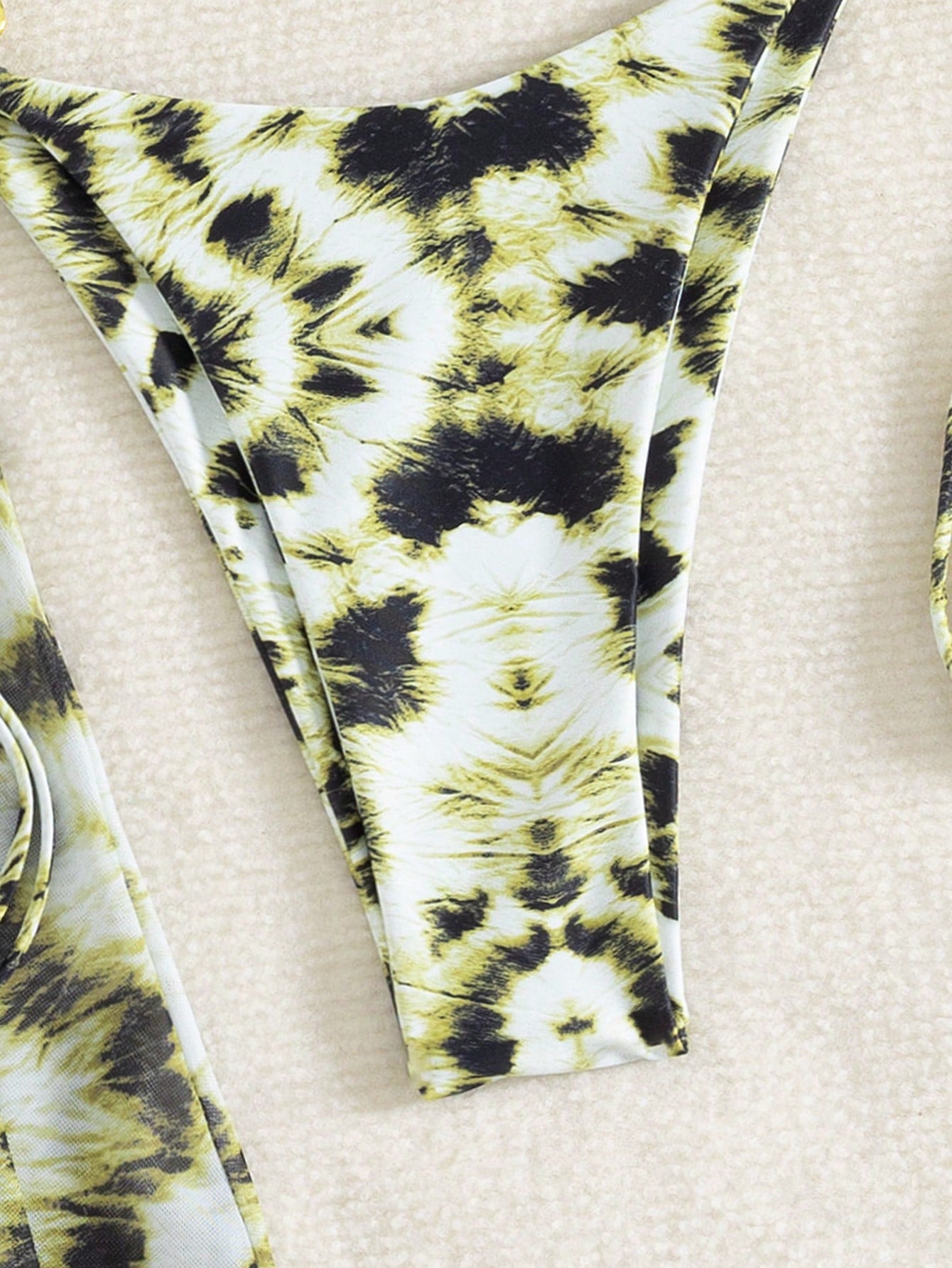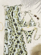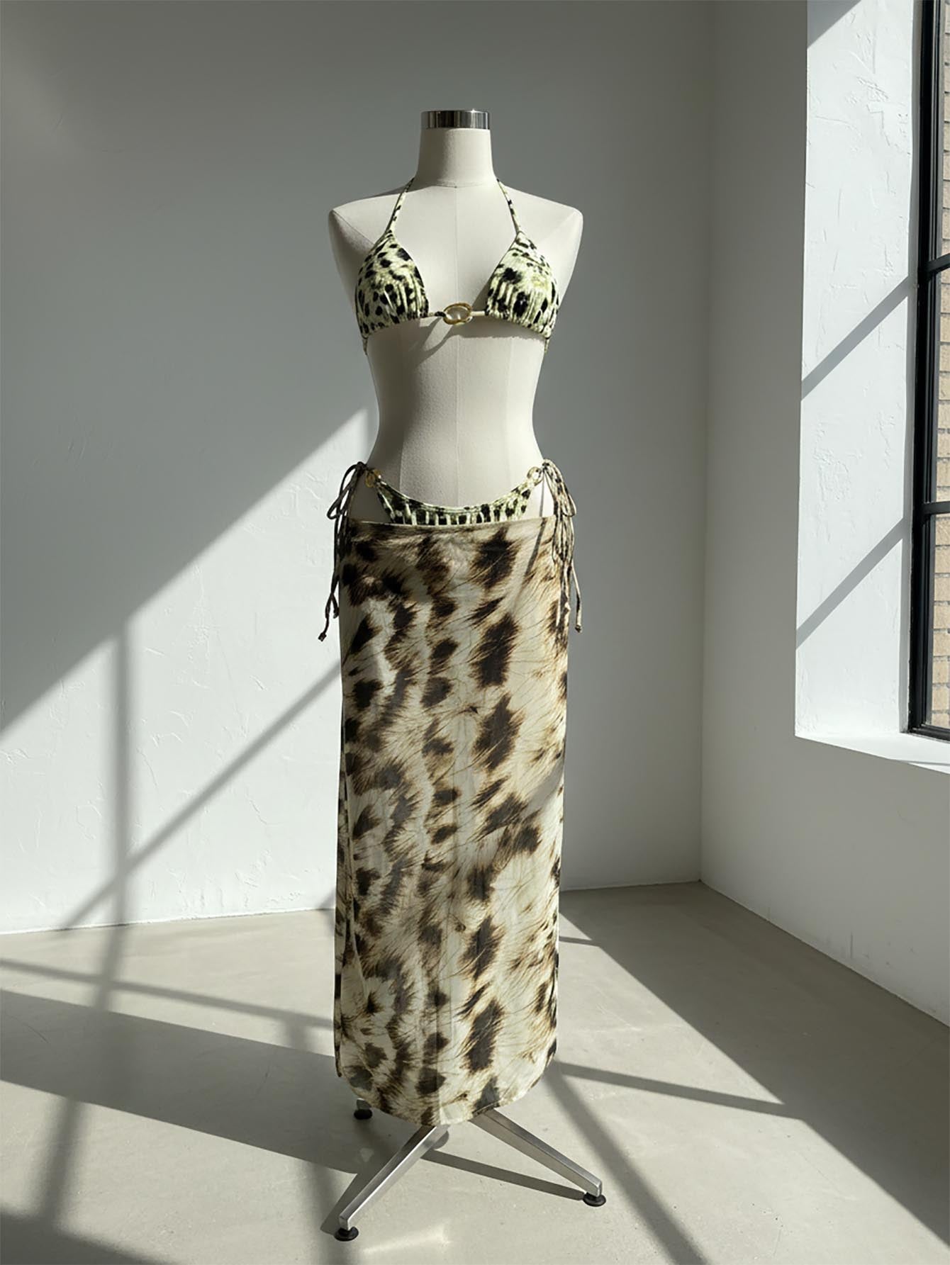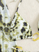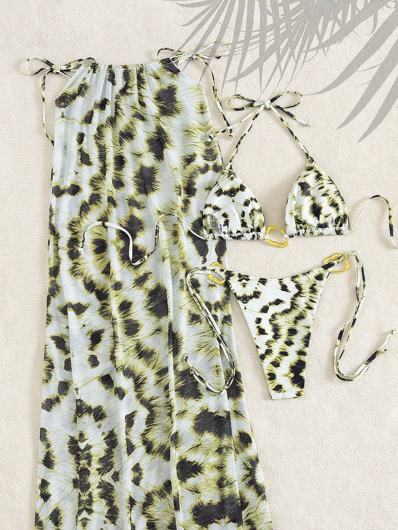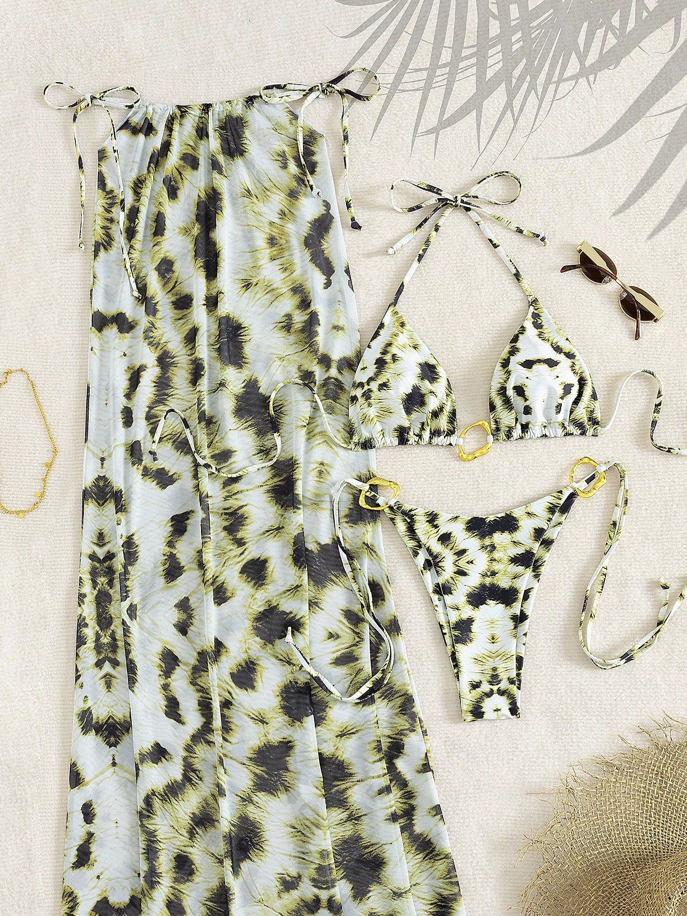 طقم بيكيني نسائي مثير مكون من 3 قطع، مزين بحلقات معدنية وطبعة ربطة العنق، مع بلوزة مكشوفة الظهر برباط وتنورة شبكية.