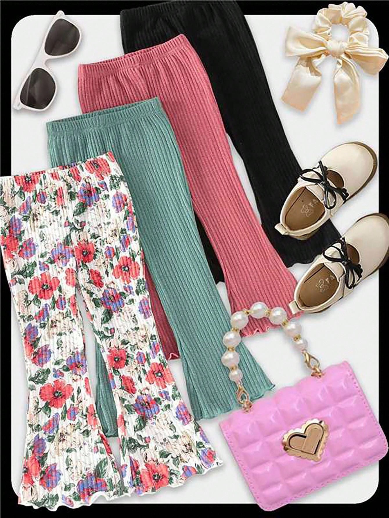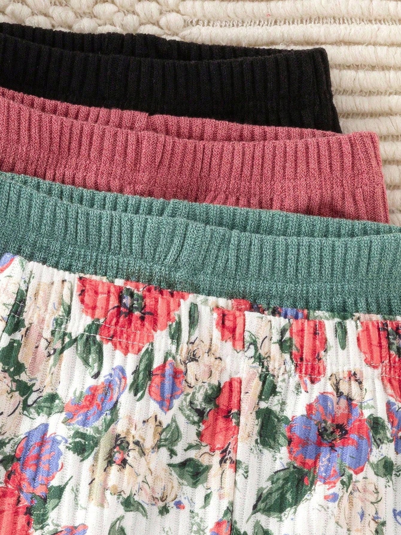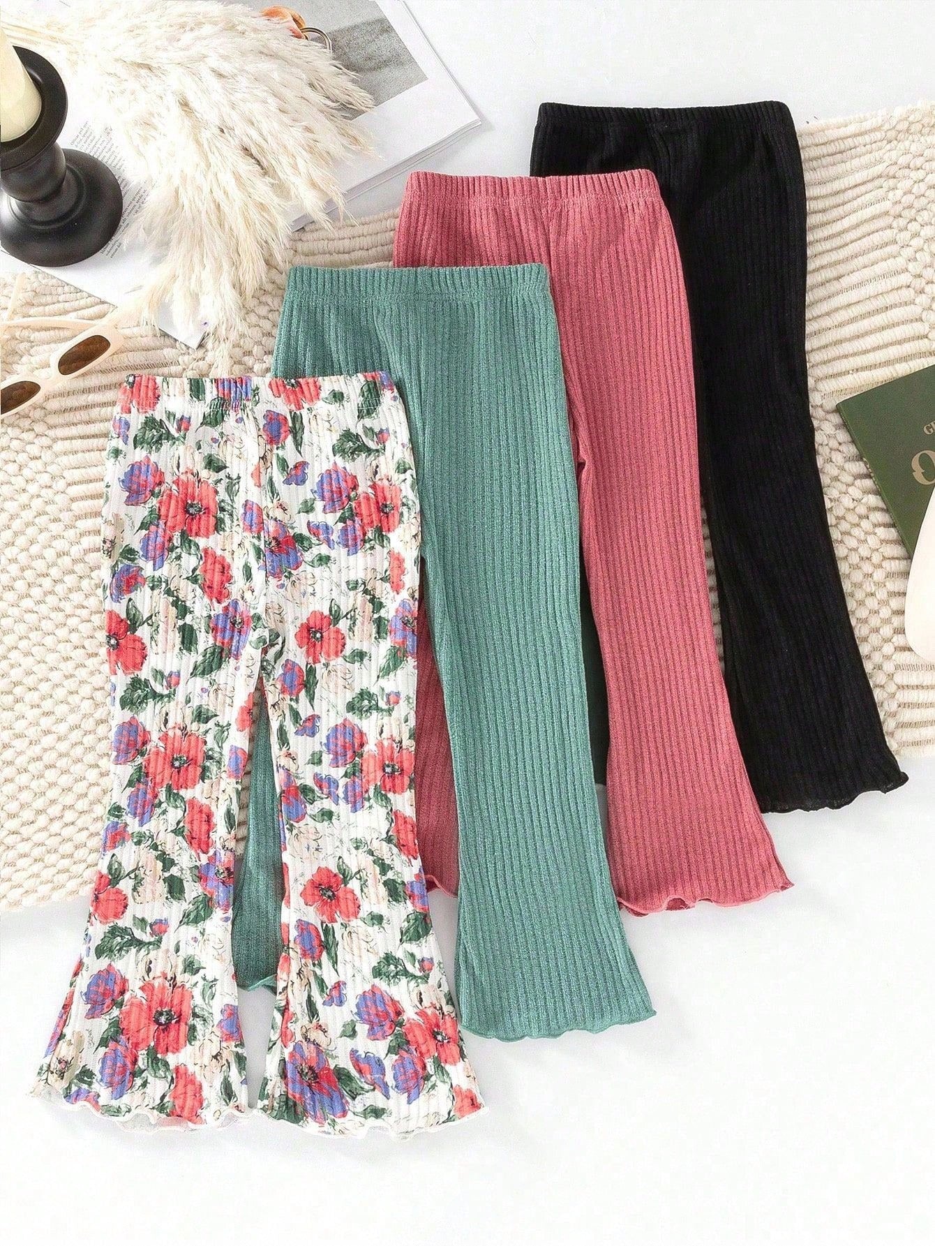 طقم مكون من 4 قطع: بنطال واسع مضلع مطبوع عليه زهور رقميًا، بنطال كاجوال للبنات الصغيرات.