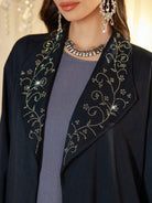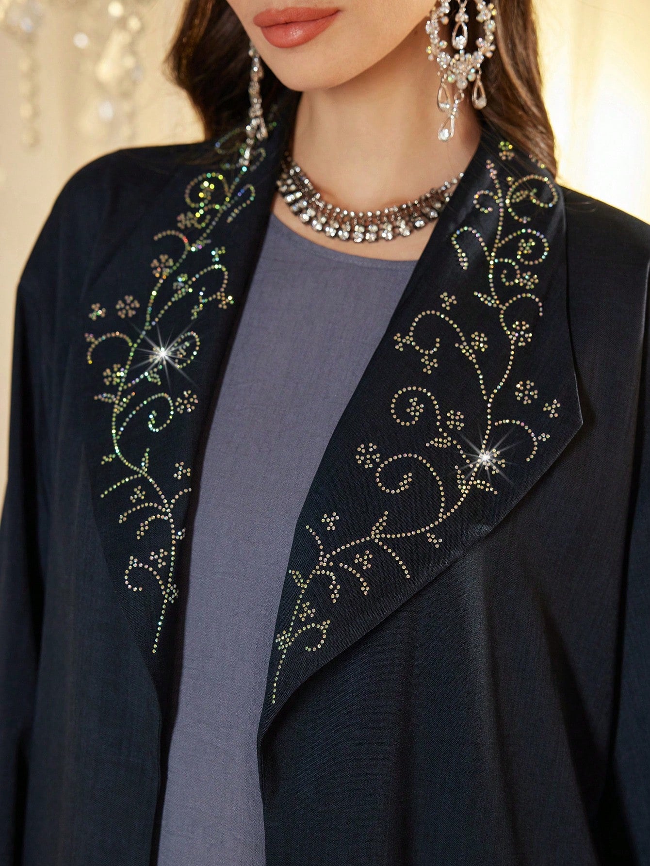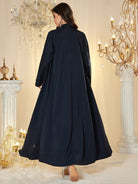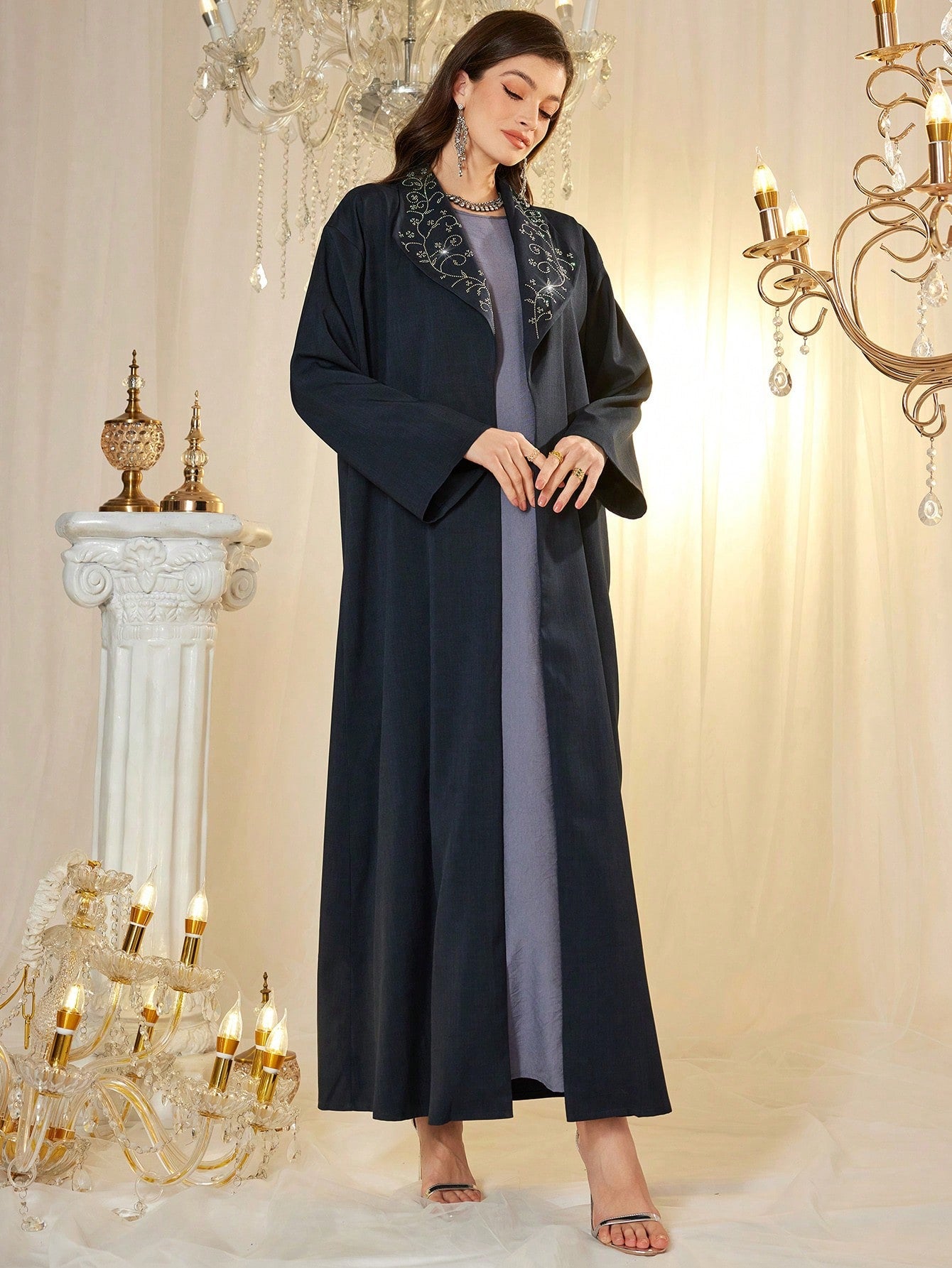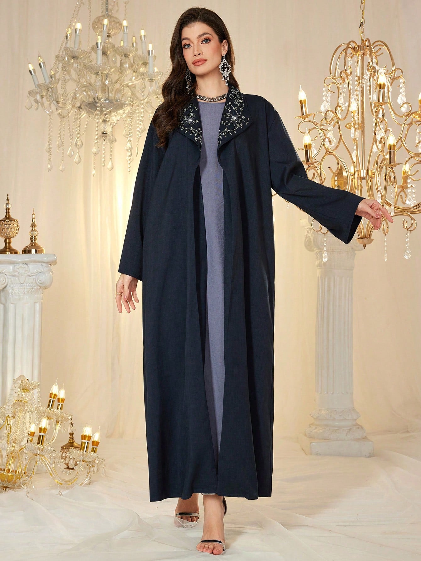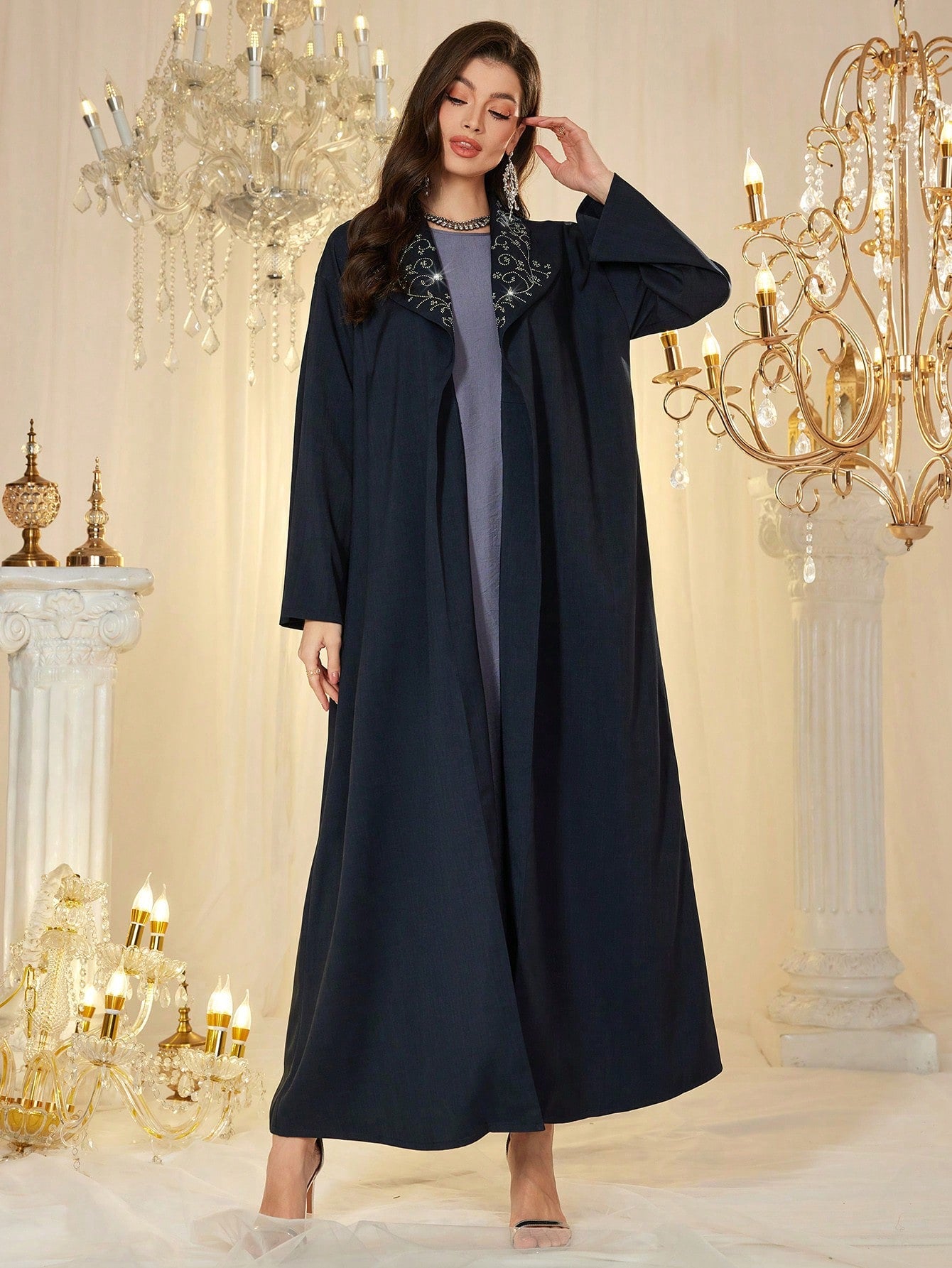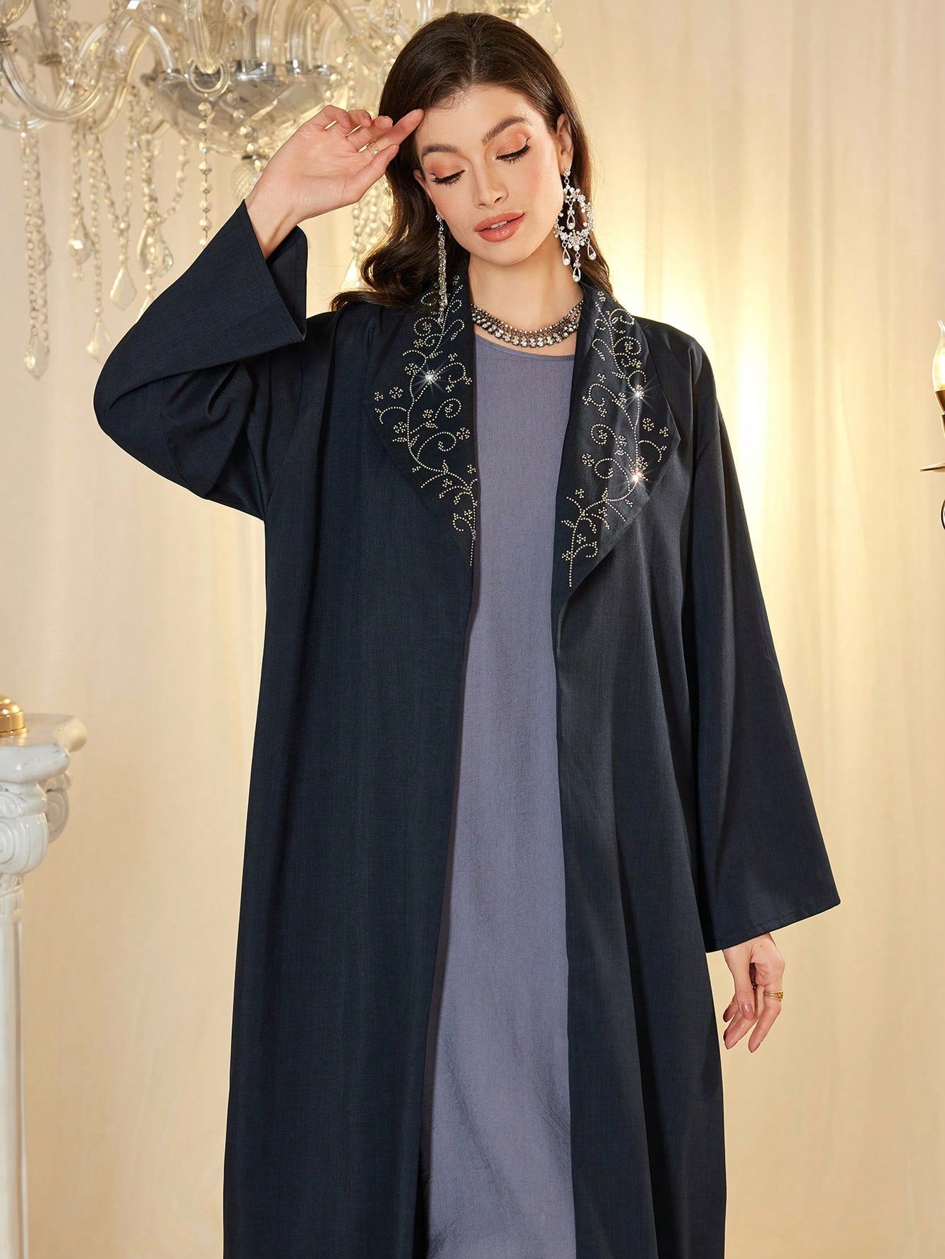 عباية النجمة النسائية بغطاء للرأس، بتصميم فضفاض، مزينة بأحجار الراين على الياقة، أنيقة وجذابة