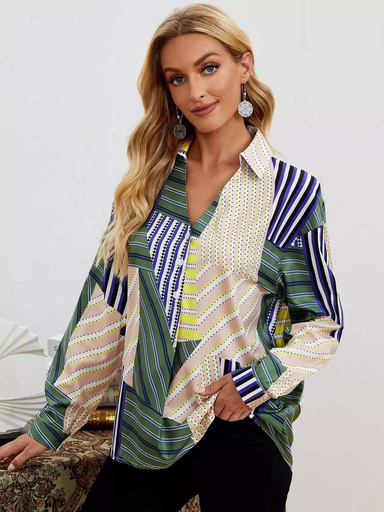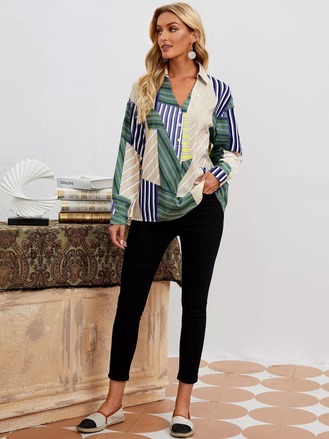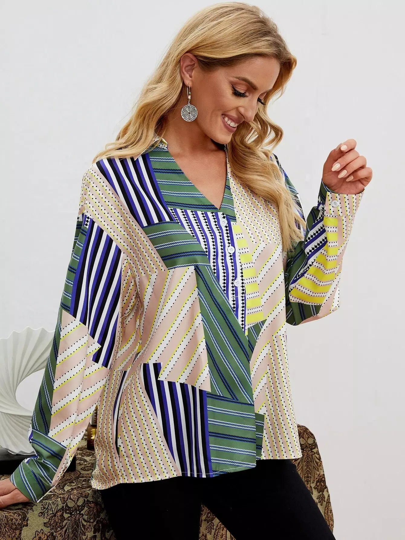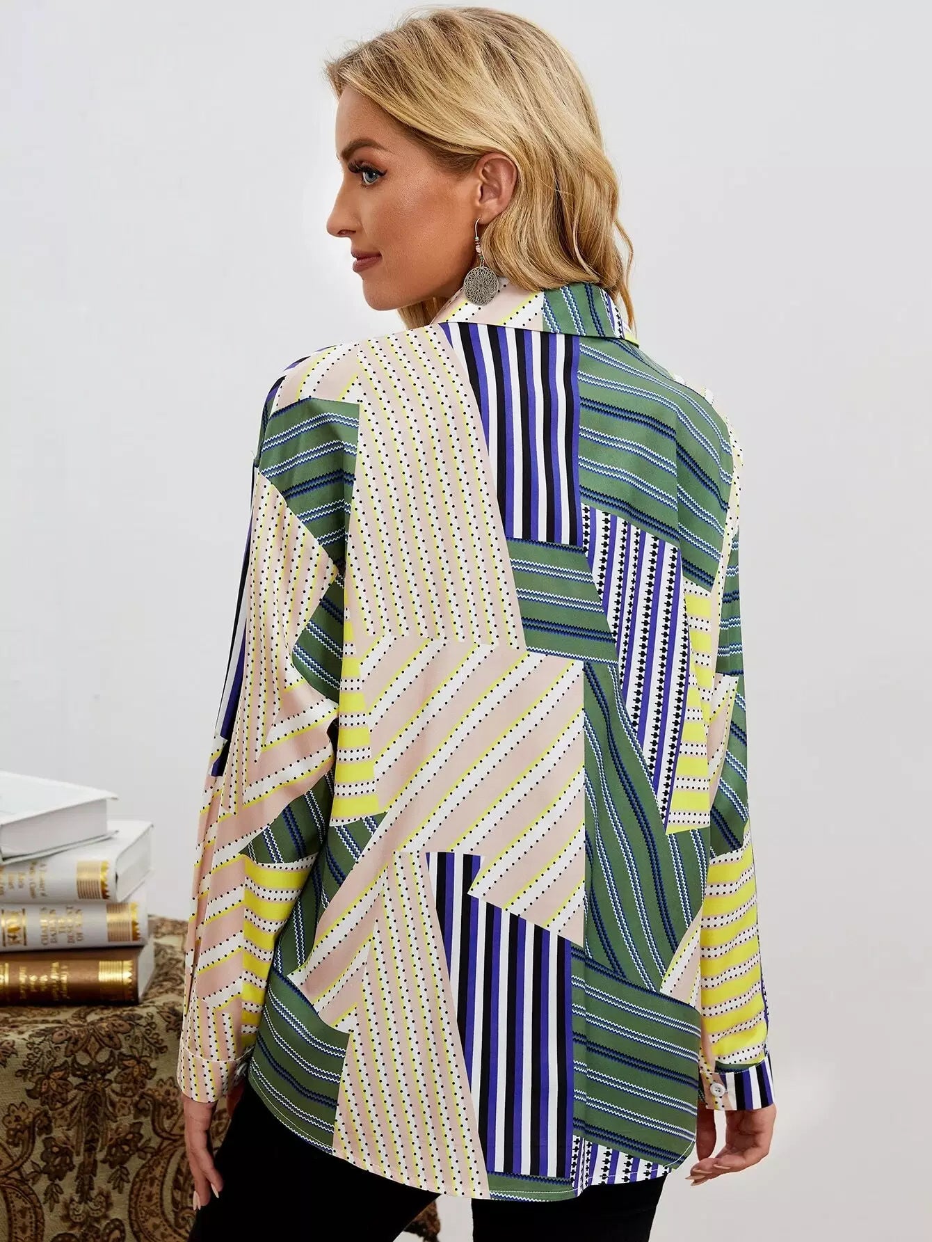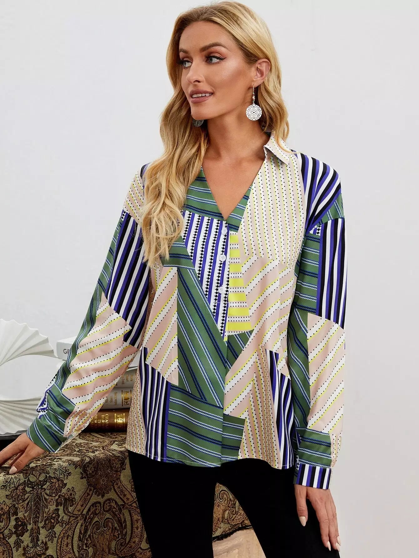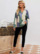 قميص بأزرار أمامية بطبعة هندسية كاملة