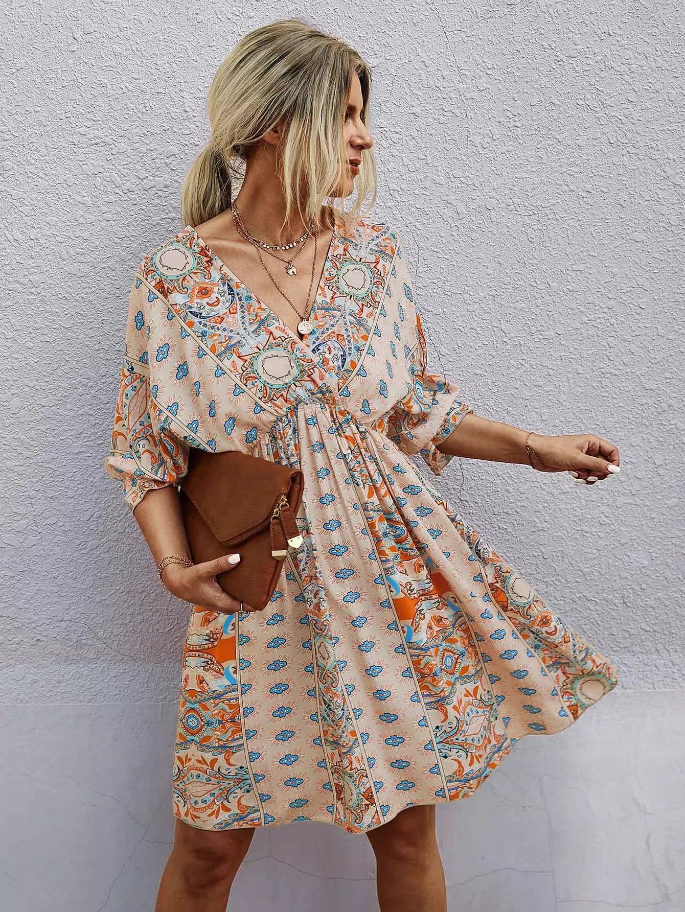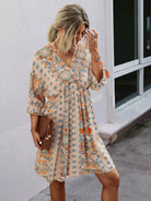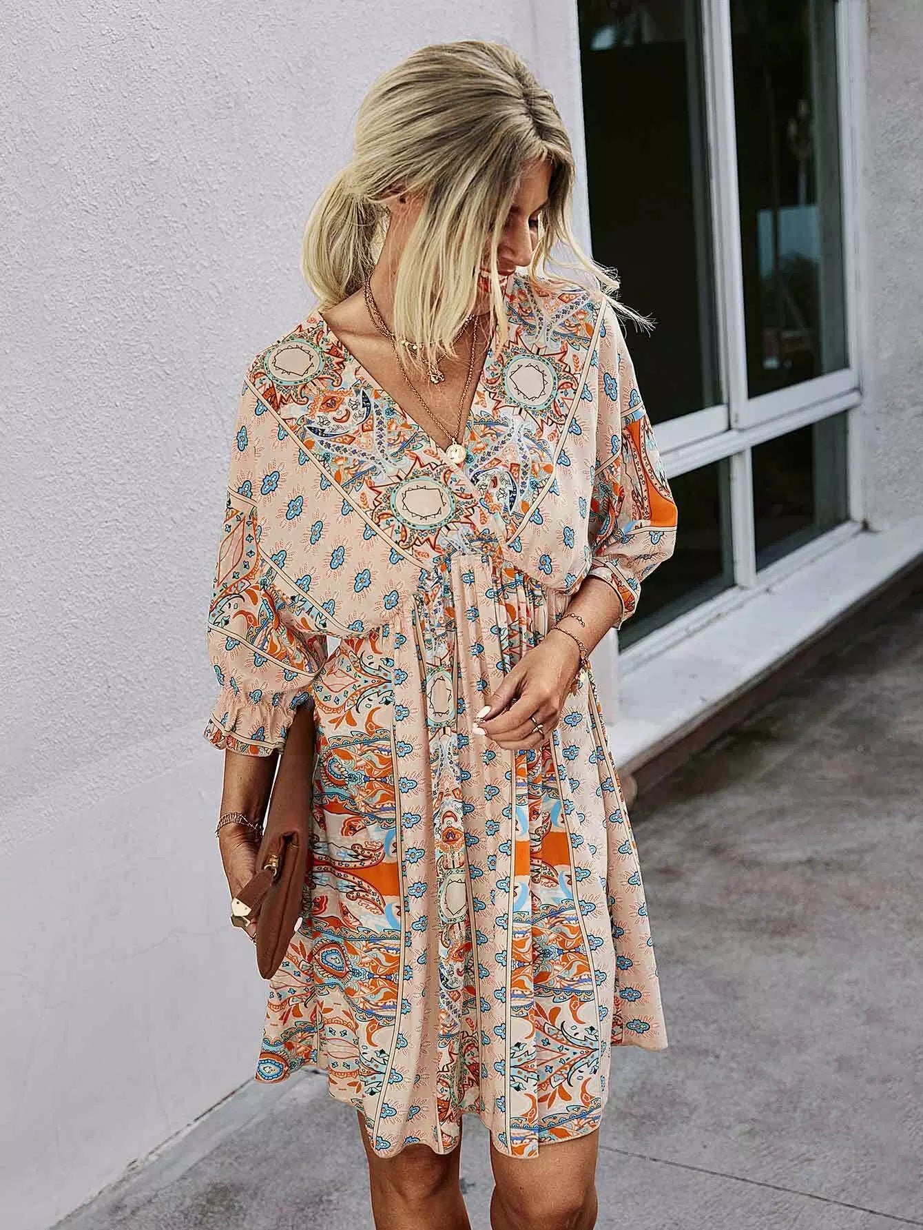 فستان مطبوع بالكامل بطبعة ملفوفة على الرقبة وربطة عنق على الظهر