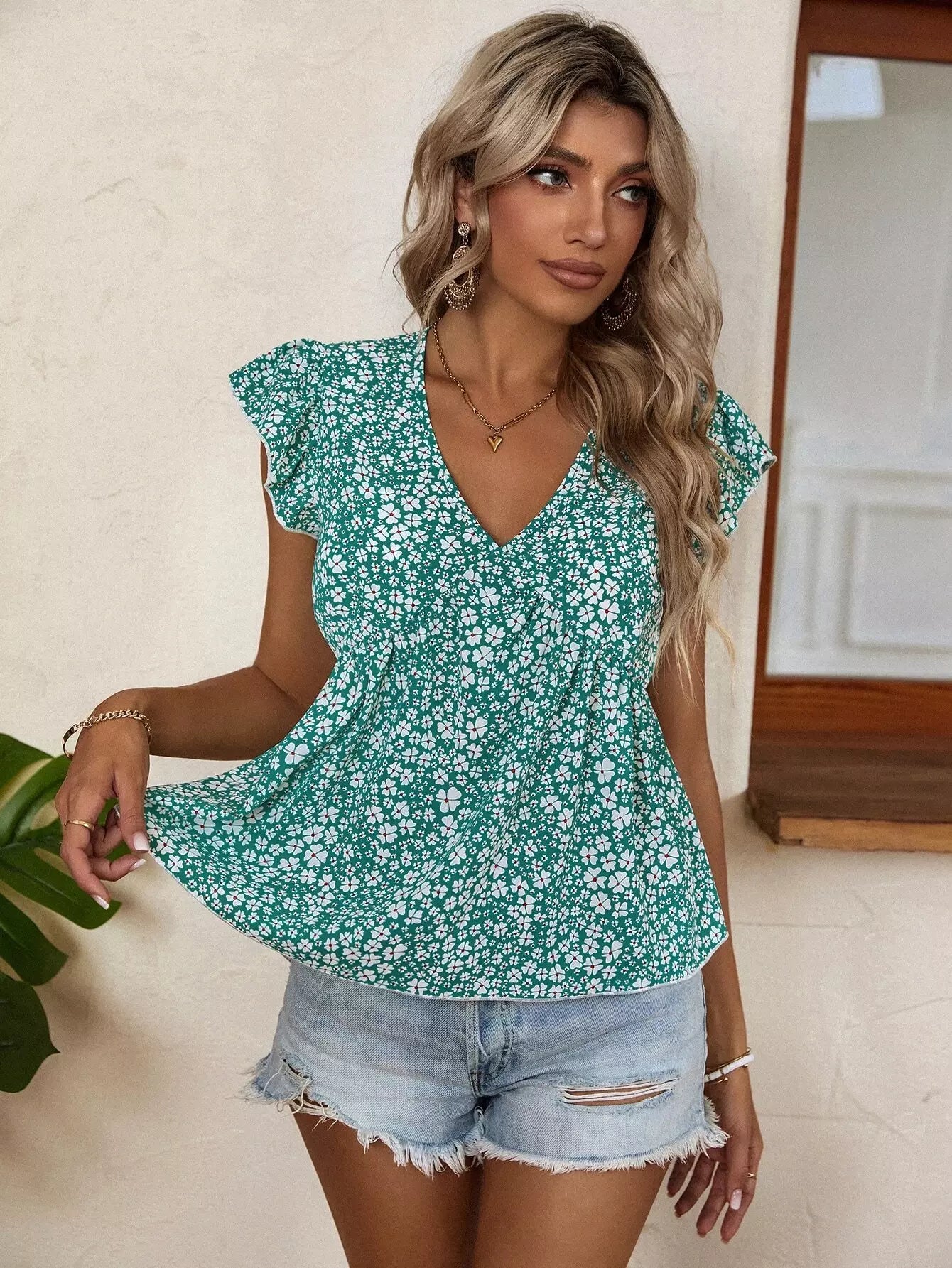 بلوزة بأكمام فراشة مطبوع عليها زهور بالكامل