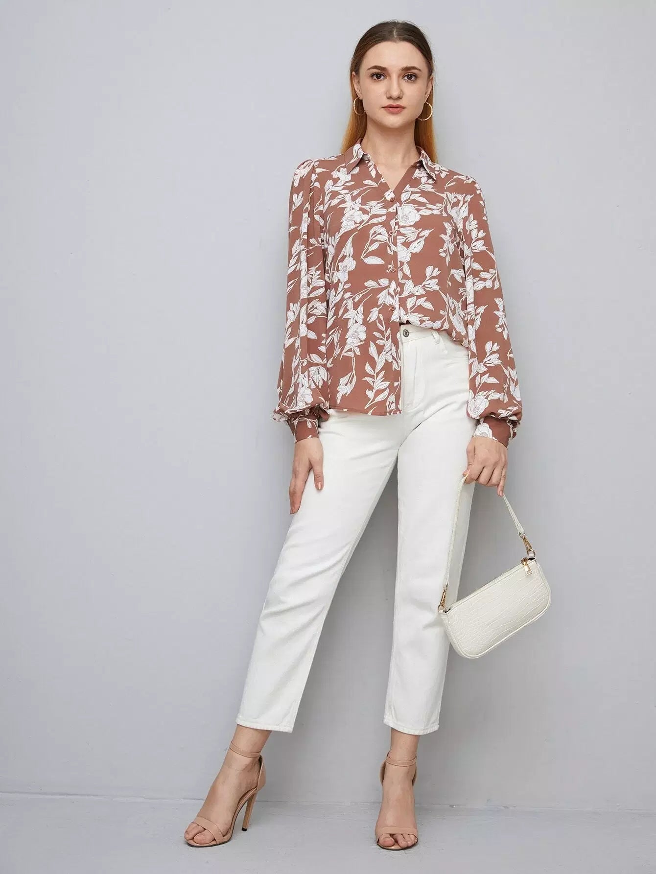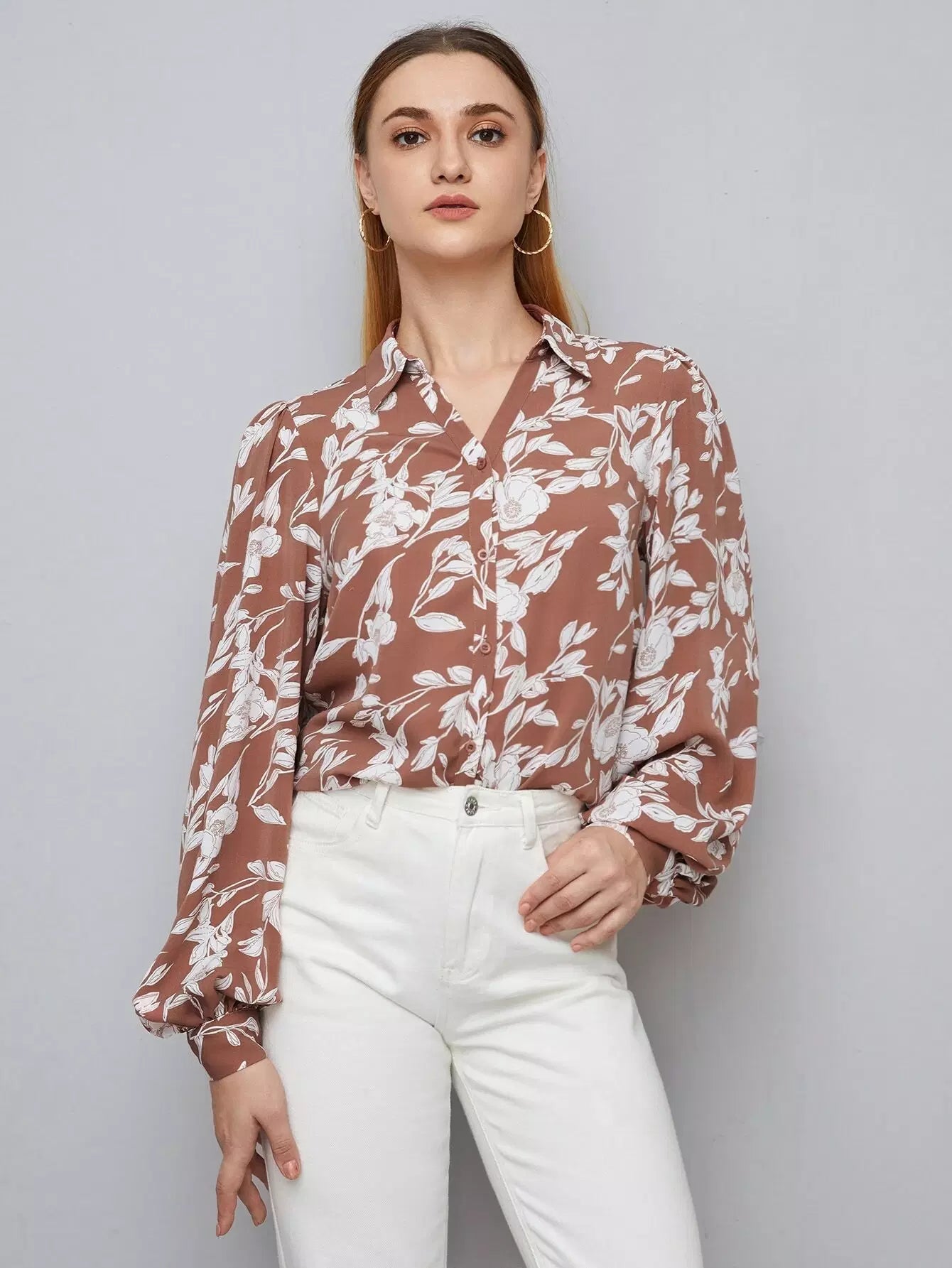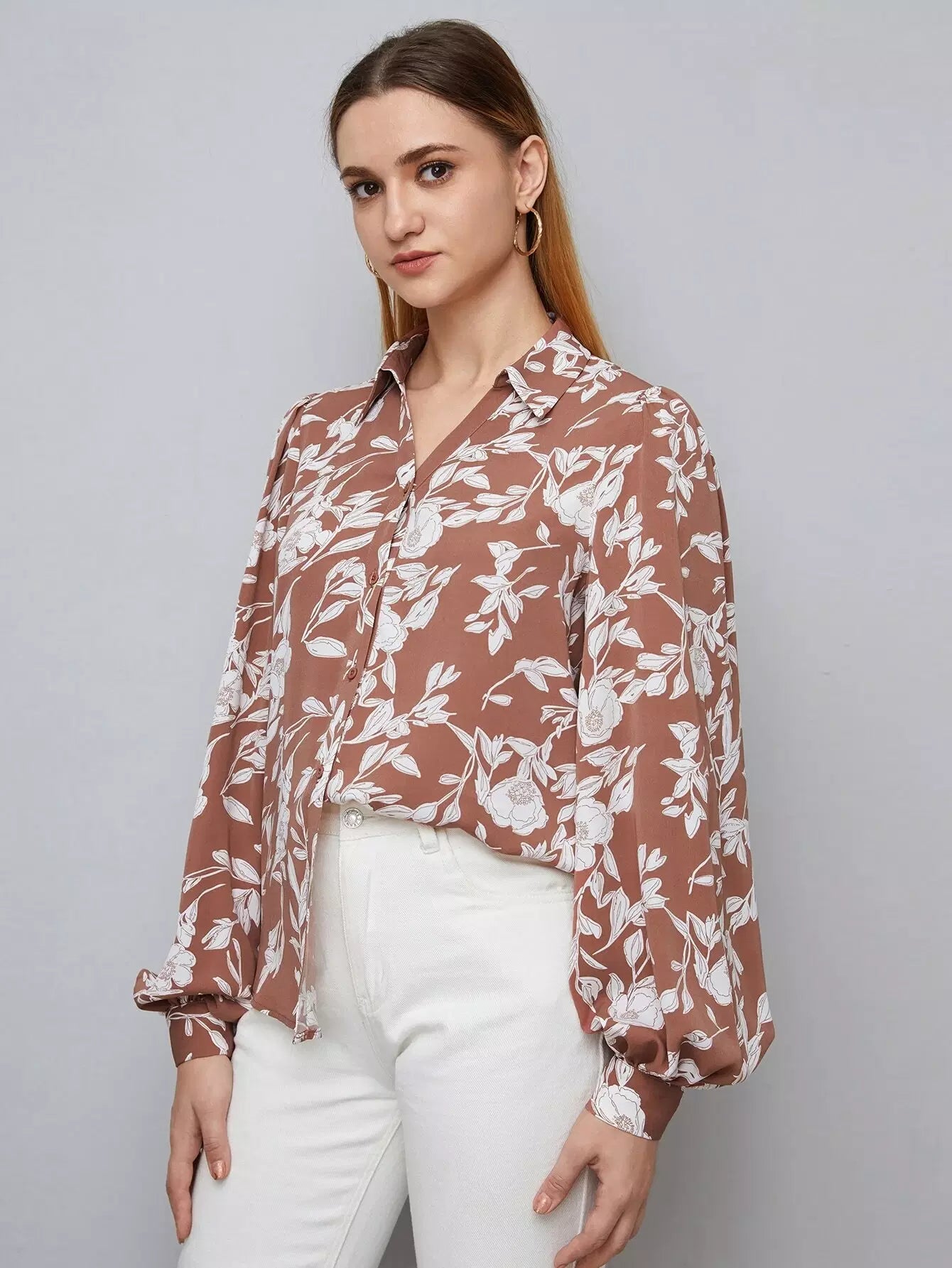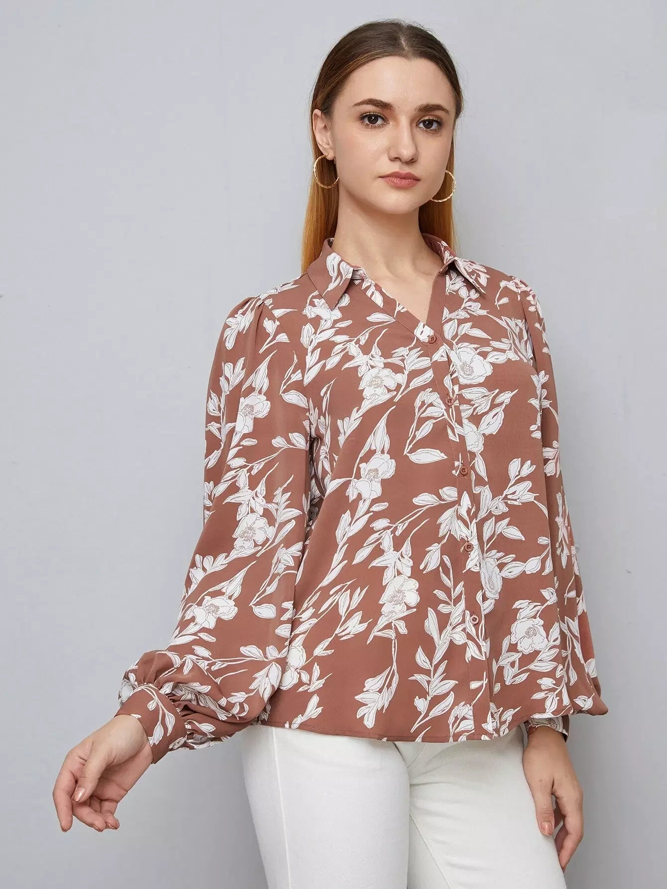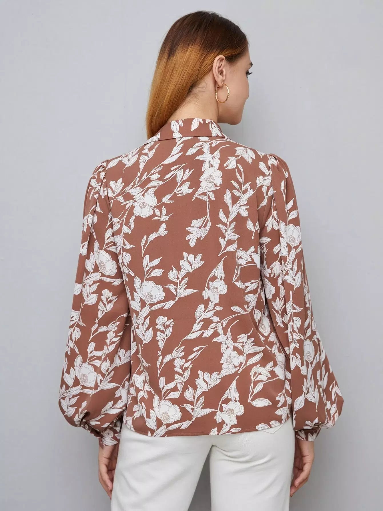 قميص بأكمام فانوسية مطبوع عليه زهور بالكامل