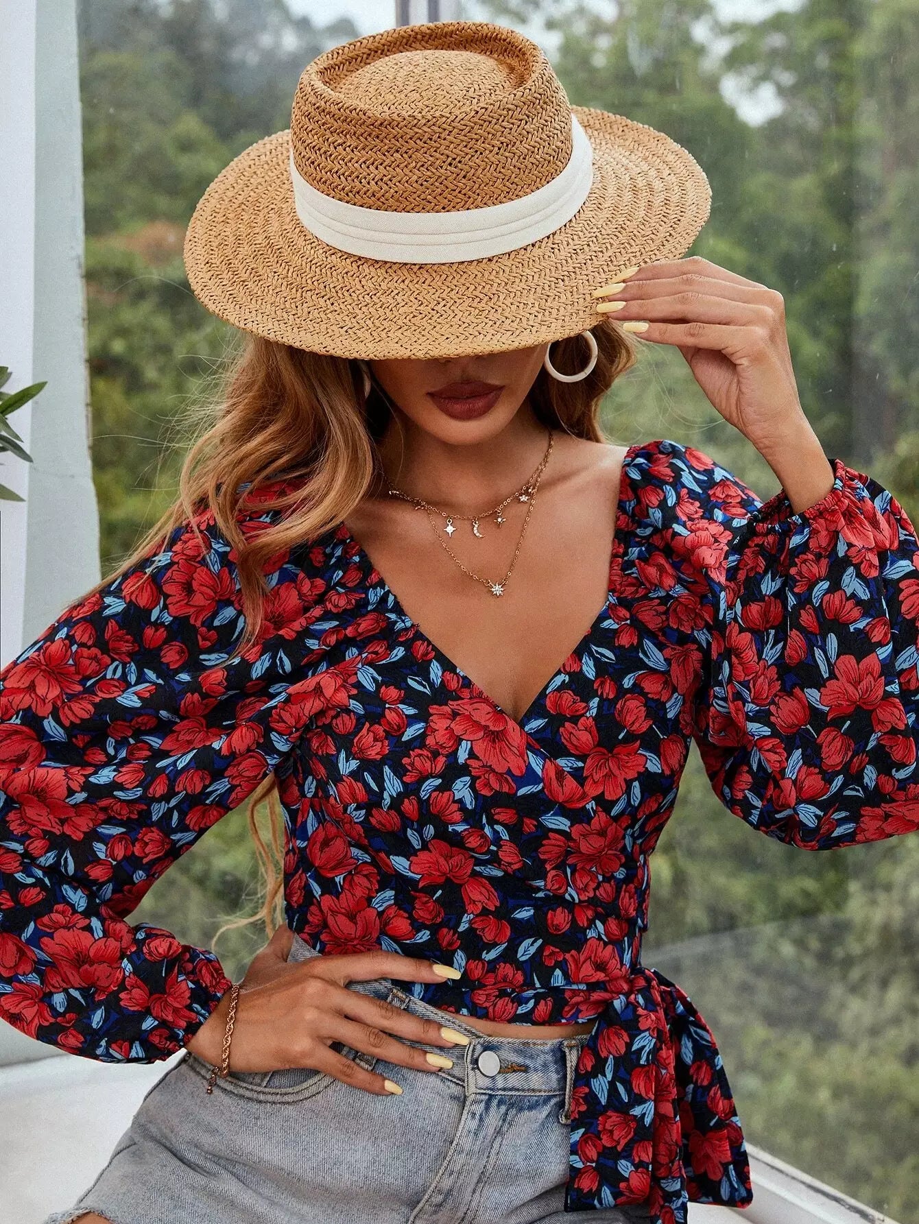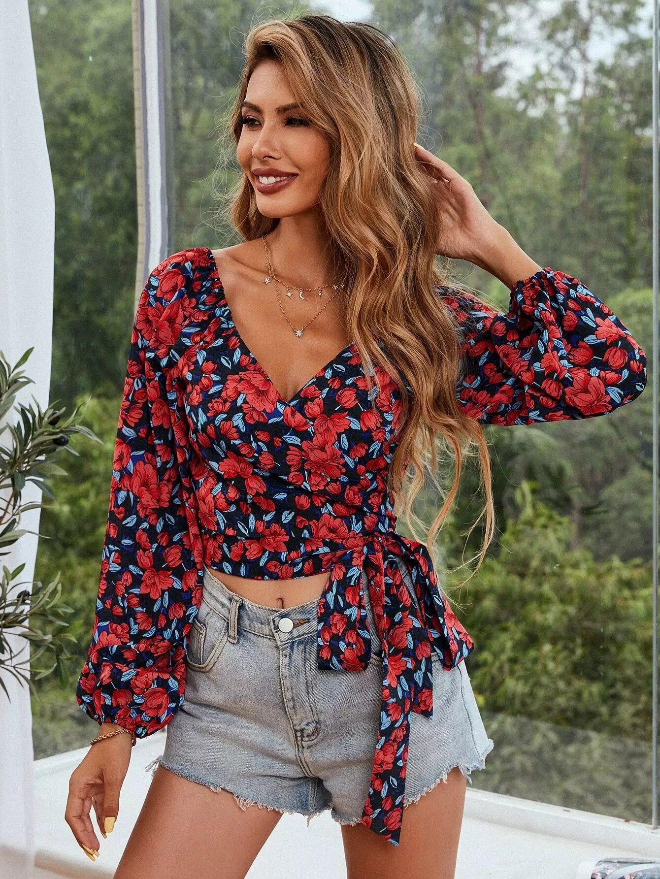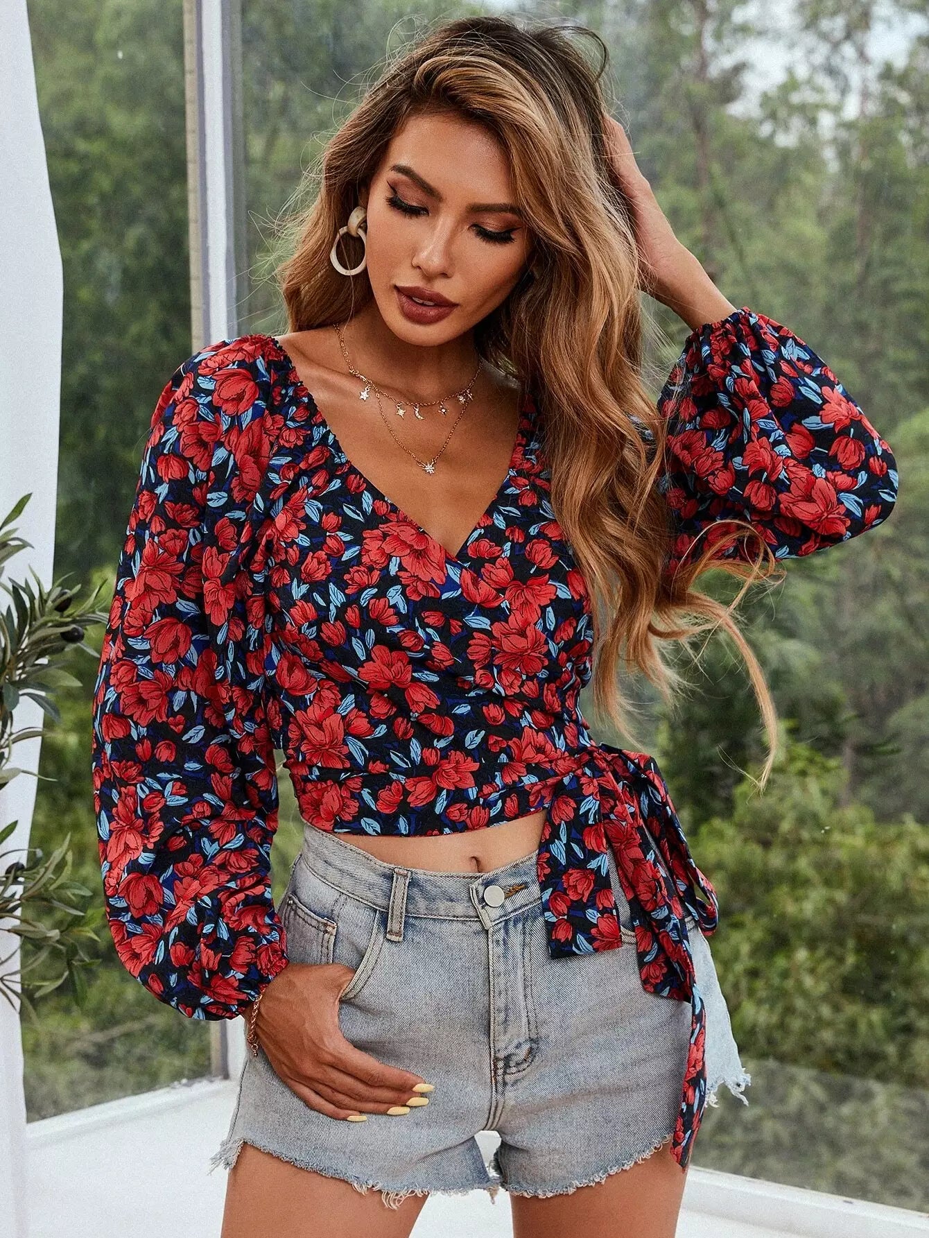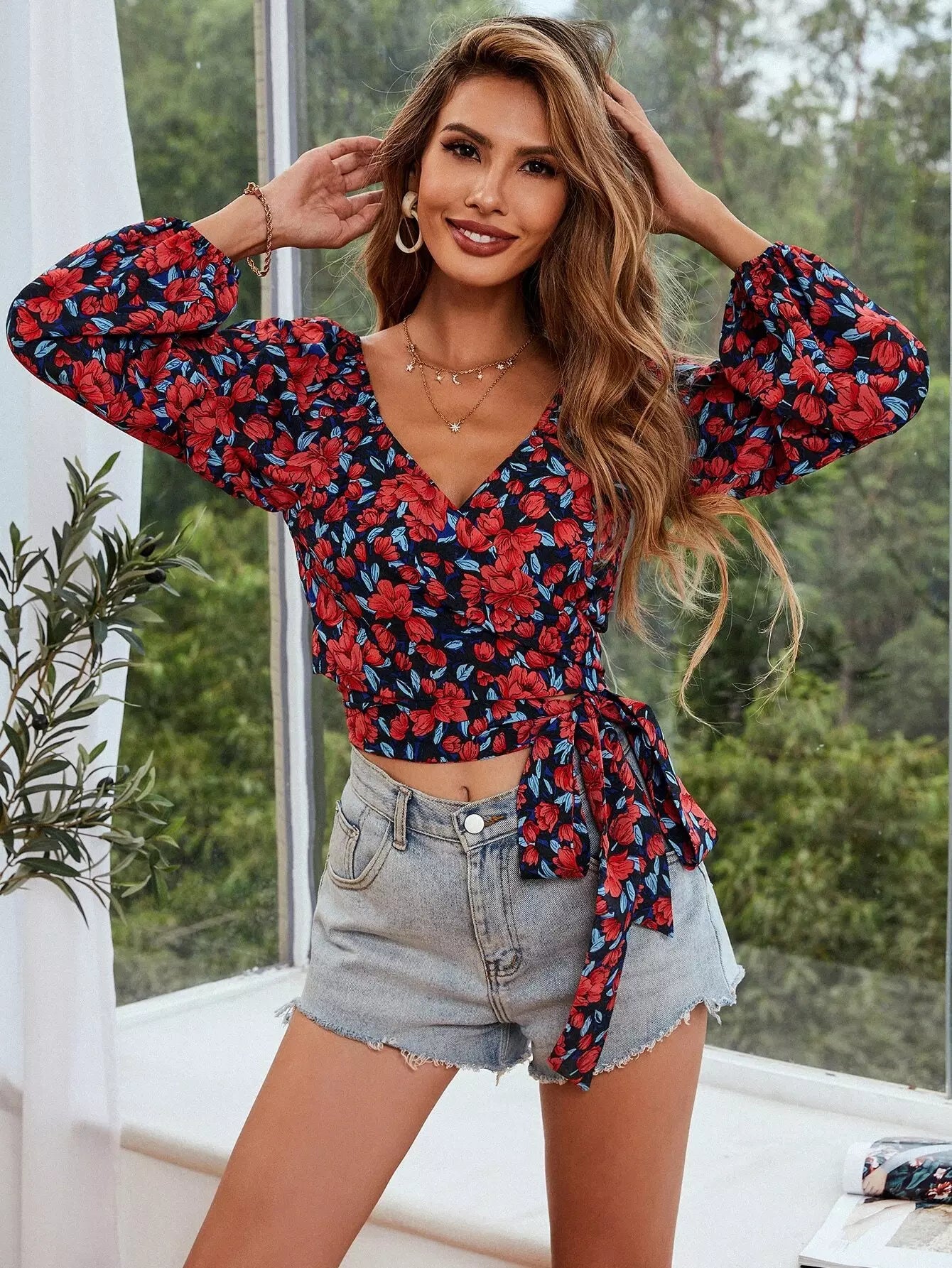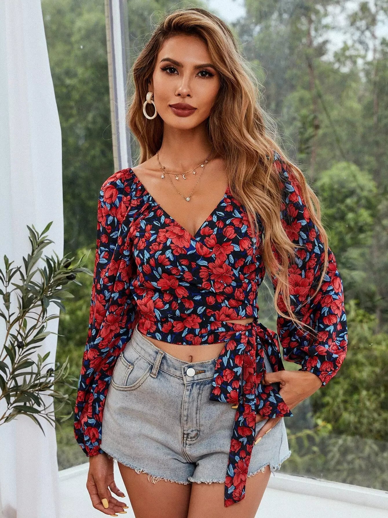 بلوزة قصيرة، مزينة برباطات زهرية جانبية مزينة بالورود