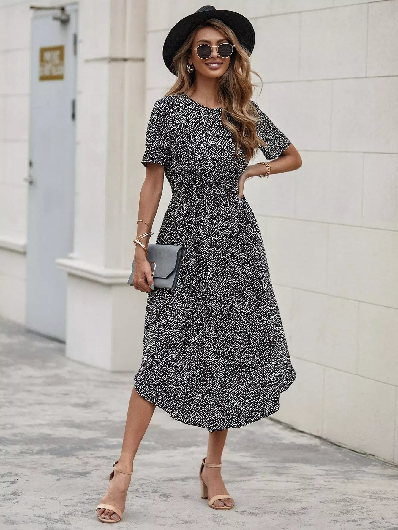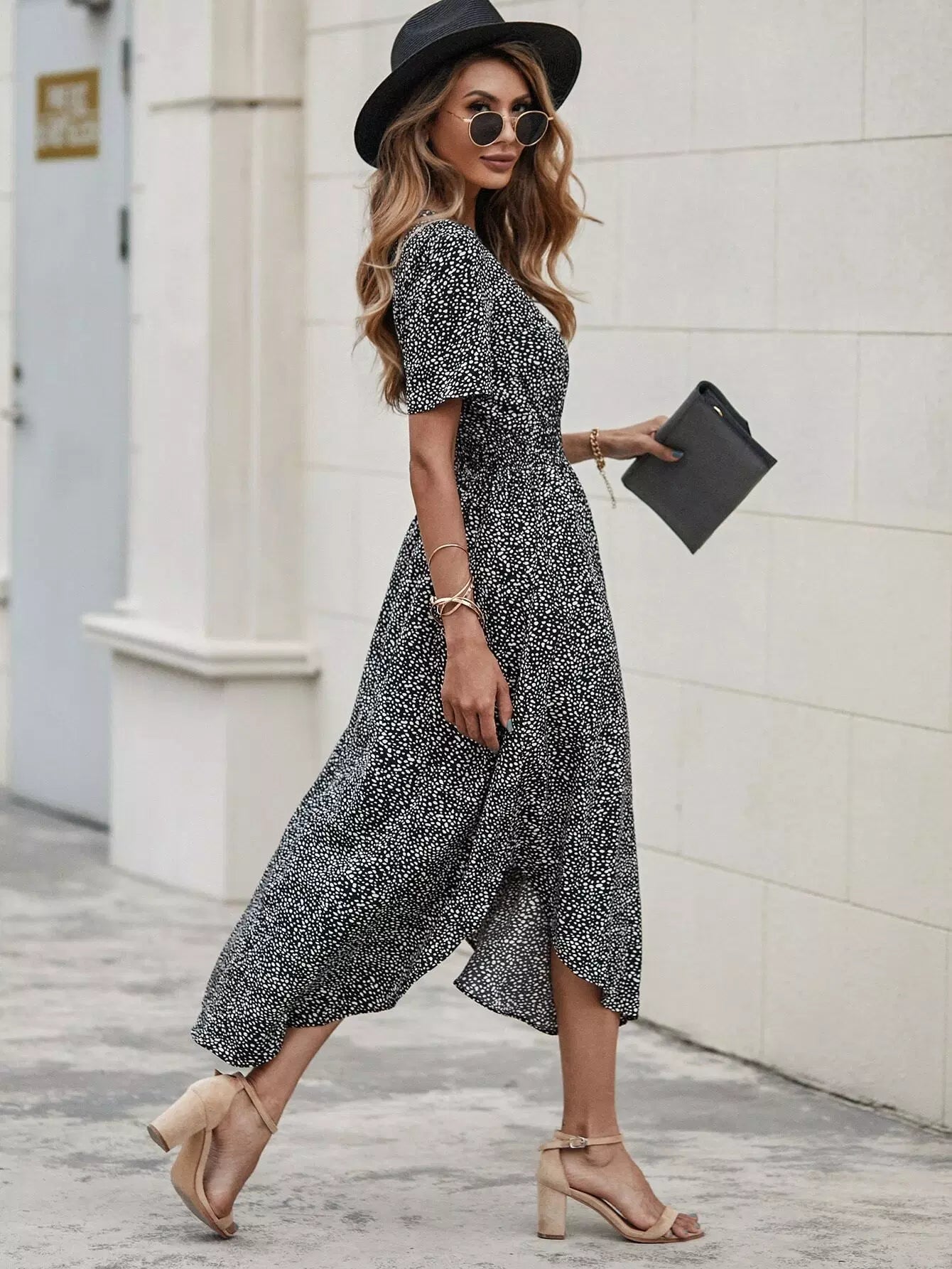 فستان بحافة غير متناظرة مطبوع فوقها بالكامل