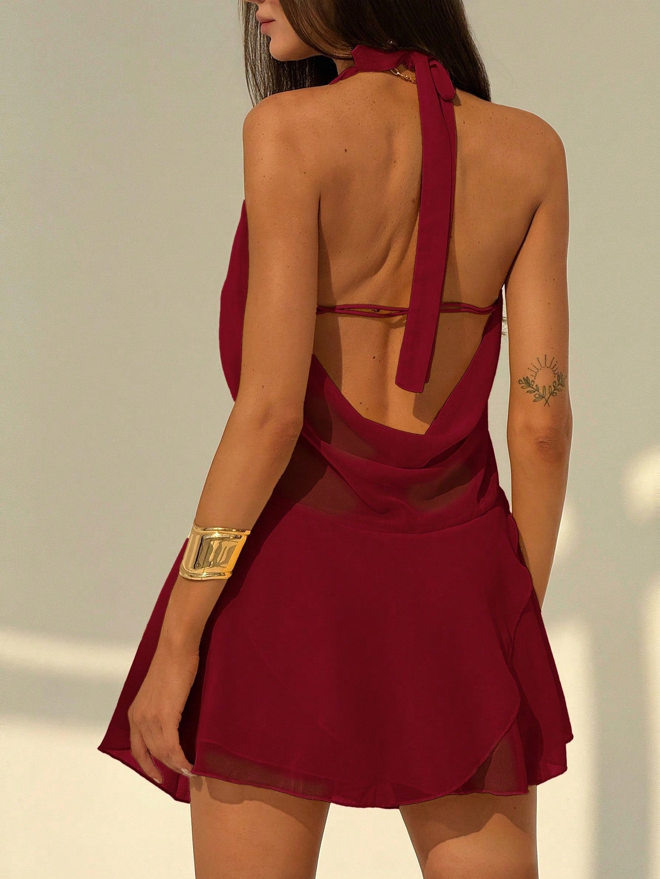 فستان قصير جديد مثير من Aloruh، بلون موحد، بفتحة ظهر مكشوفة، وفتحة رقبة عميقة، وحافة مكشكشة غير منتظمة. مناسب