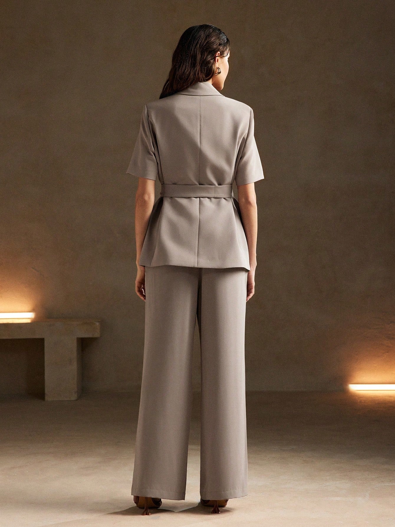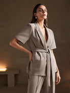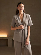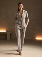 طقم أنيوستا بلون موحد، يتكون من بليزر قصير الأكمام وبنطال طويل بجيوب، بدون حزام.