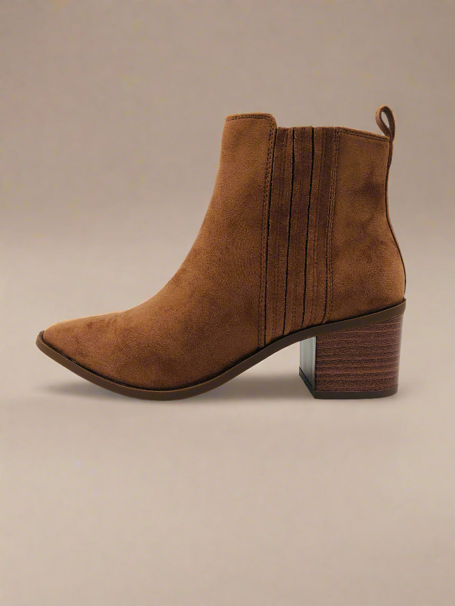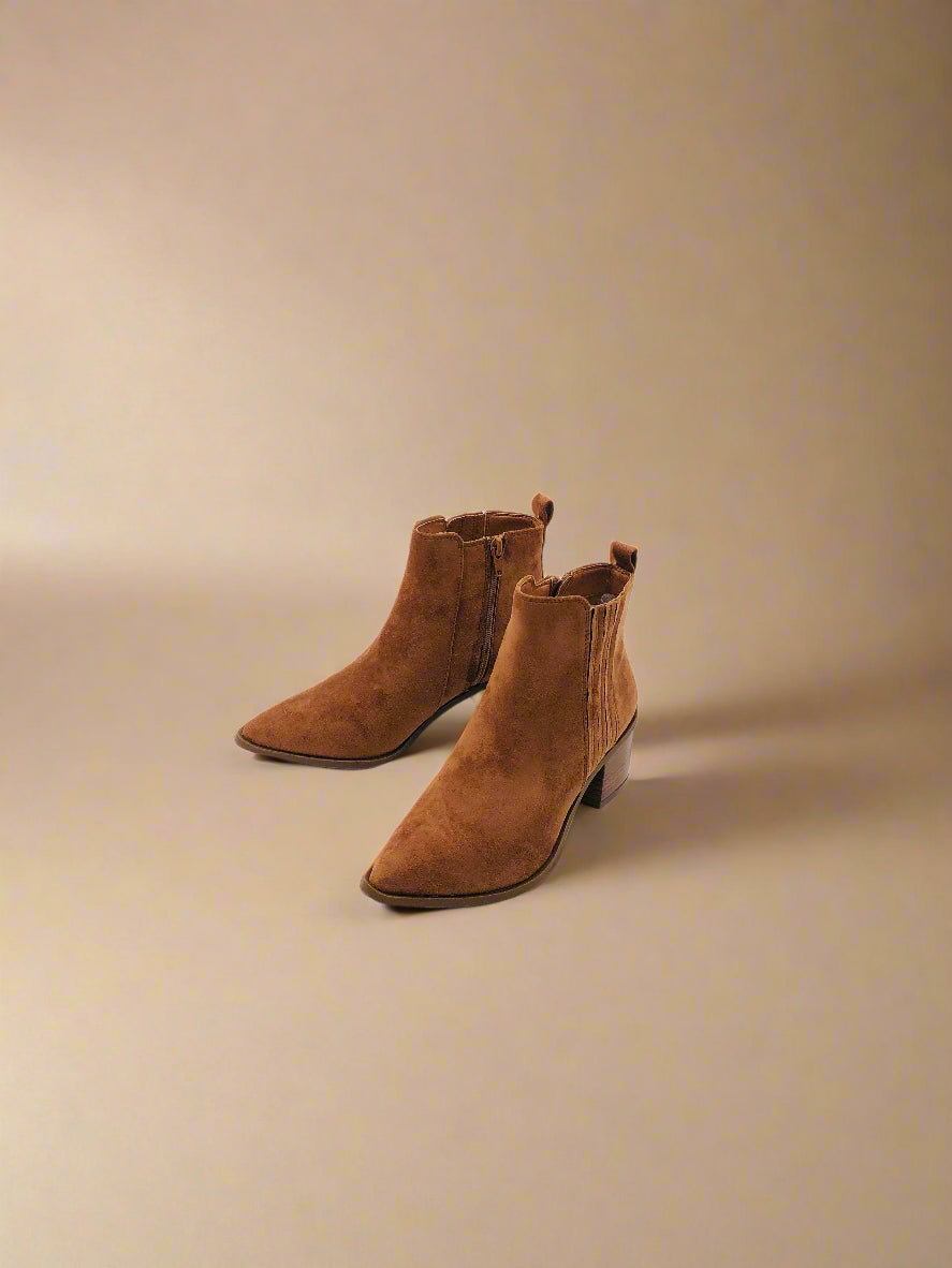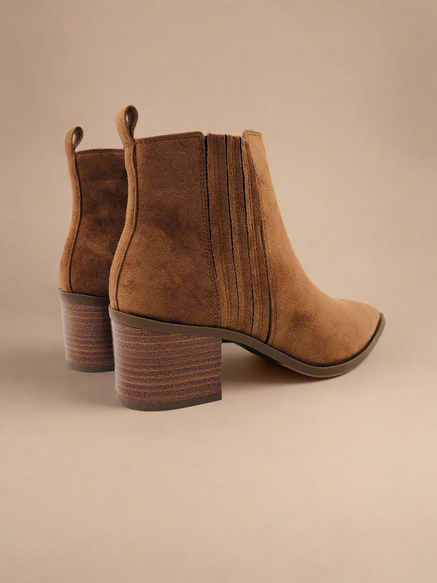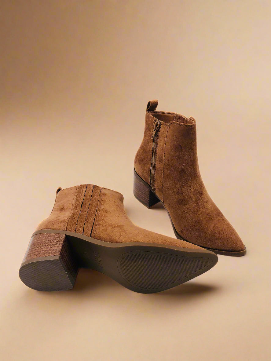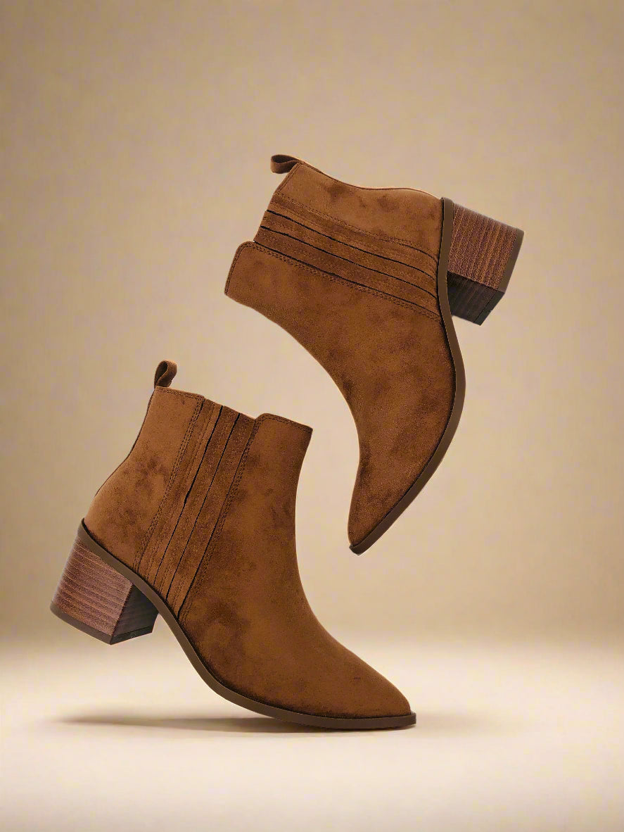 جزمة كاحل باللون البني، توفر الأناقة والراحة مع كعب عريض بارتفاع متوسط.