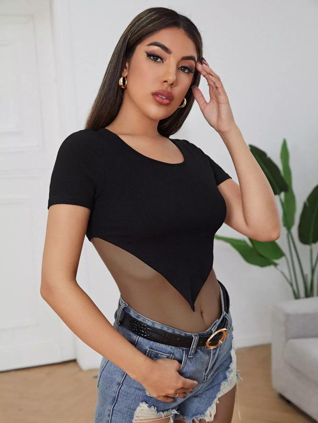 تي شيرت بحافة غير متماثلة بحياكة ضلعية سادة محبوكة على شكل ضلع