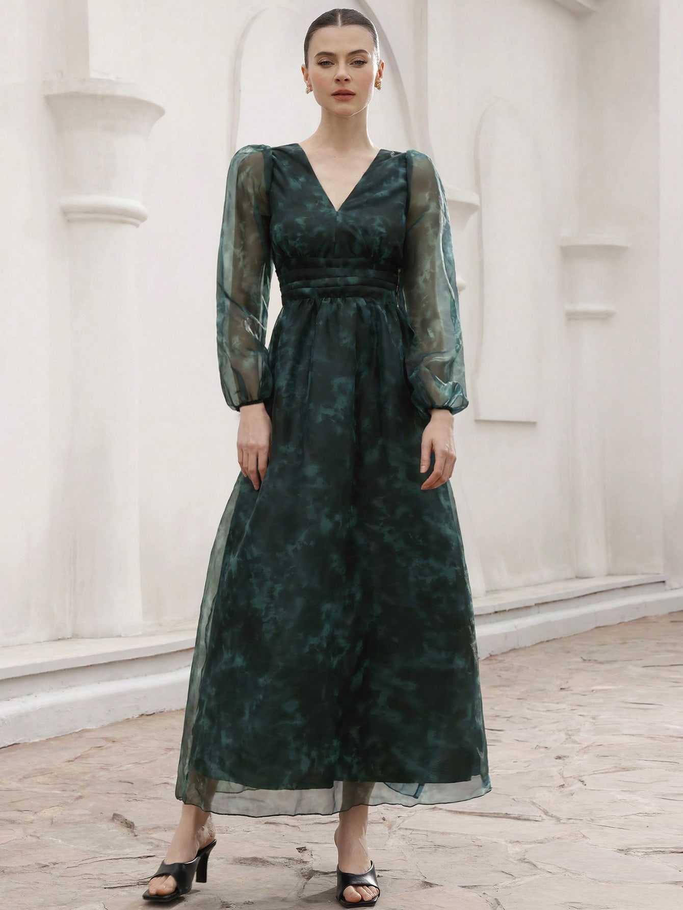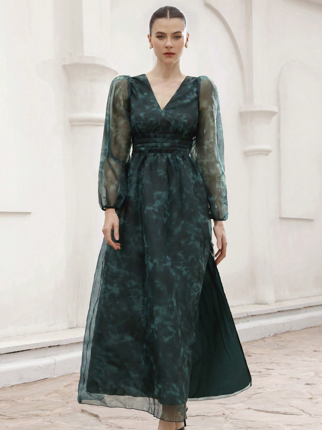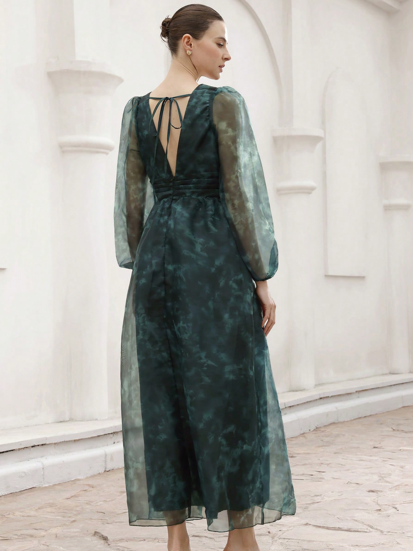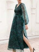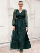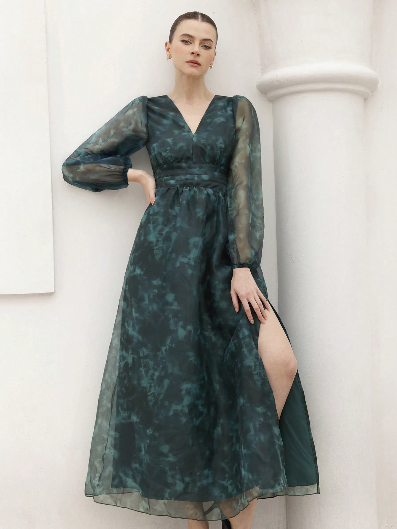 women Aveloria Rosie Blue & Green Organza Random Floral Print Deep V Elegant Romantic Sexy Layered Waistline Design Long Sleeve Dress For Women Fall Cloth For Women