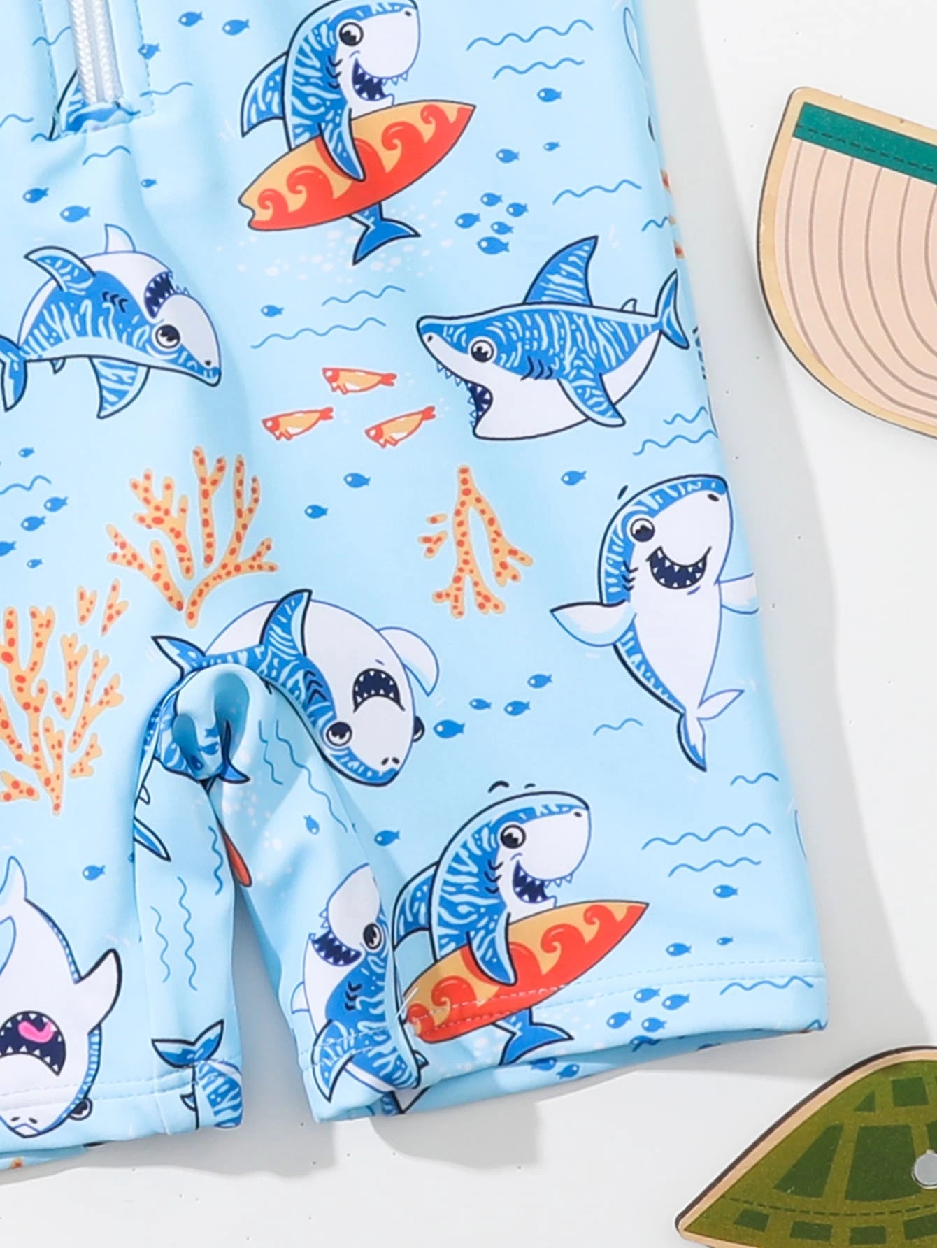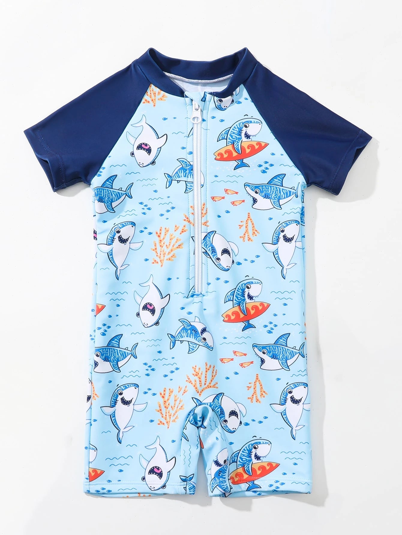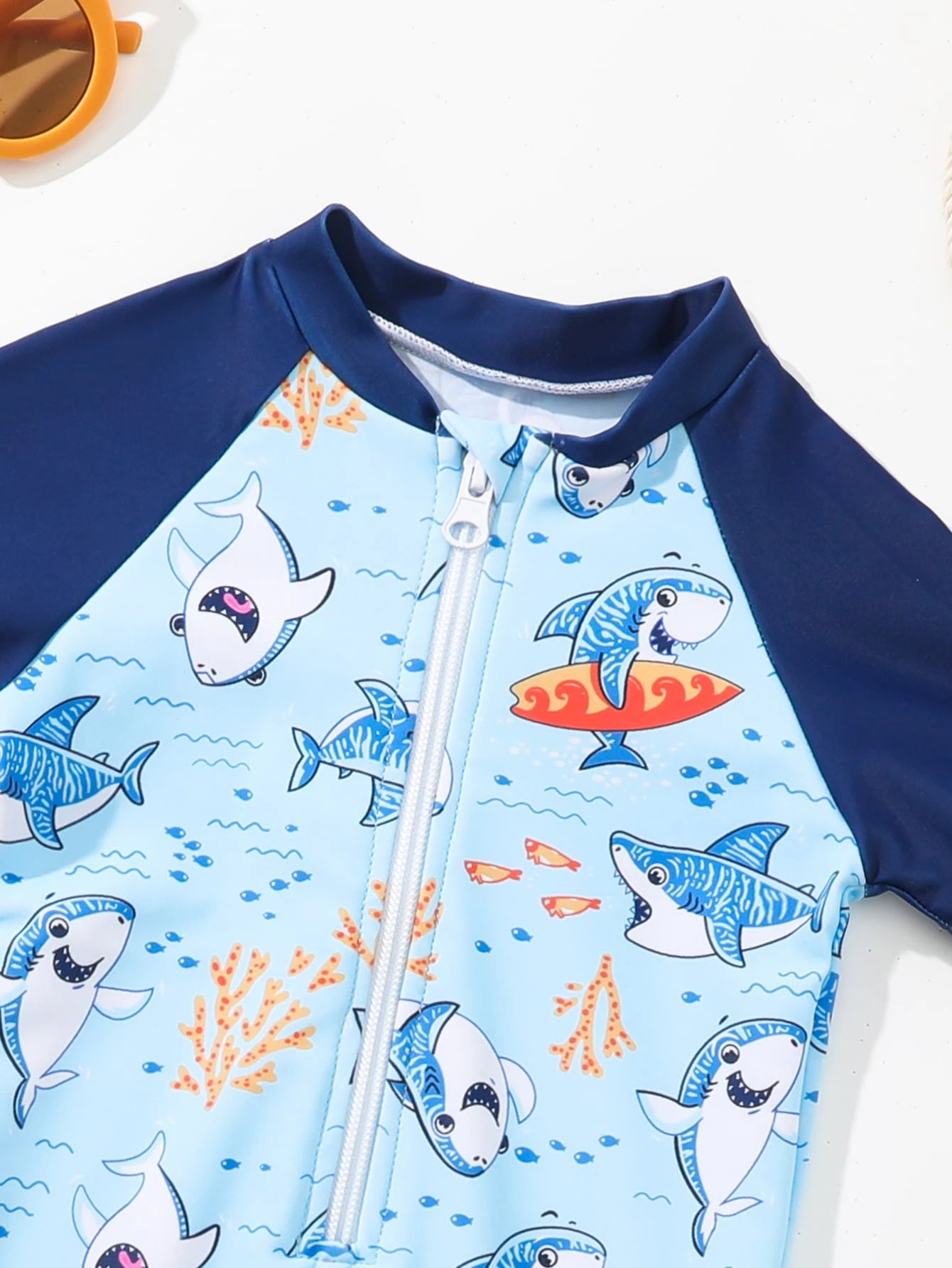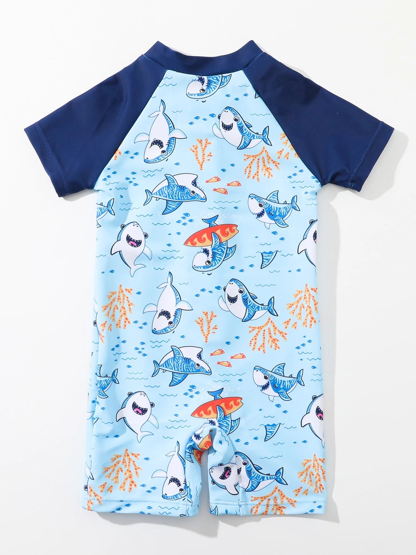 بدلة سباحة من قطعة واحدة بأكمام مرجانية وطبعة قرش لطفل رضيع بأكمام من قطعة واحدة