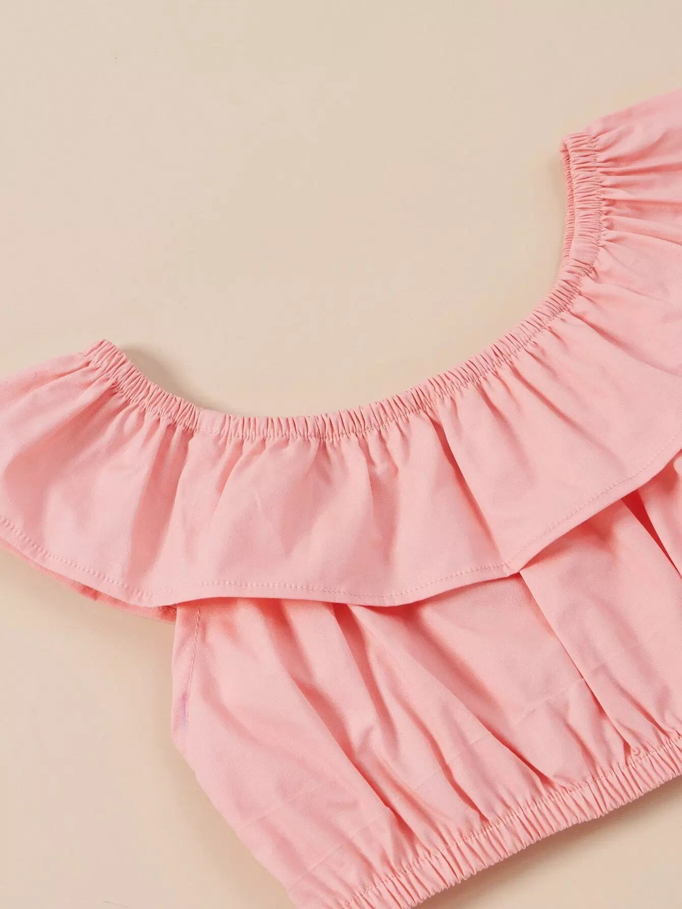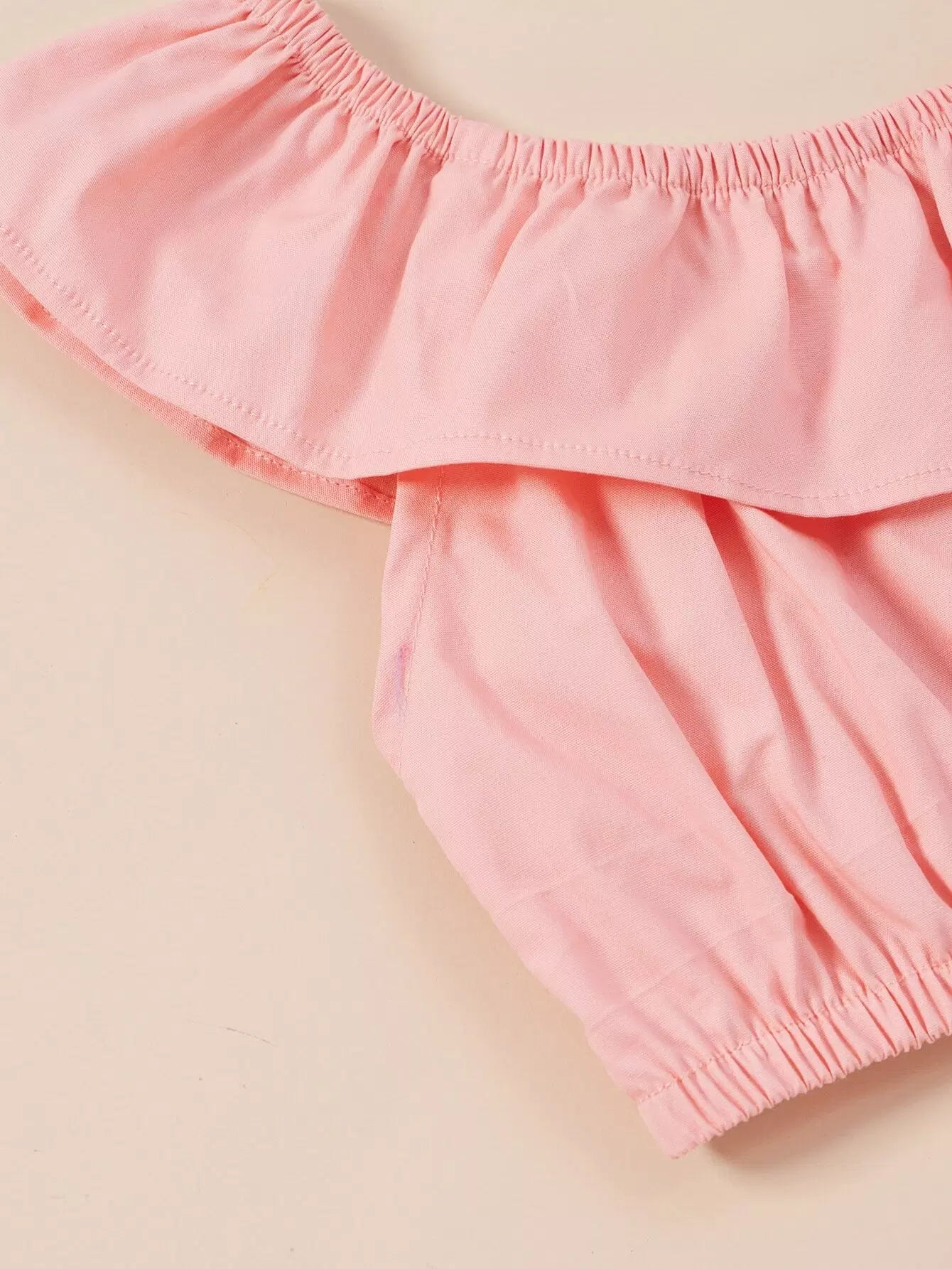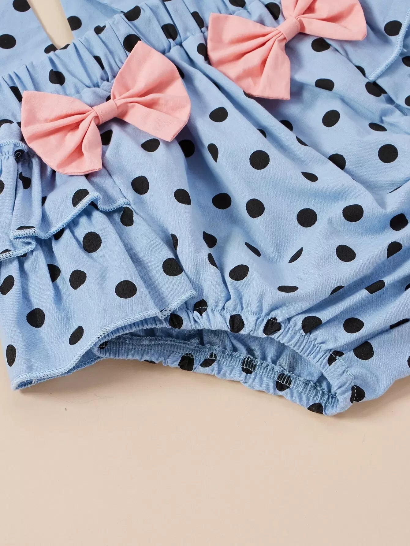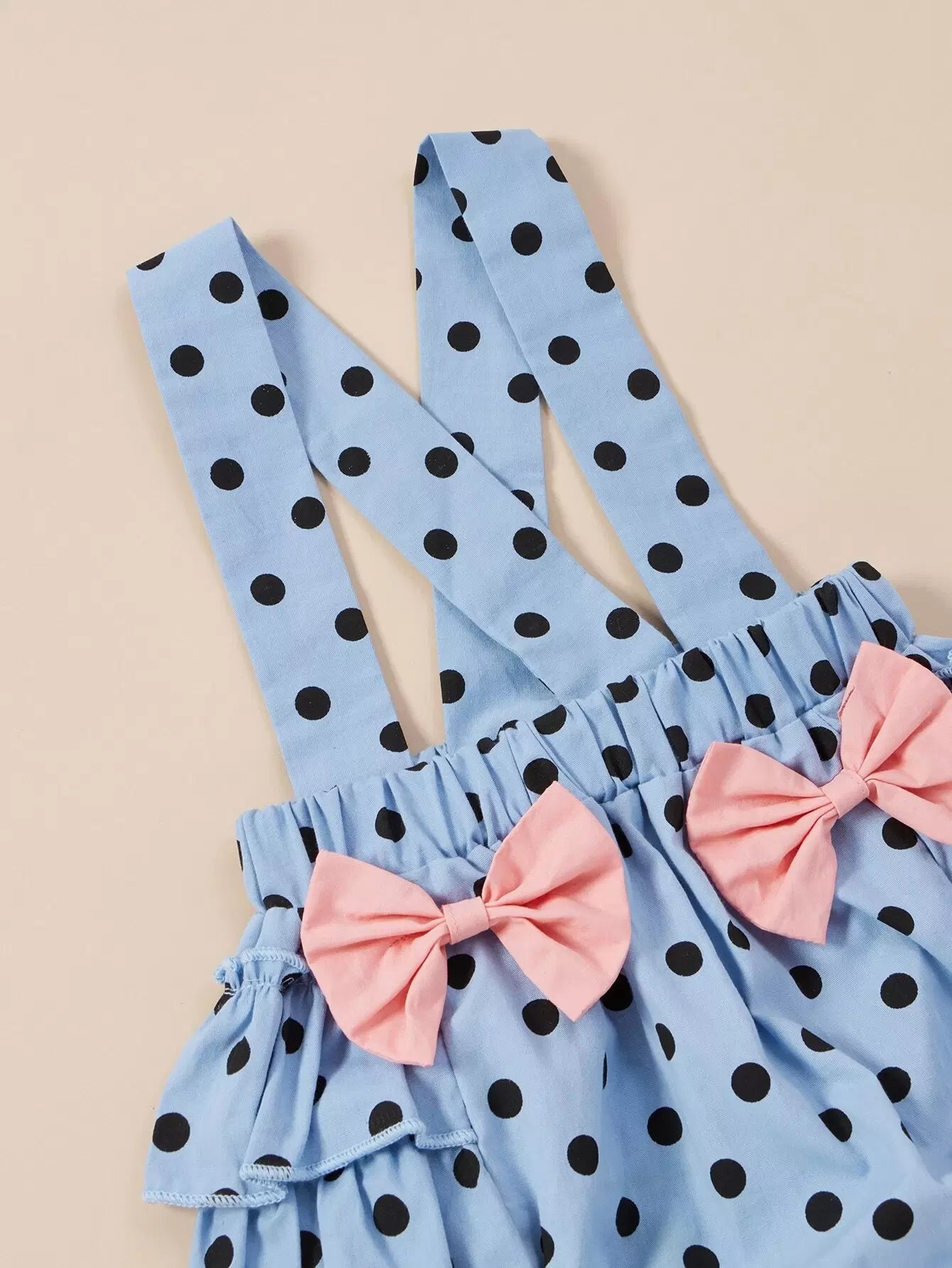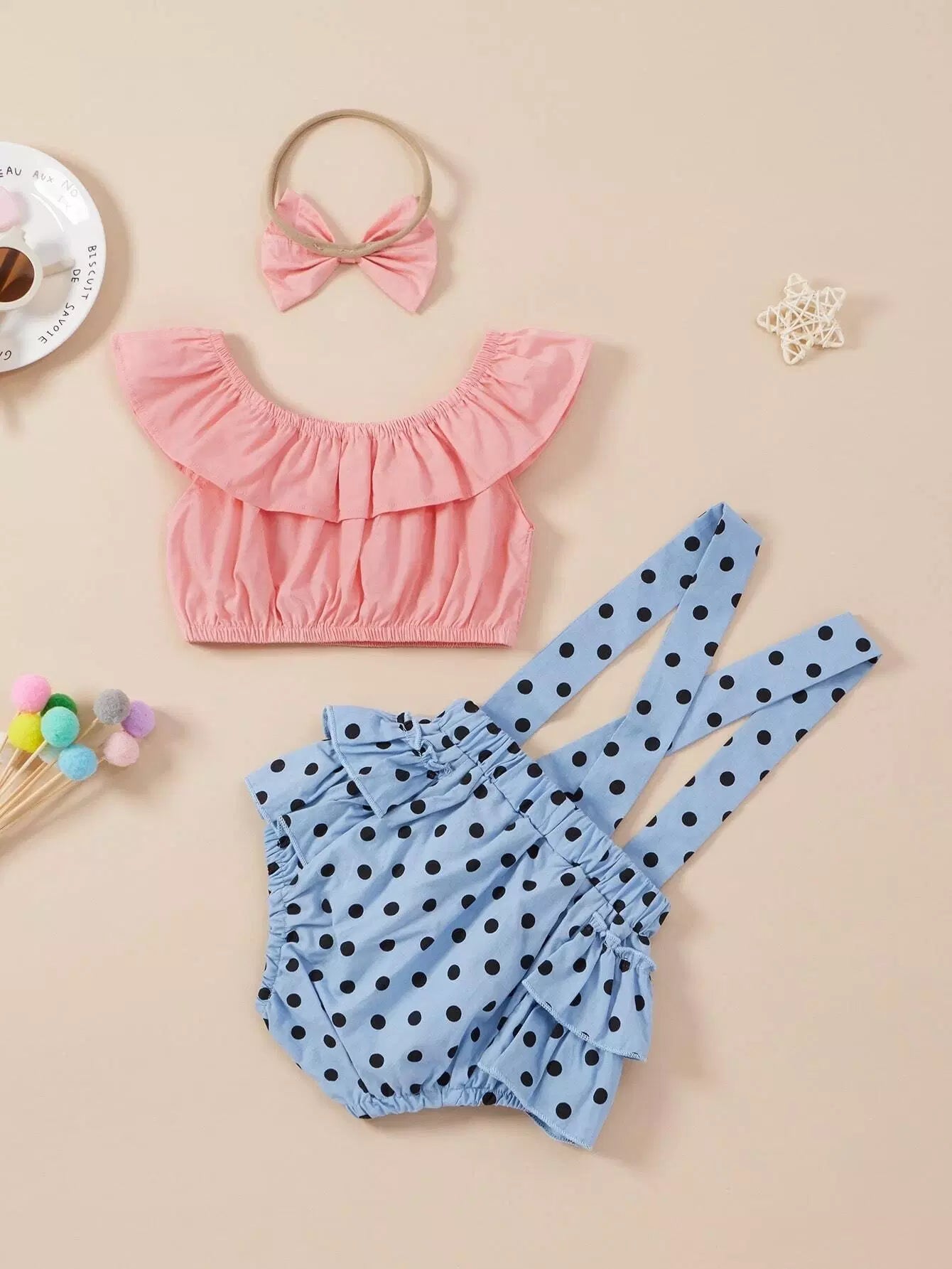 بلوزة طفلة رضيعة، بلوزة بحواف منفوشة وشورت بحمالات منقطة وعصابة رأس
