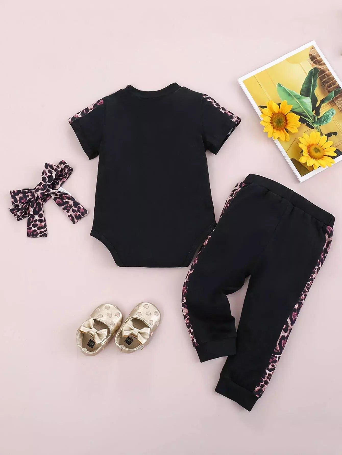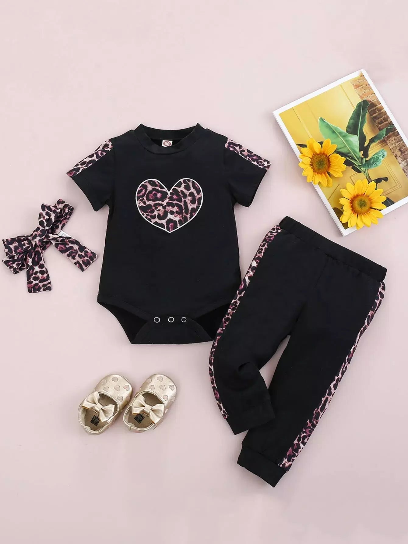 لباس قطعة واحدة للطفلة الرضيعة بطبعة قلب ونمر وبنطال رياضي وعصابة رأس