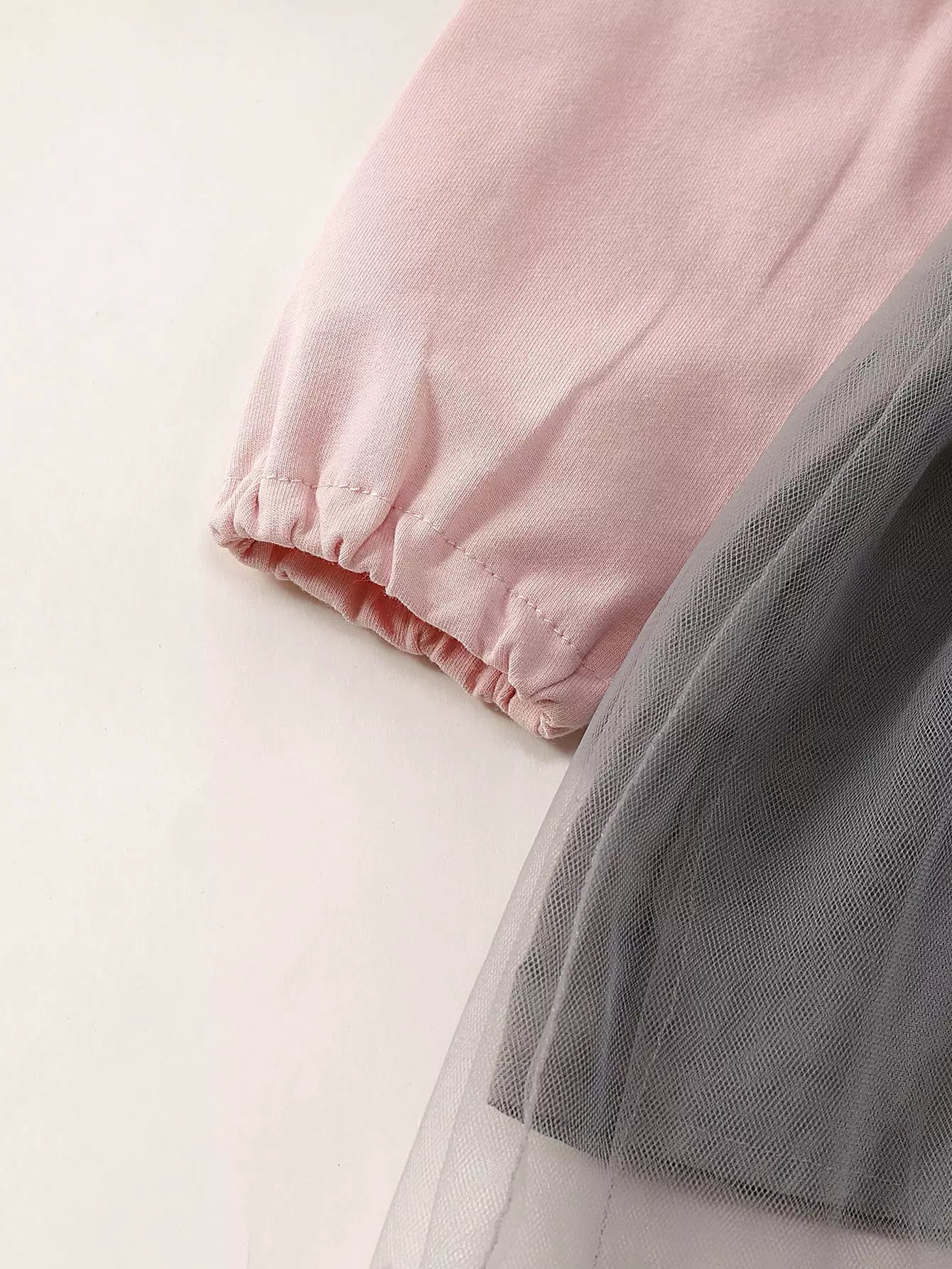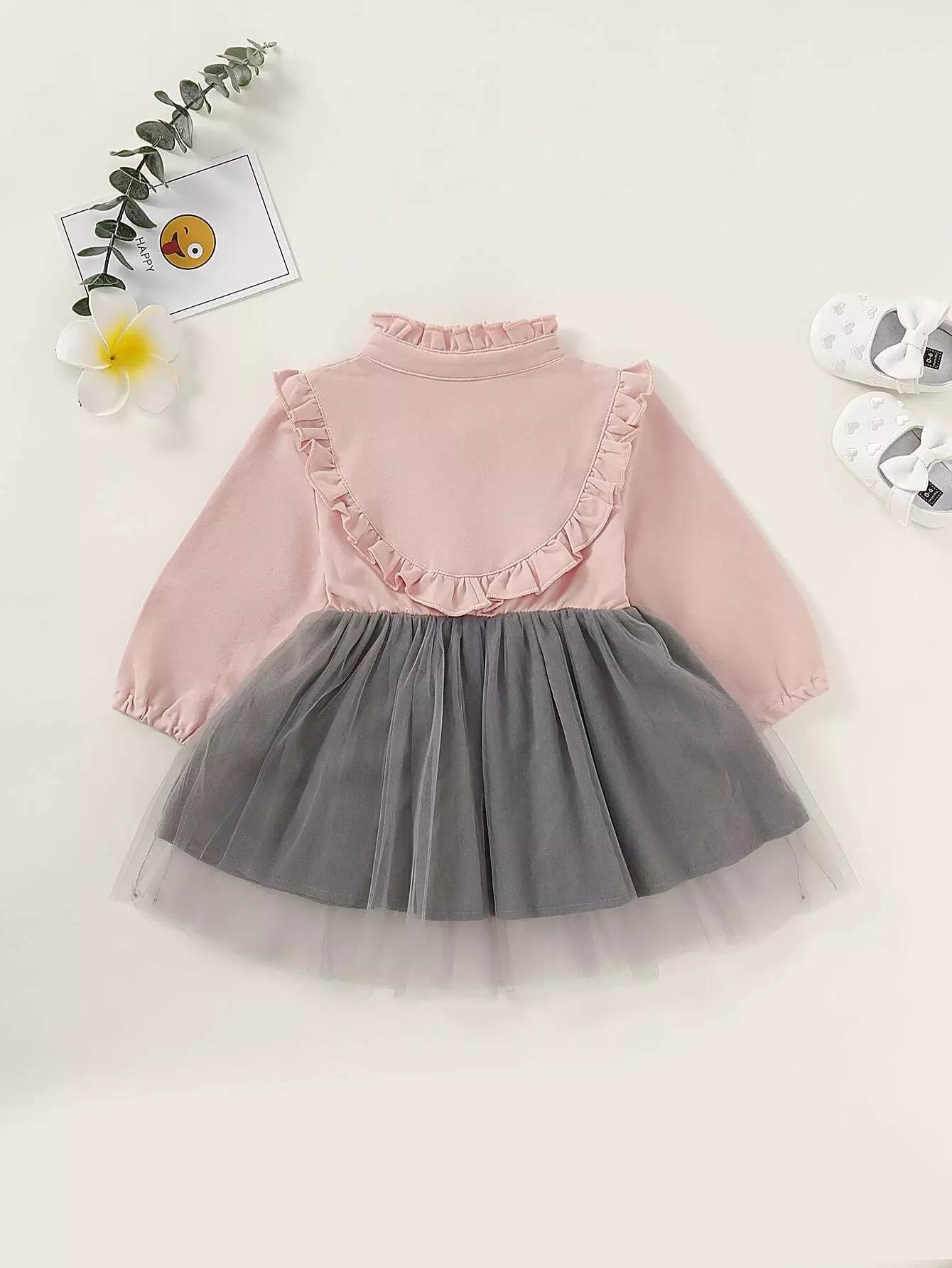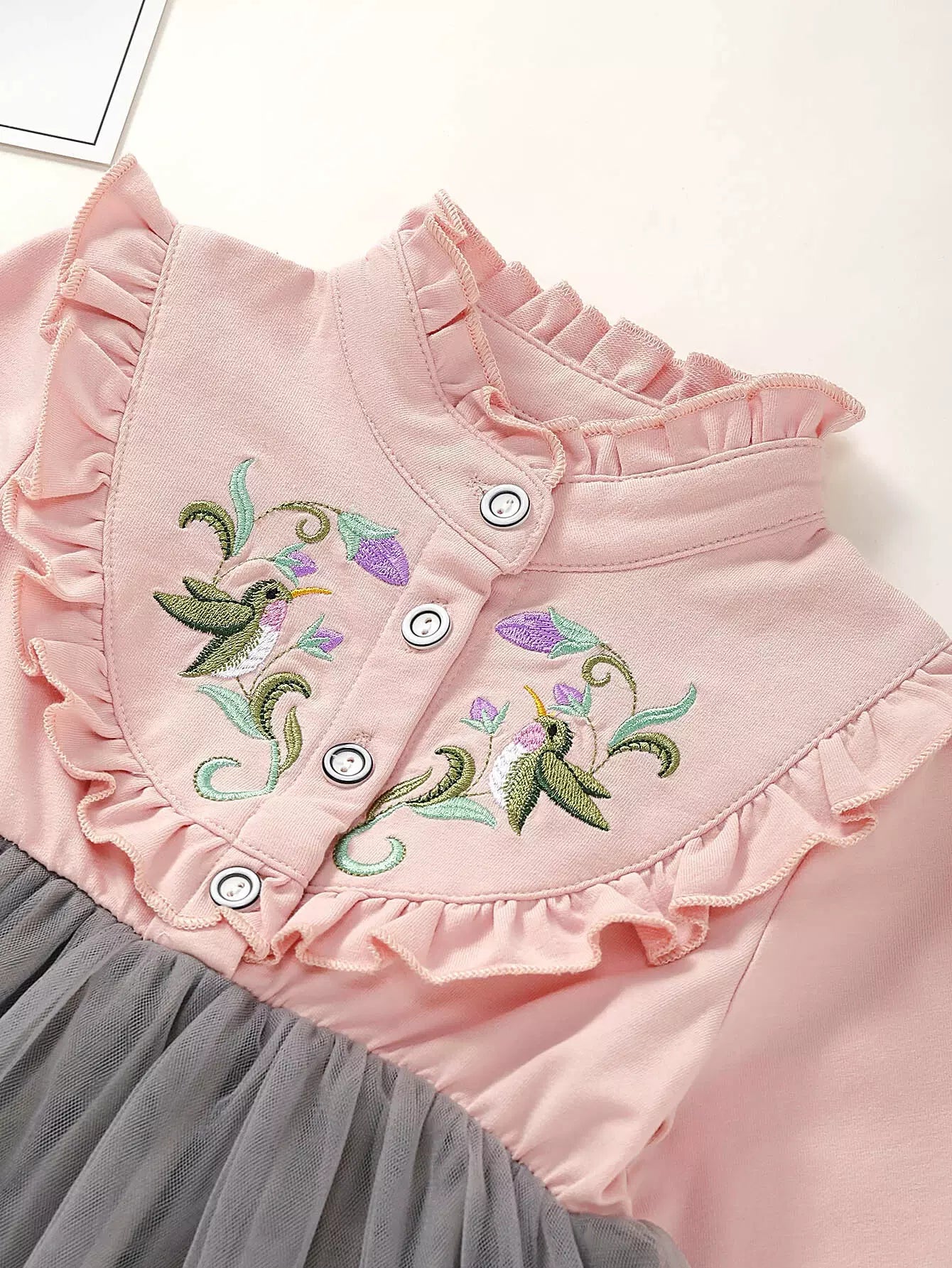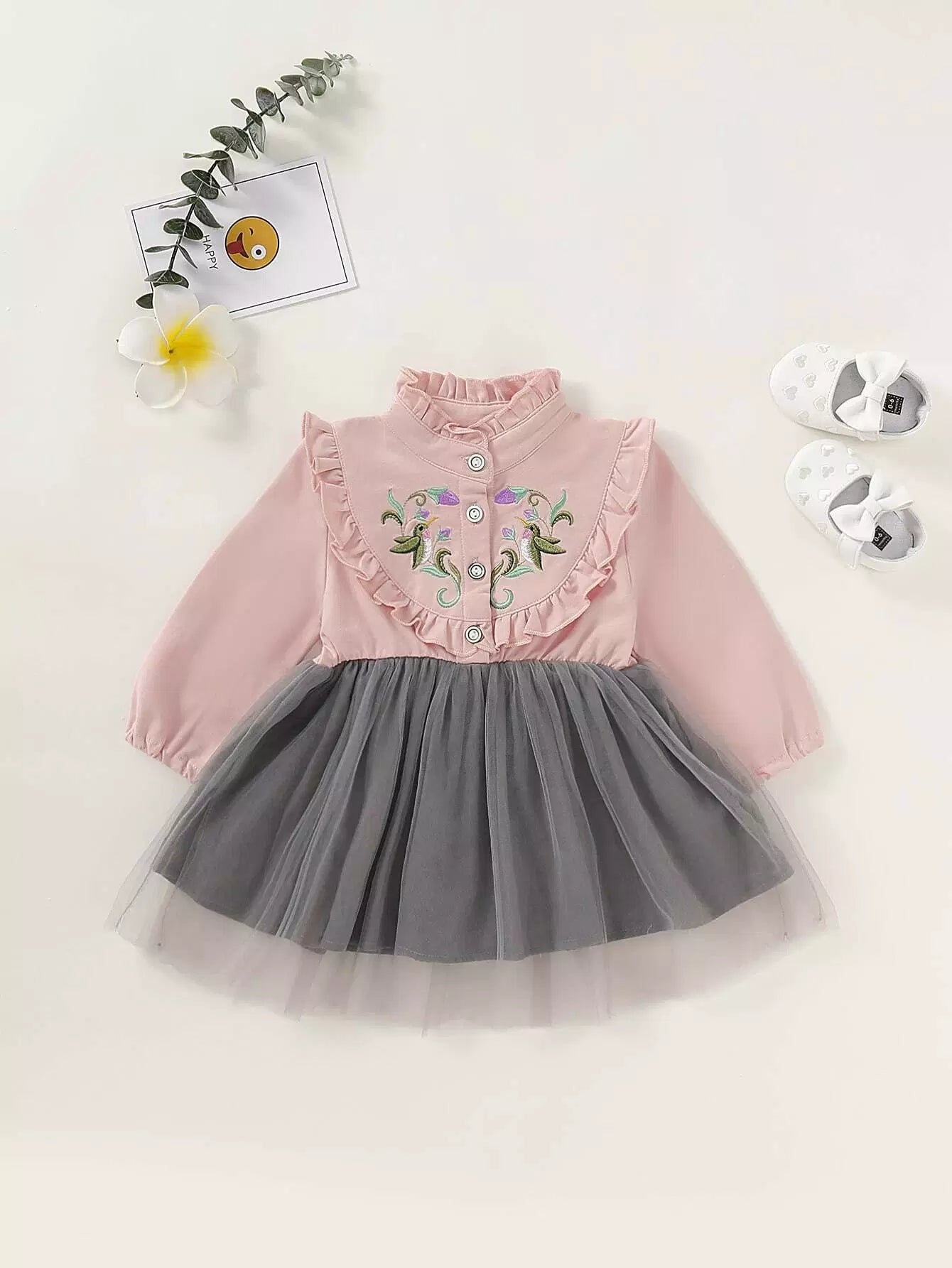 فستان كومبو مزين بتطريزات نباتات طفلة رضيعة، مزين بكشكش مطرز
