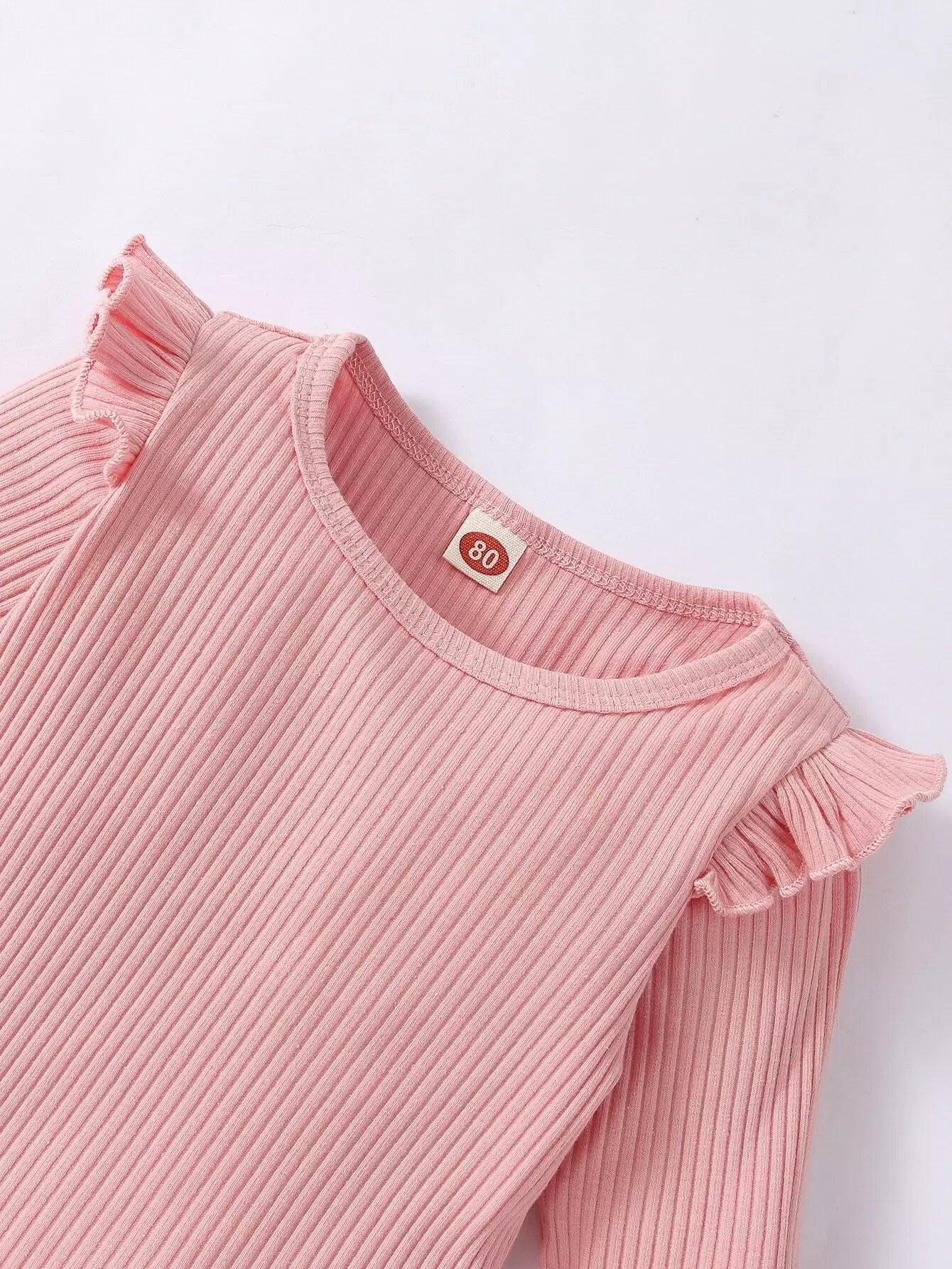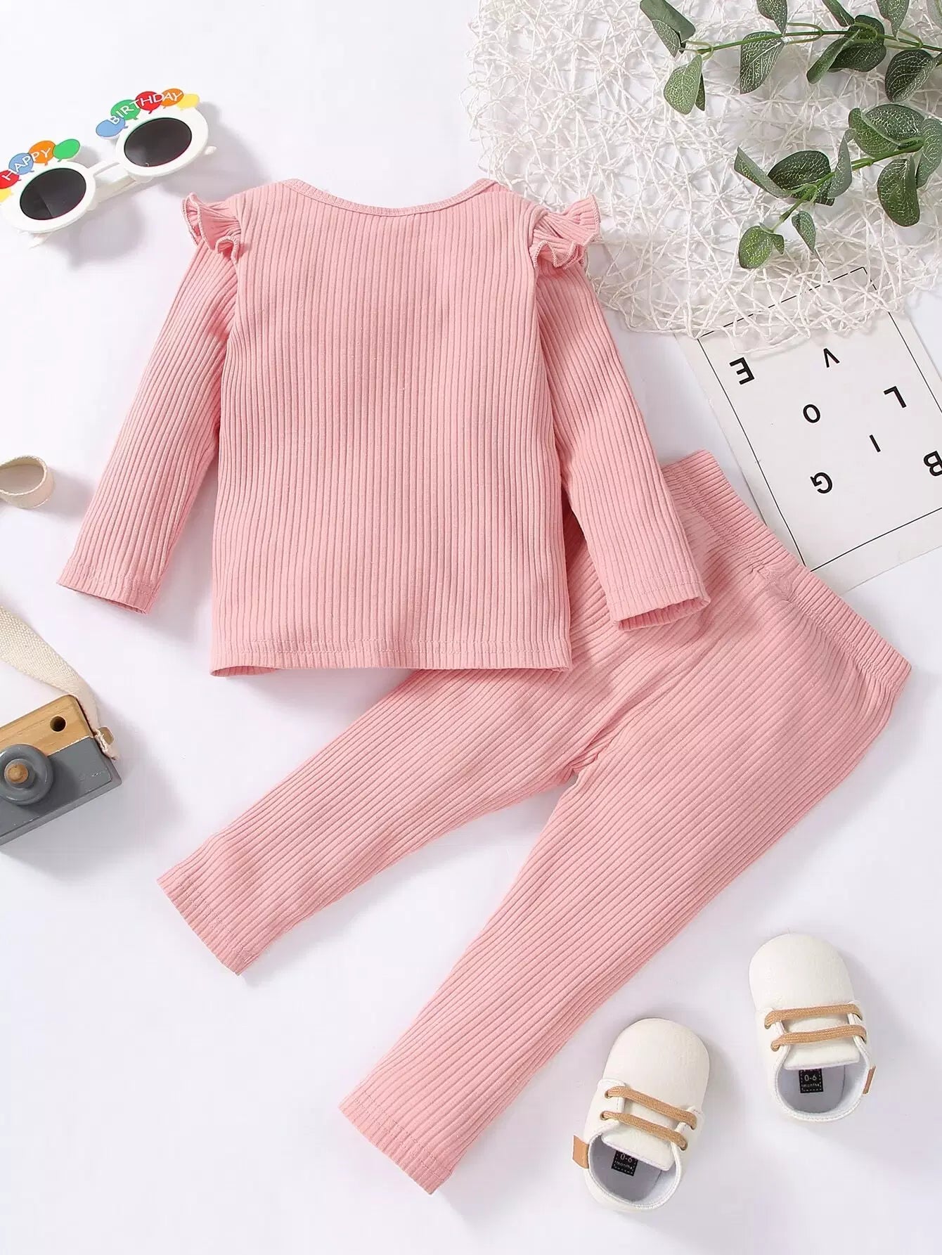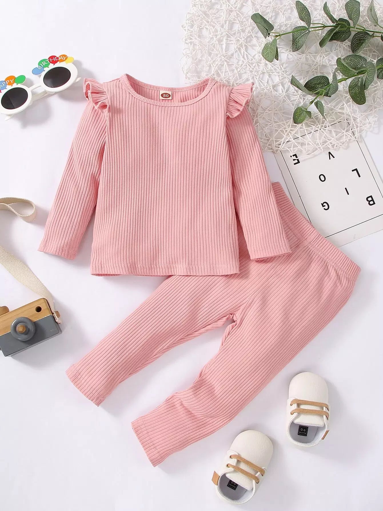 تي شيرت بحواف مضلعة مكشكشة وبنطال ضيق للطفلة الرضيعة