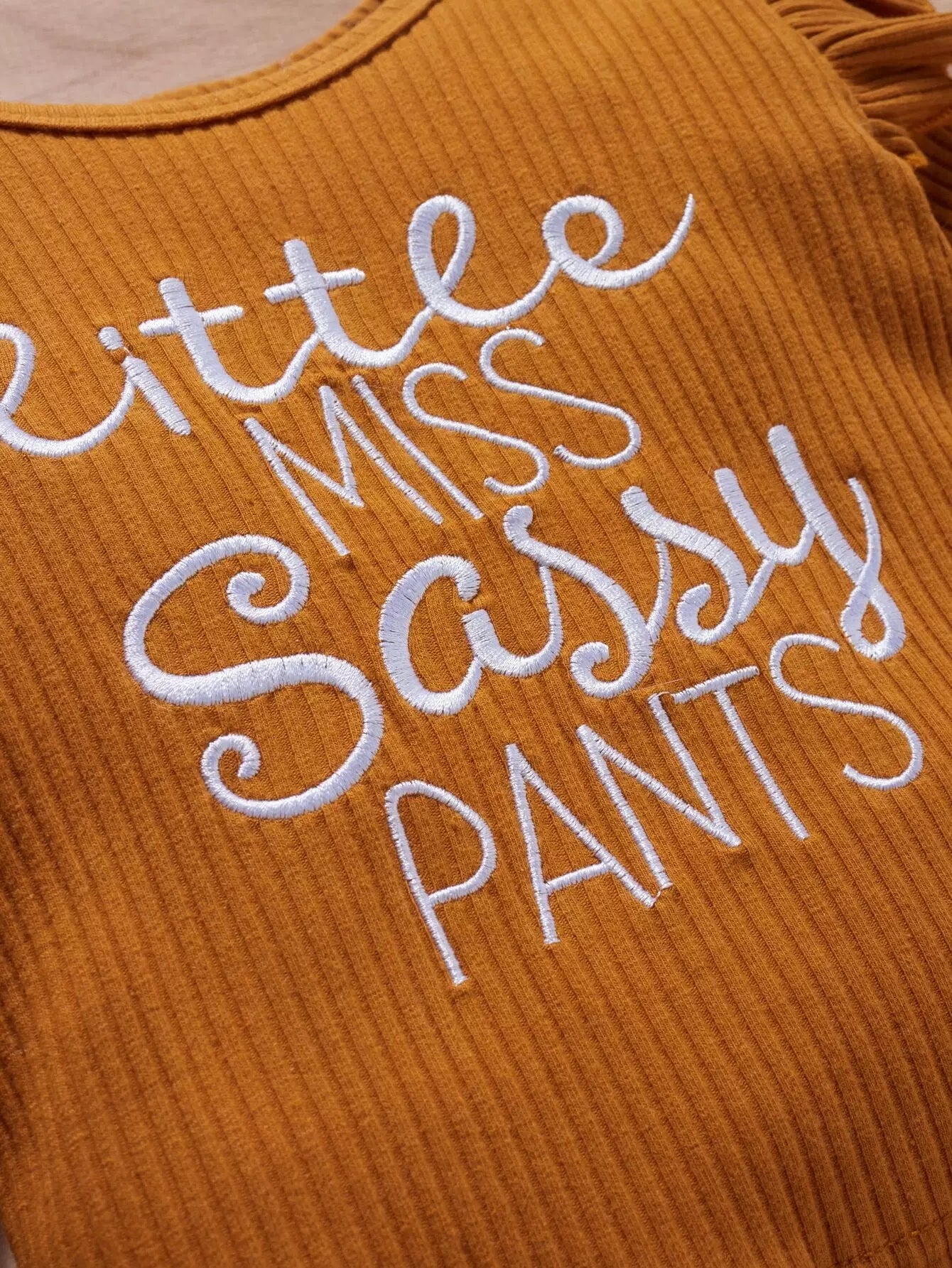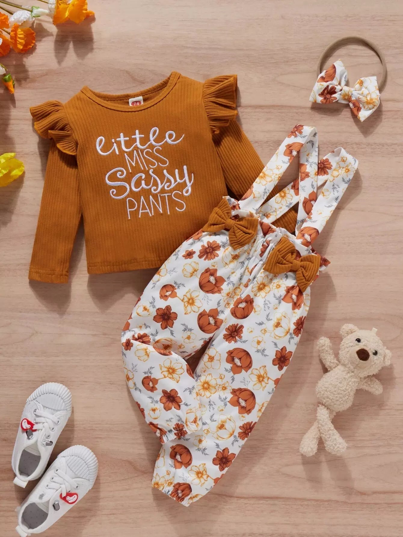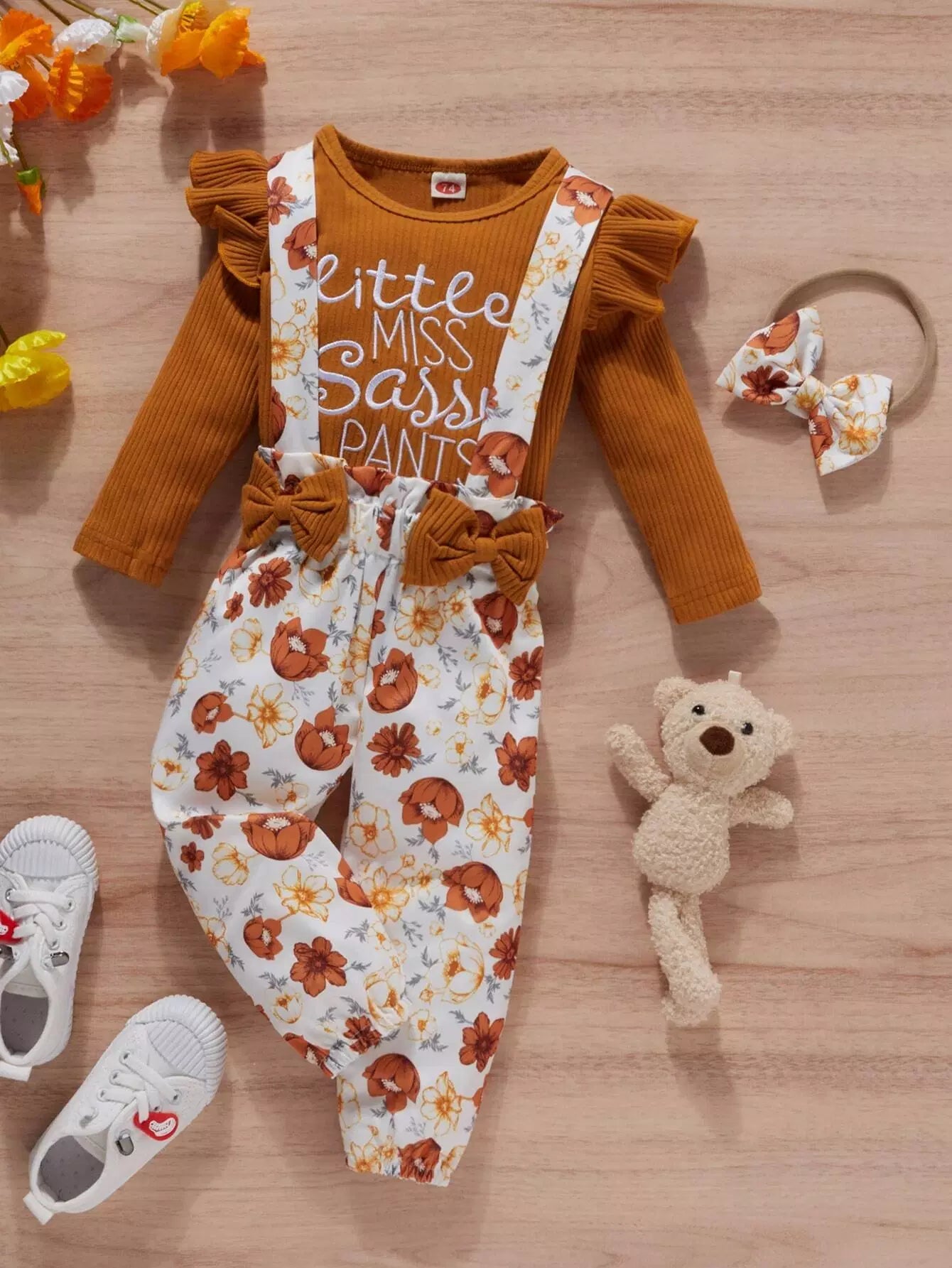 بلوزة بحواف كشكش مطرزة بحروف حروف طفولية وأفرول مزين بعقدة أمامية بطبعة زهور مع عصابة للرأس