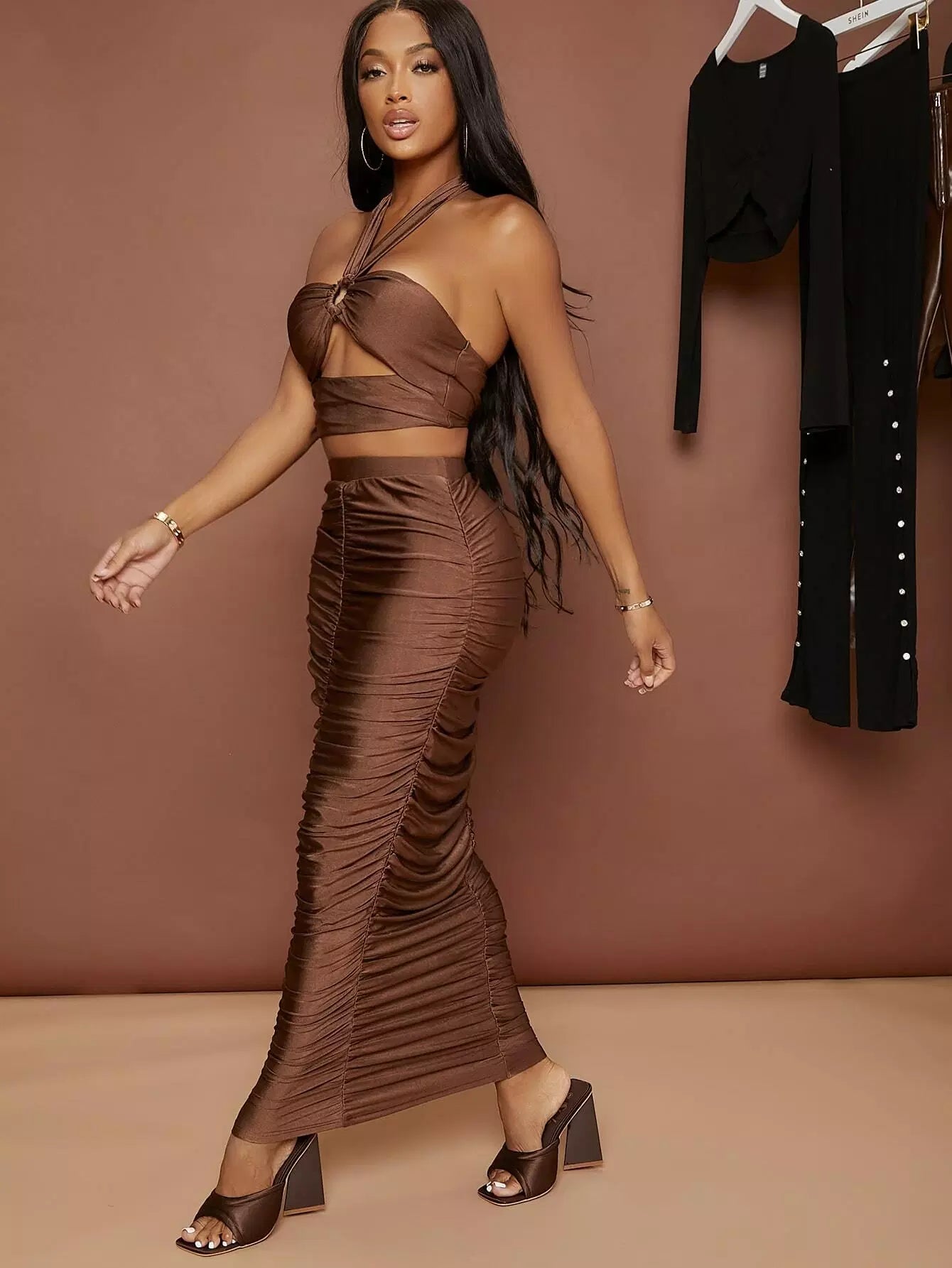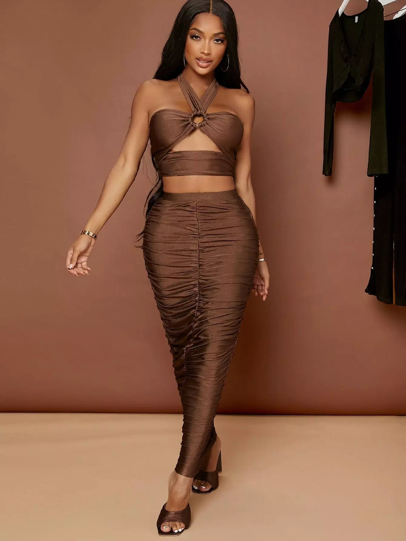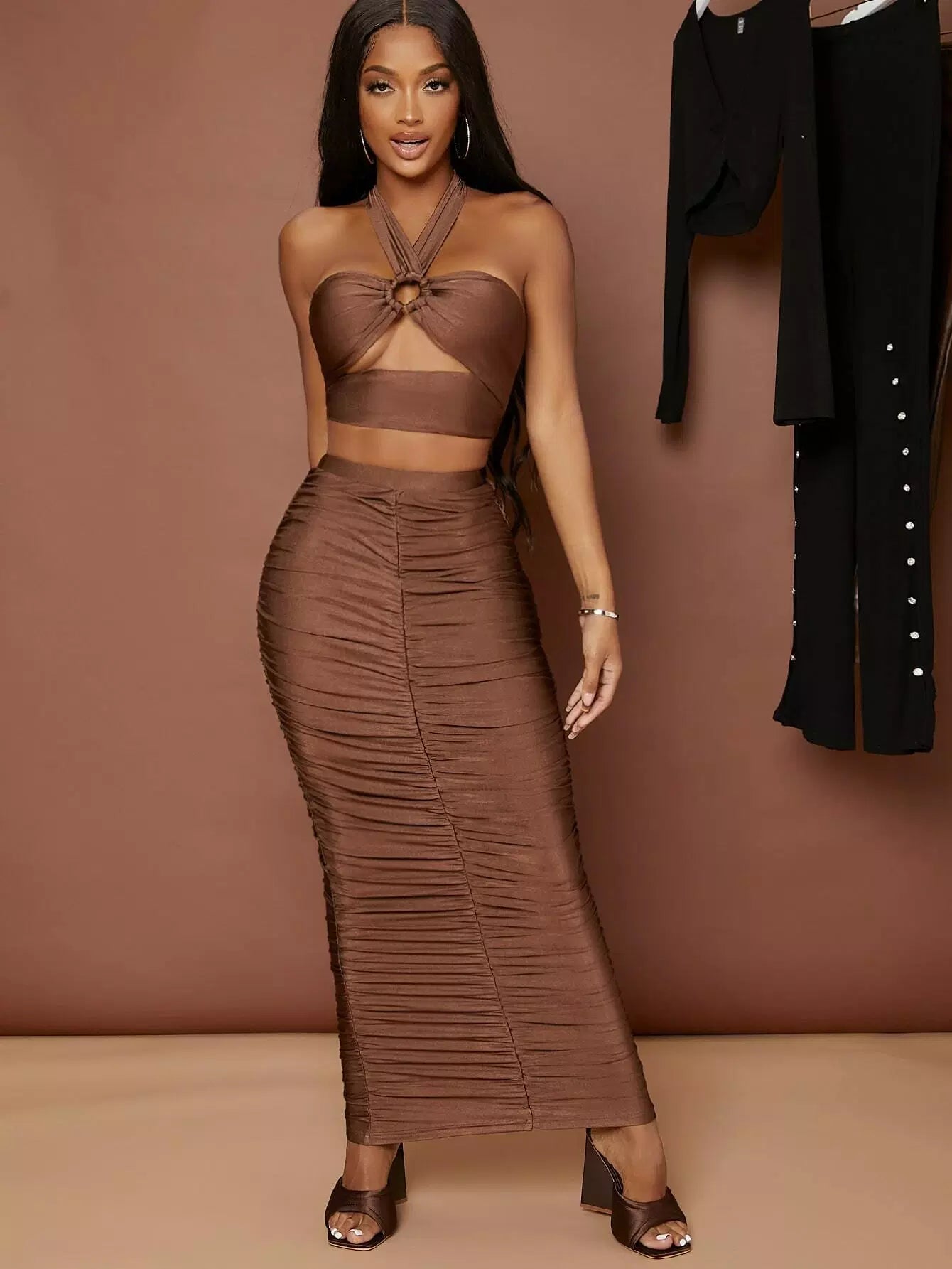 بلوزة بفتحة على شكل حرف O بفتحة على شكل حرف O بدون ظهر وتنورة مكشكشة