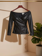 بلوزة أنيقة وجذابة من الجلد الصناعي الأسود المطاطي للنساء من BAE، بمقاسات كبيرة، بأكمام طويلة مكشوفة الكتفين.